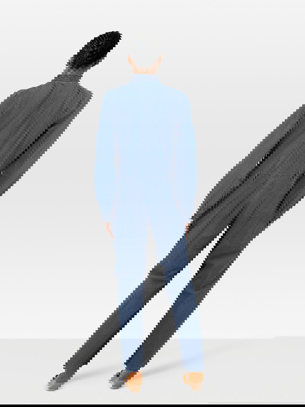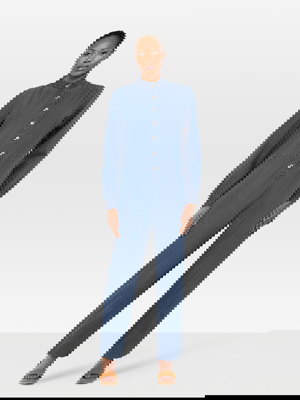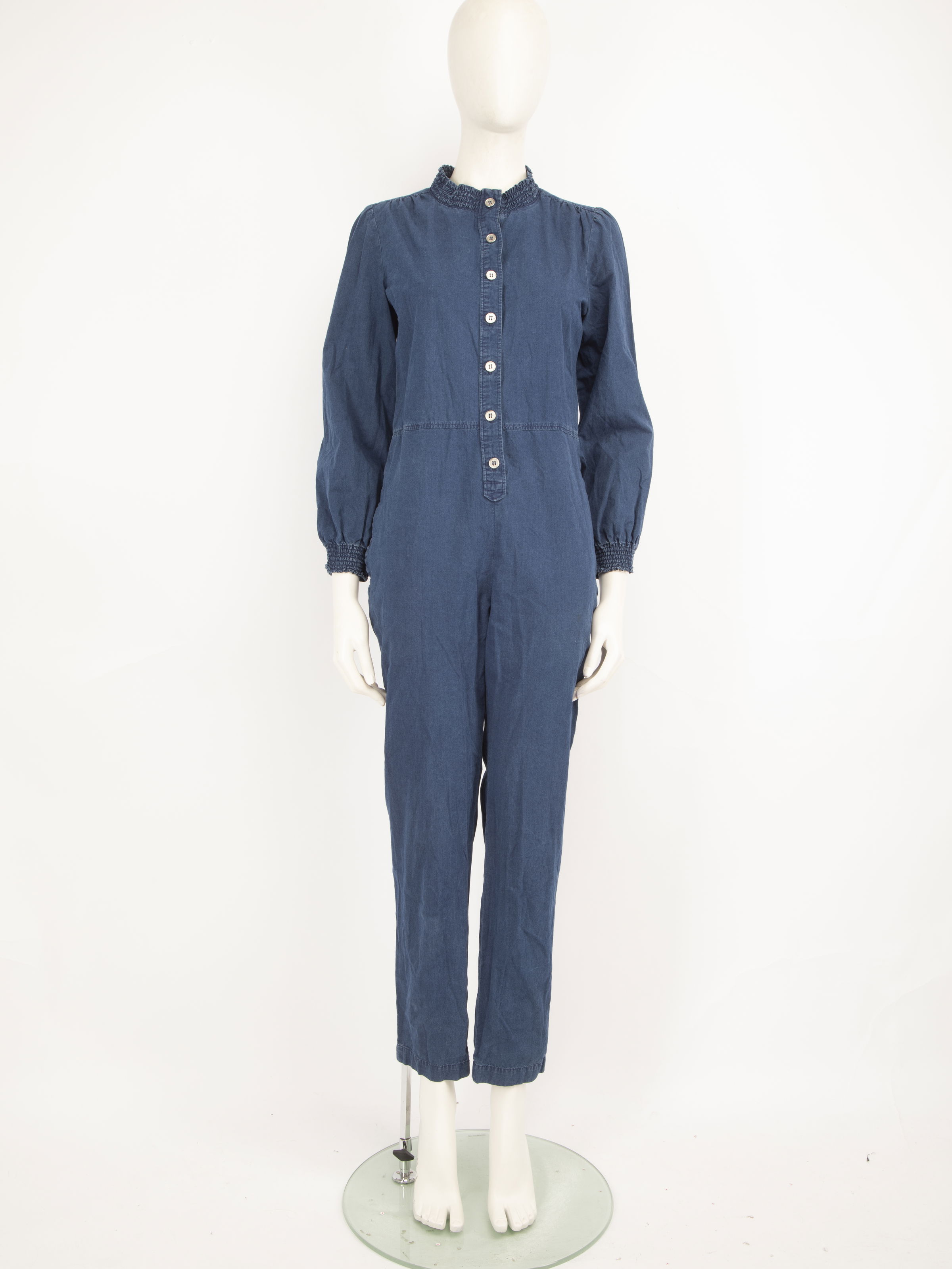 Blue denim jumpsuit in excellent, pre-worn condition. Elasticated collar, belted, button fastening, two side pockets. Composition: 100% cotton. Measurements: shoulder: 34.5cm, sleeves: 54.5cm, bust: 48.5cm, waist: 40.5cm, hip: 45.5cm, inseam: 72.5cm, length: 141cm.
