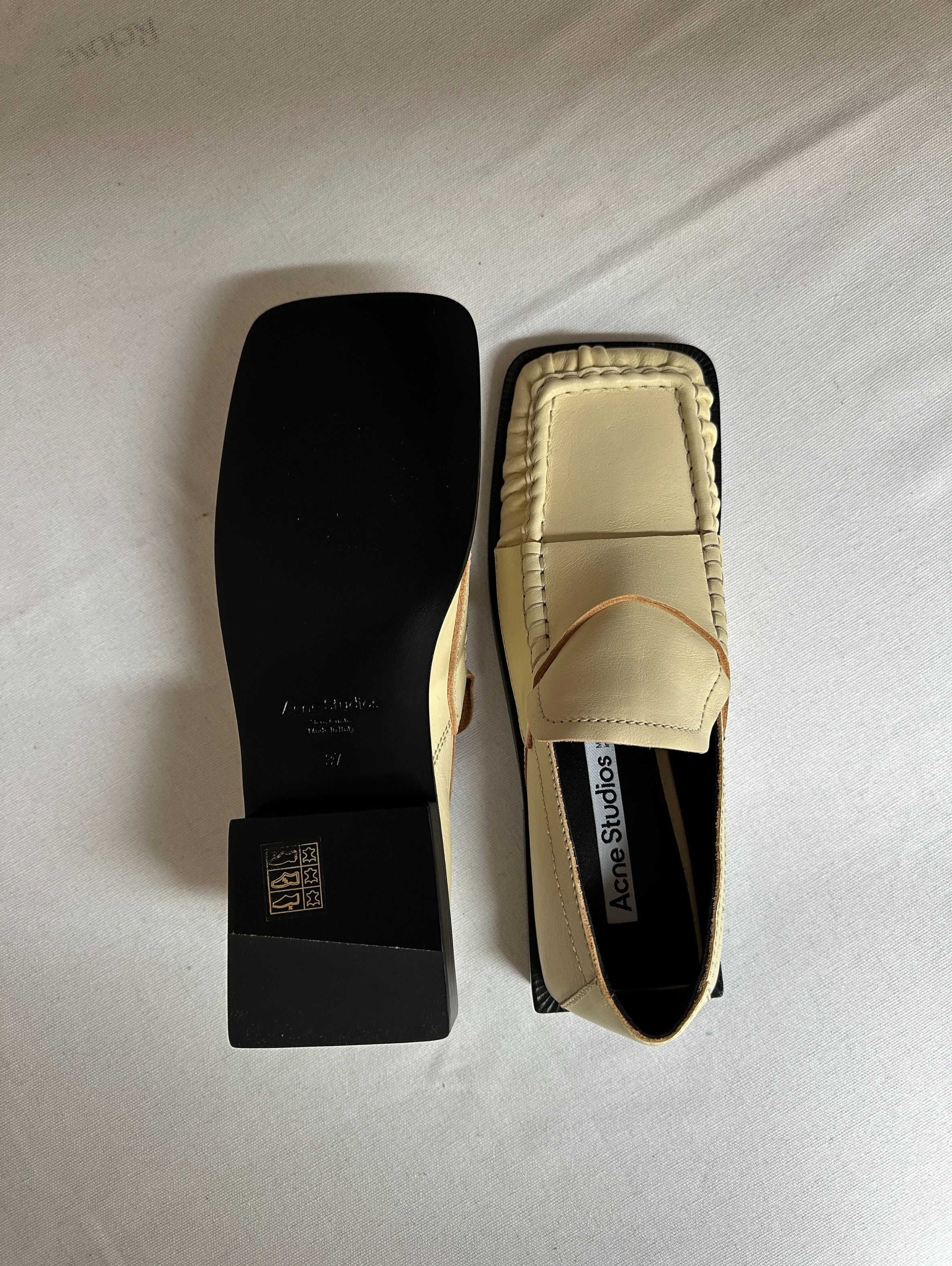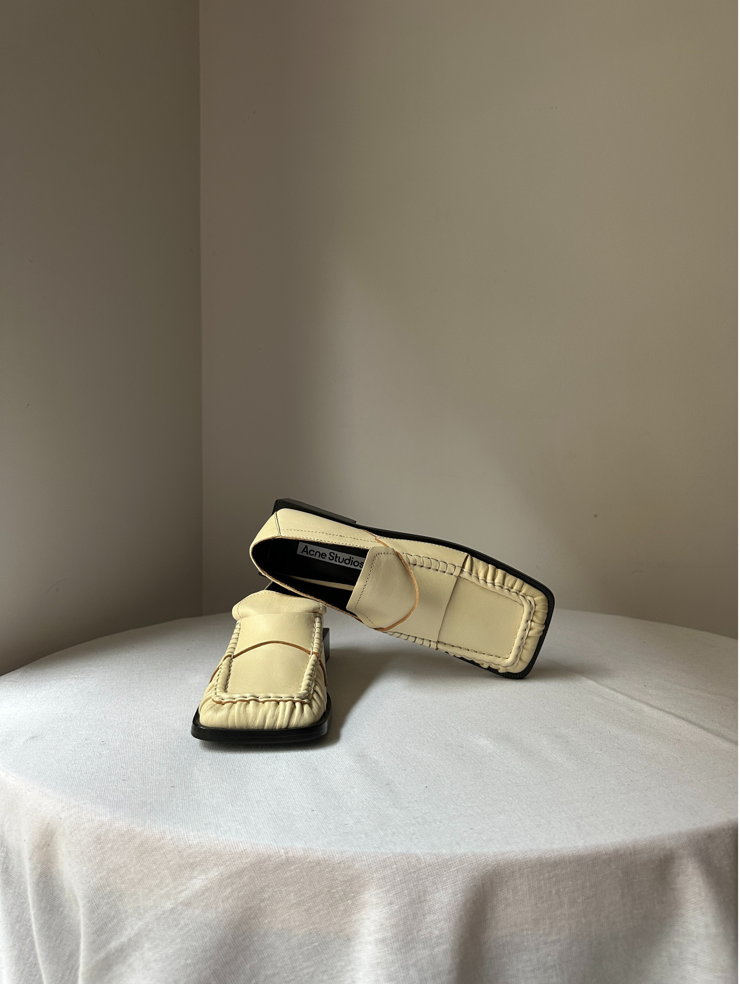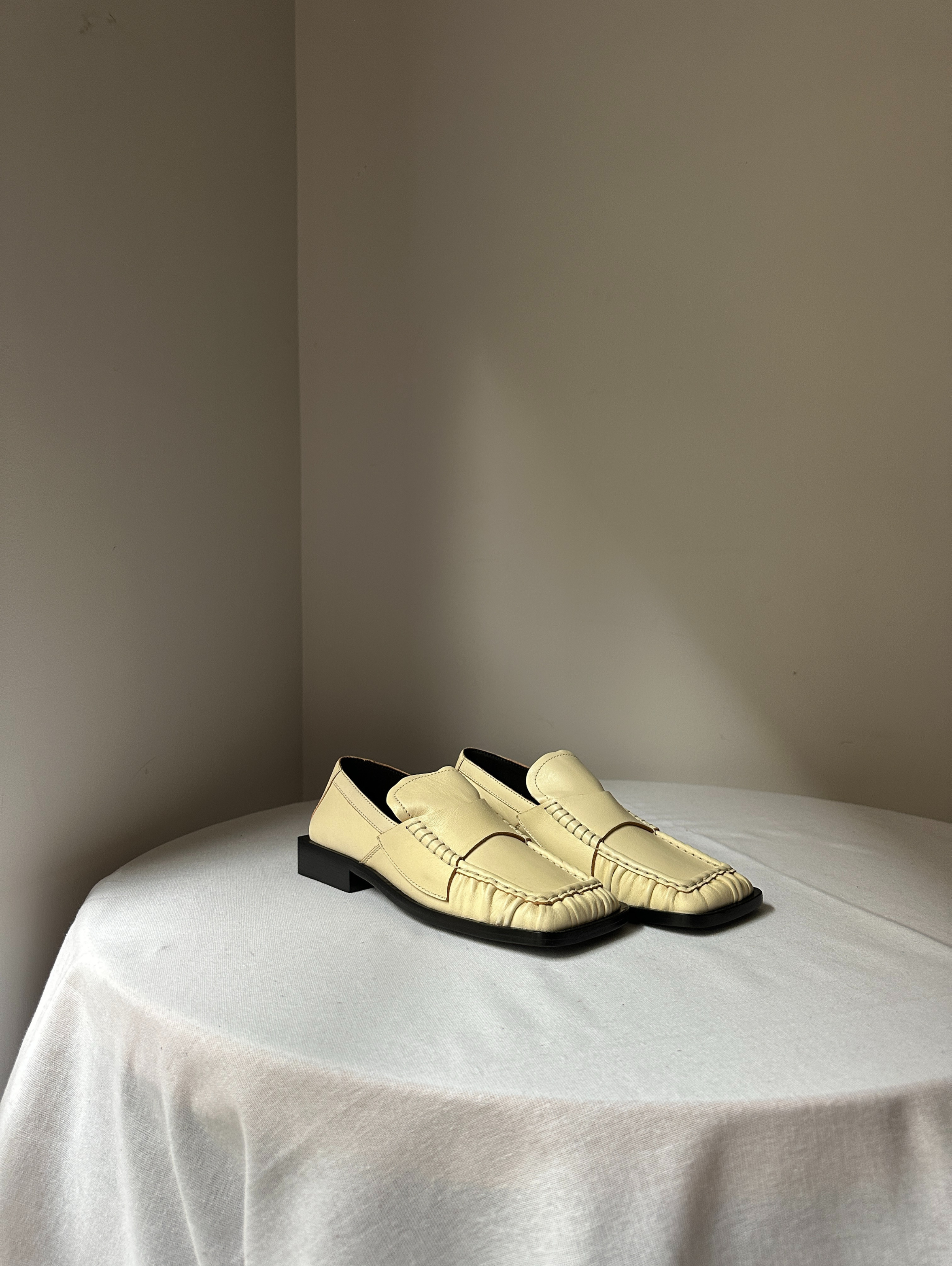These loafers are characterised by a prominent square toe, meticulous stitching/ruched detail along the apron, and a low stacked block heel.Square-toe Bladie loafers in cream-white calf leather.