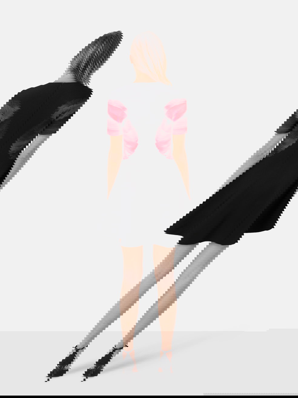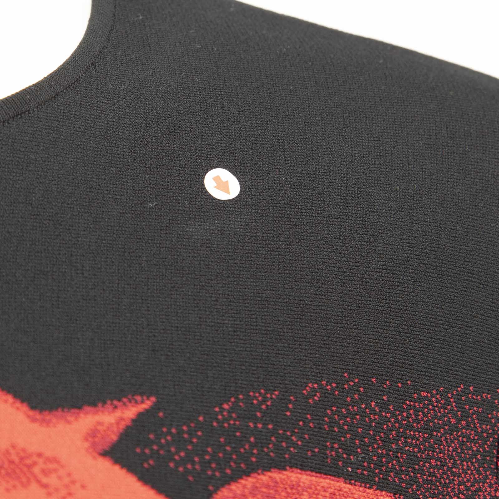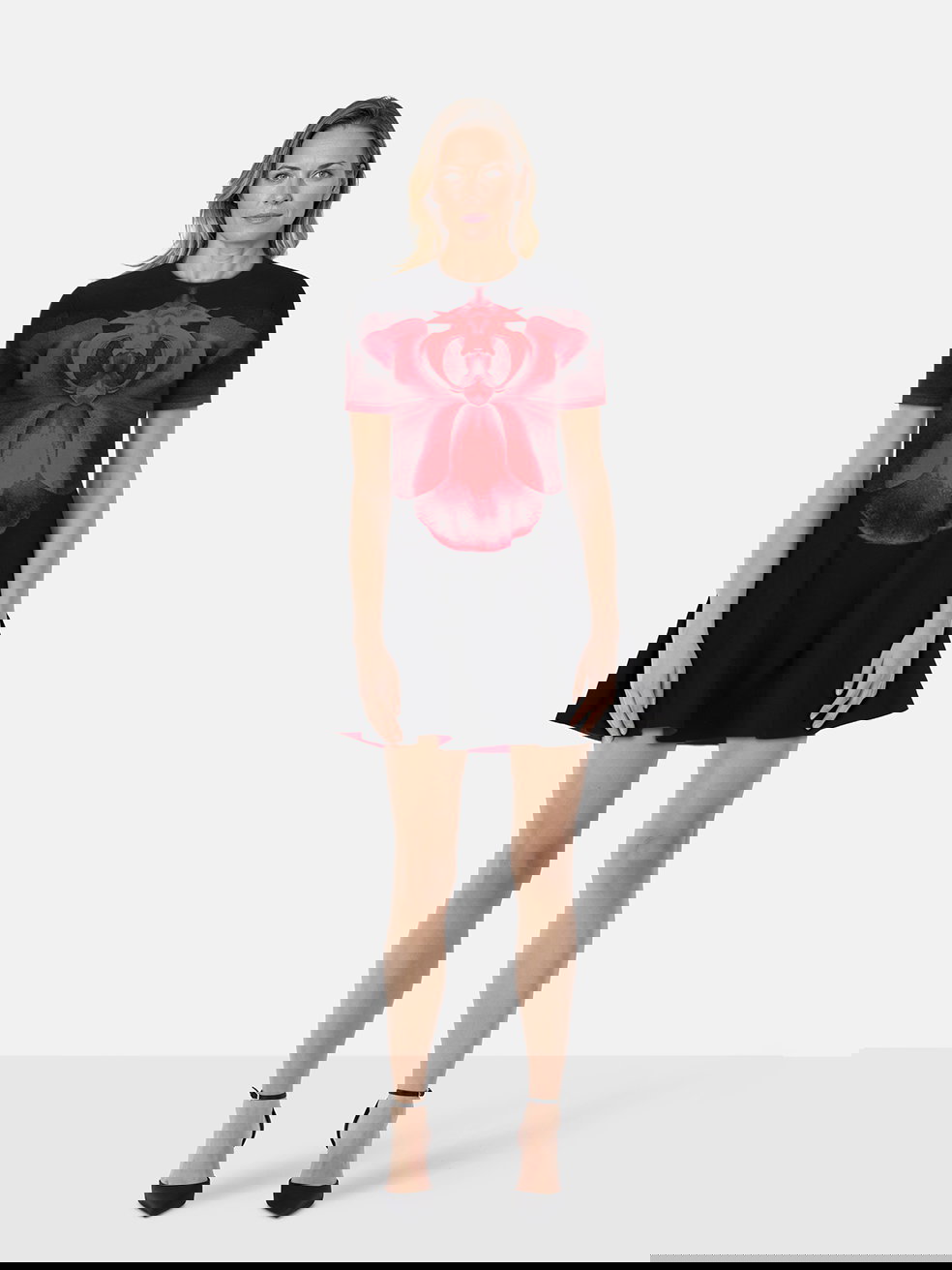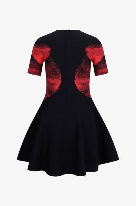 Dance the night away in this mini dress by Alexander McQUEEN. Ultra-feminine, it has a fitted cut to the waist and flares out beautifully from the hips. Its stretch viscose jacquard knit is embellished with a red-on-black XXL orchid. The dress has short sleeves and a round neckline with a slit and button fastening at the nape of the neck. Wear yours with a pair of sock boots or pumps.