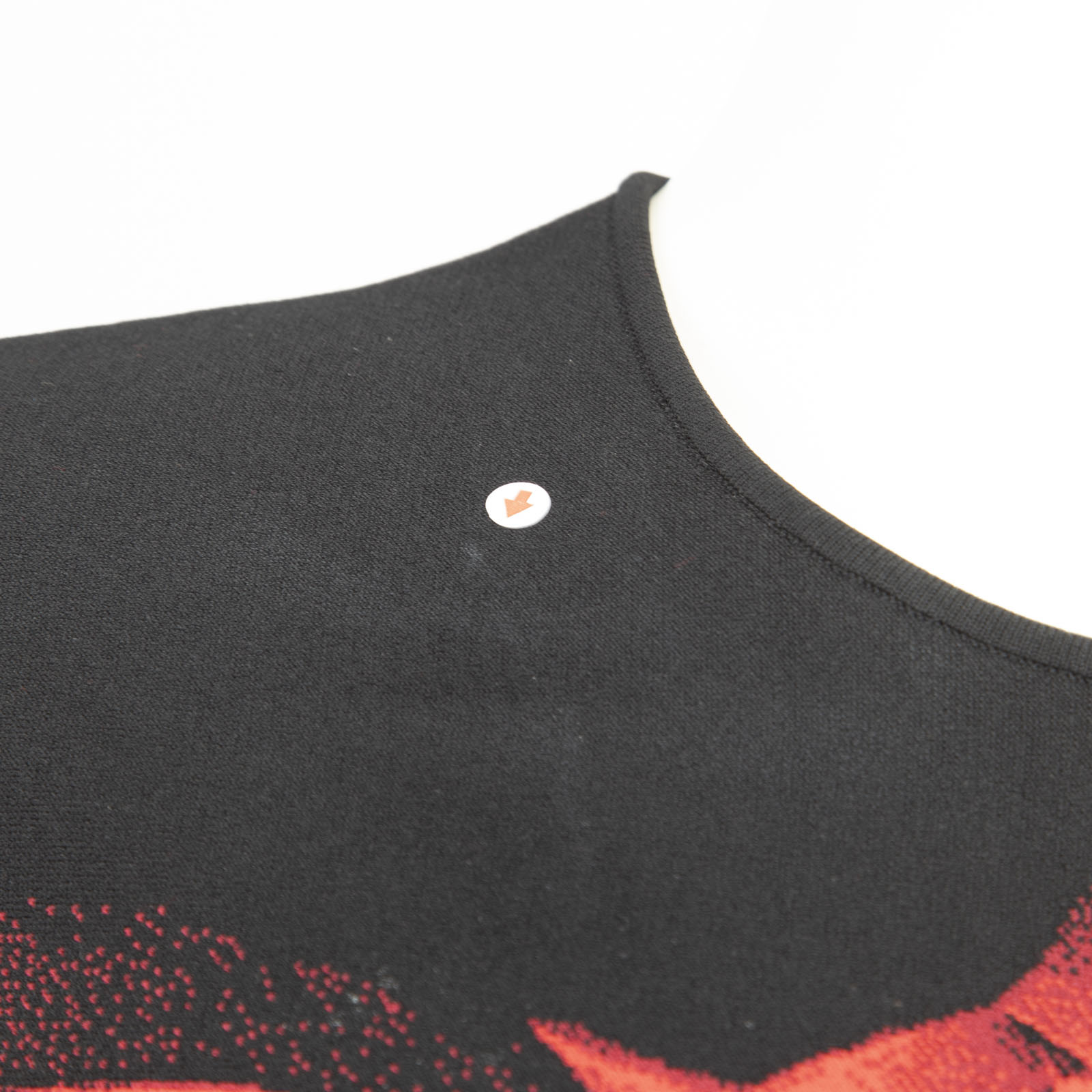 Black and red print mini dress in excellent, pre-worn condition. See images for signs of wear. Back zip and hook fastening. Composition: 81% viscose, 15% polyester, 3% polyamide, 1% elastane. Measurements: shoulder 36cm, sleeves 22cm, bust 41cm waist 32cm, hip 100cm, length 86cm. Dry clean.