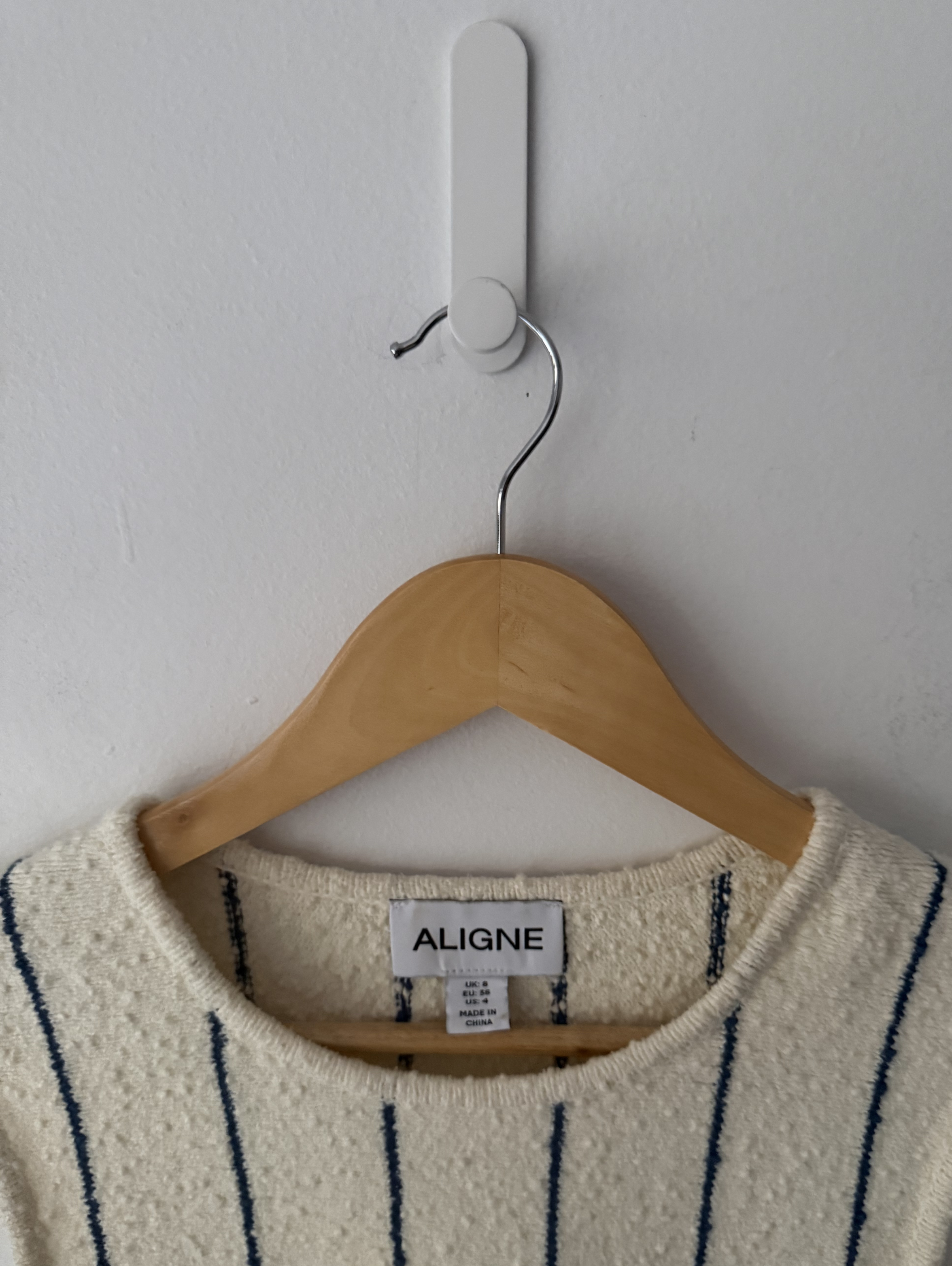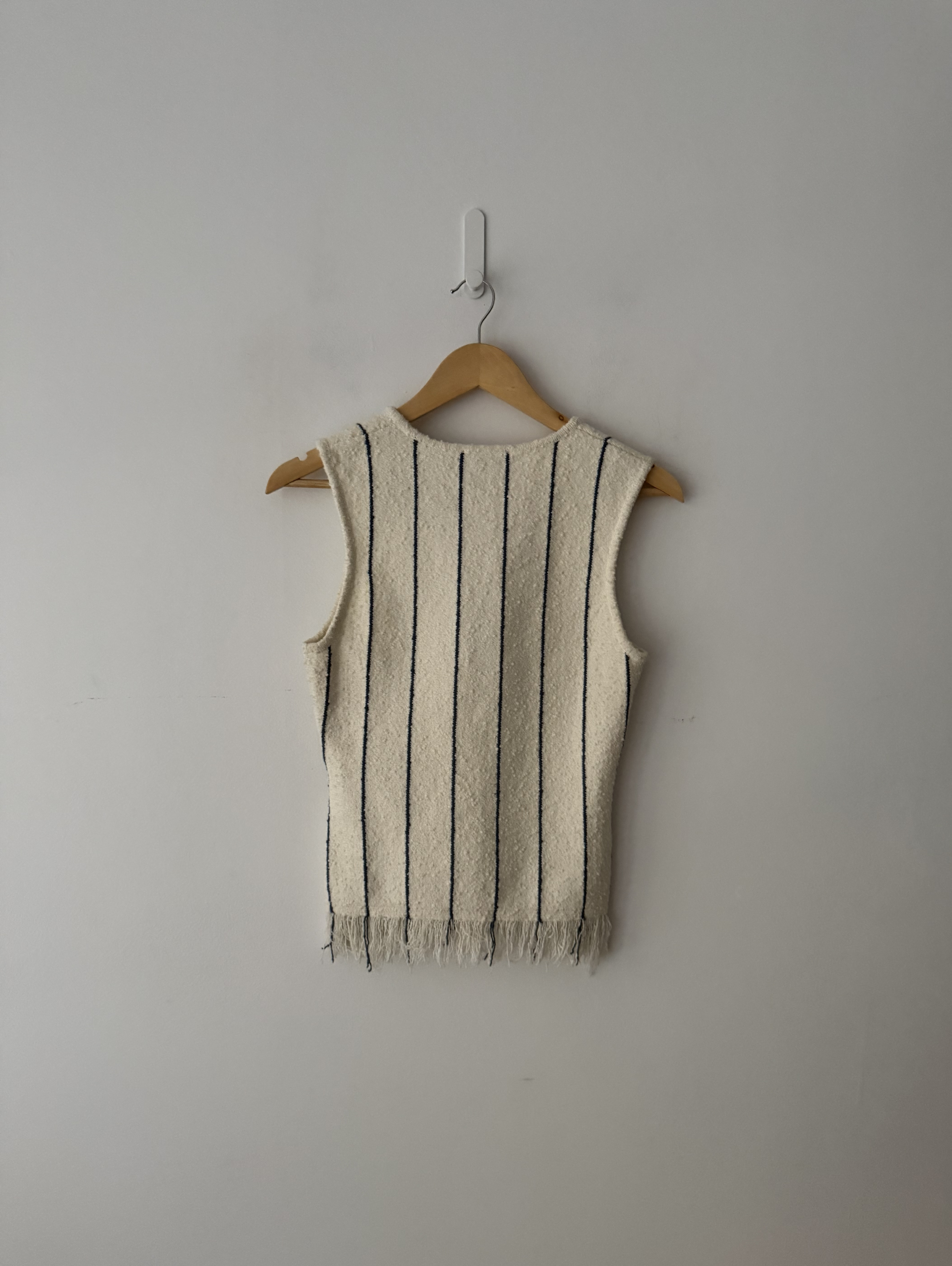 Cream bouclé top in a lightweight knit with a striped pattern and fringe hem.