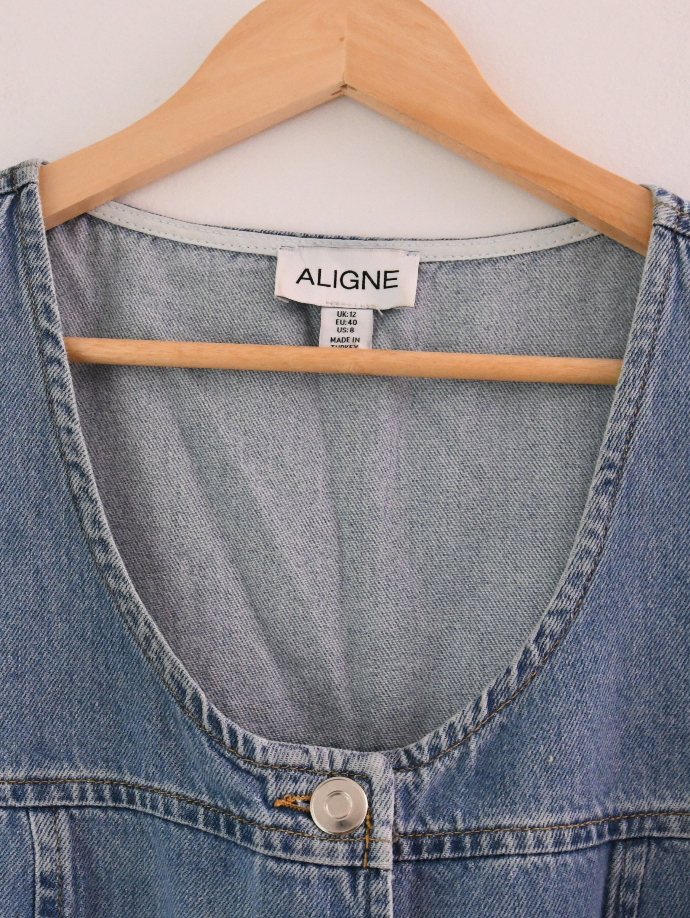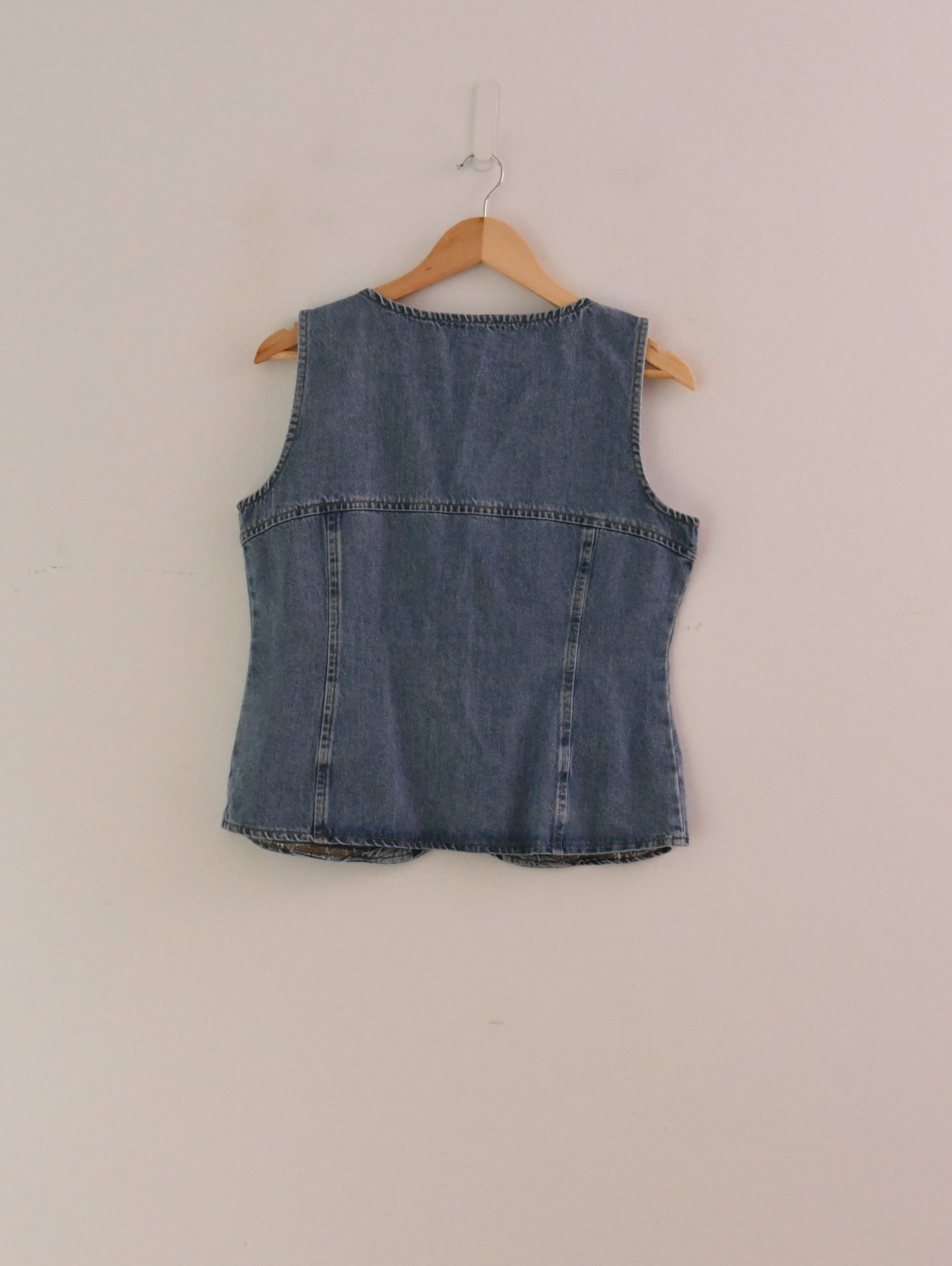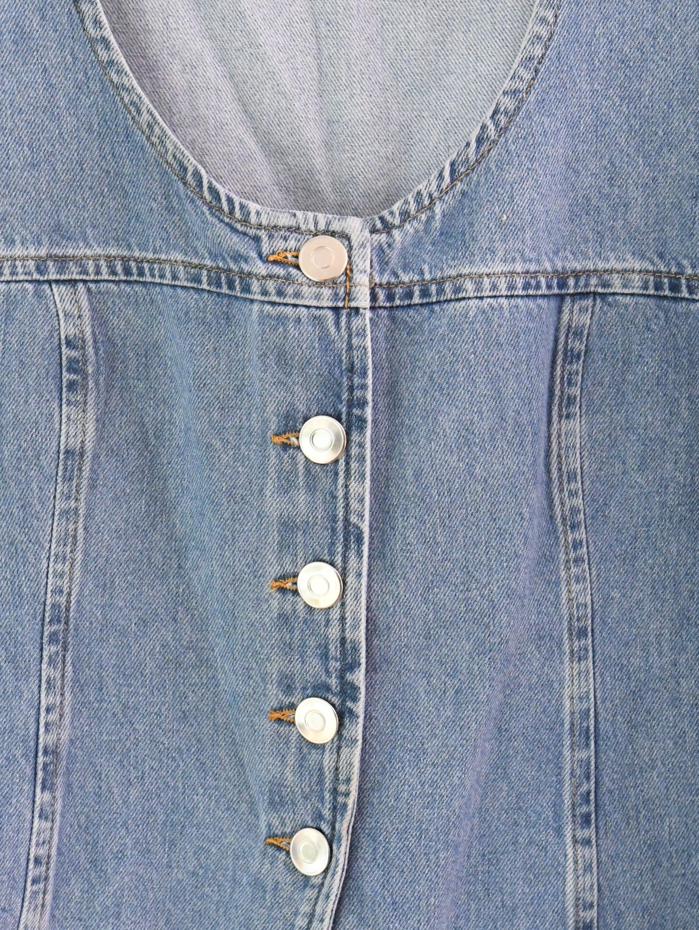 Button-up denim top with curved hem and seam design details. Scoop neck. Sleeveless. Fit true to size.