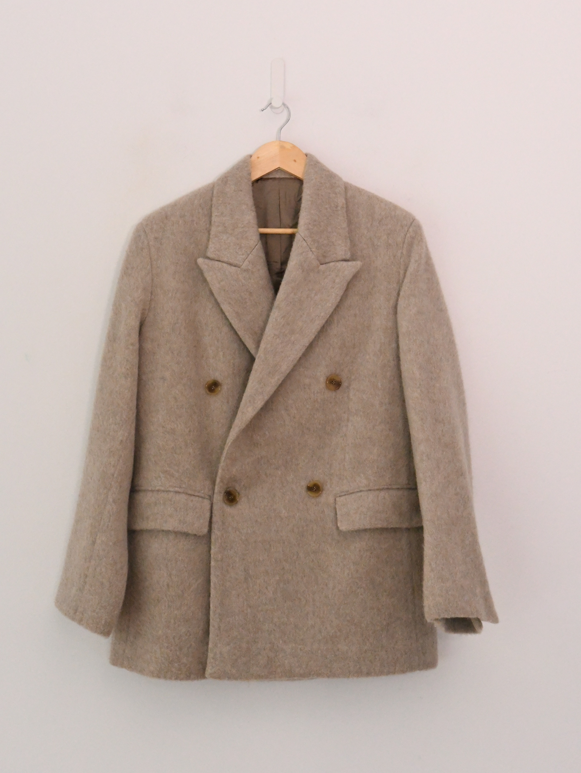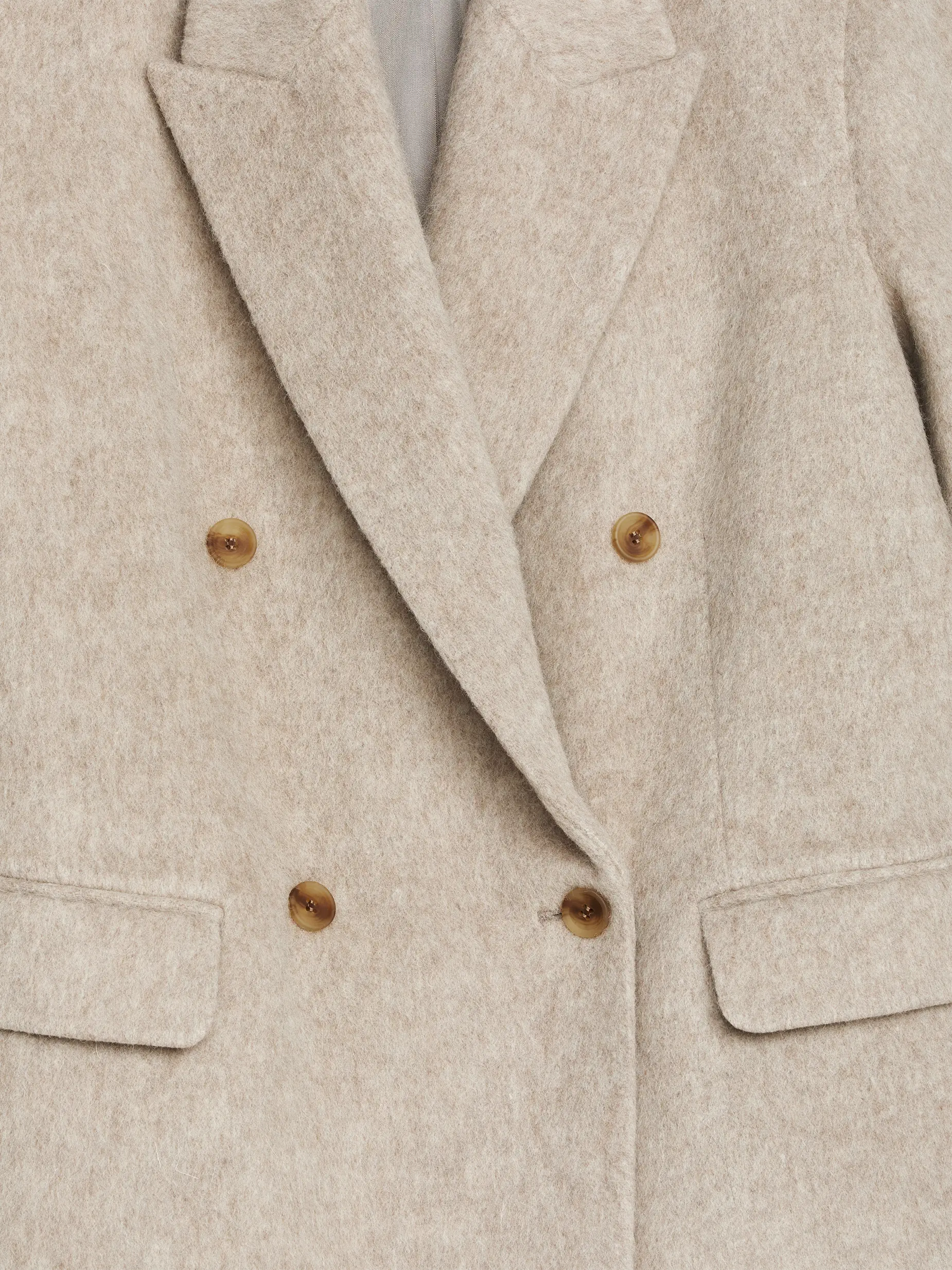 Double-breasted blazer crafted from a wool blend with a brushed surface. A fully lined style with wide lapel, welt pockets with flap at front and vent at back. Oversized fit.