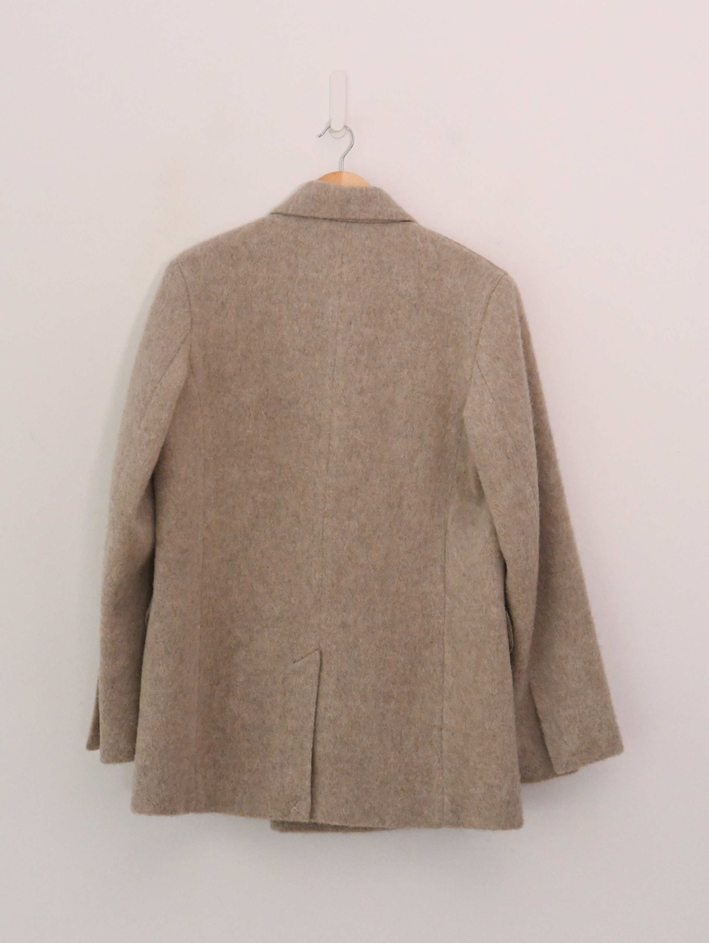 Double-breasted blazer crafted from a wool blend with a brushed surface. A fully lined style with wide lapel, welt pockets with flap at front and vent at back.
