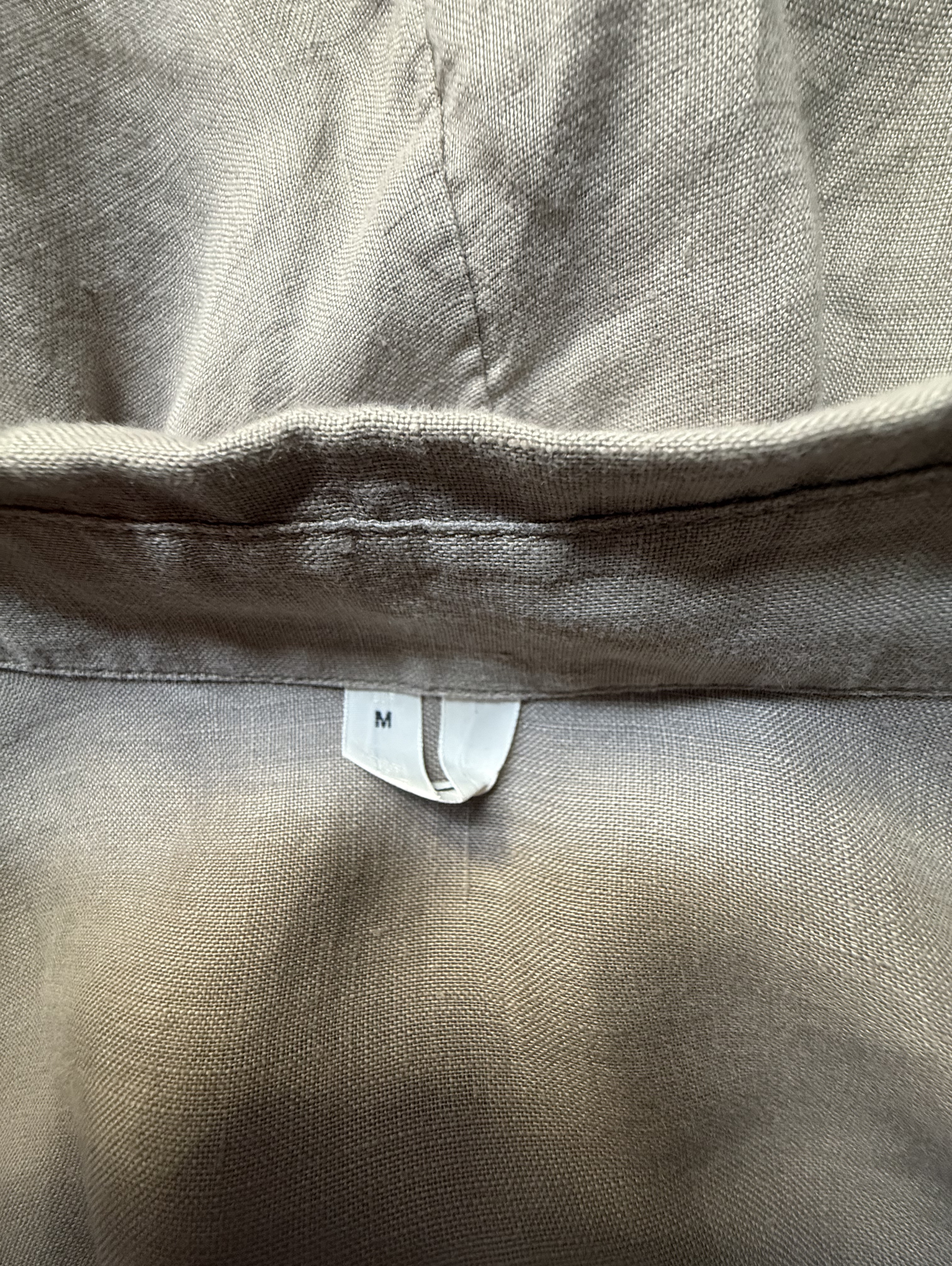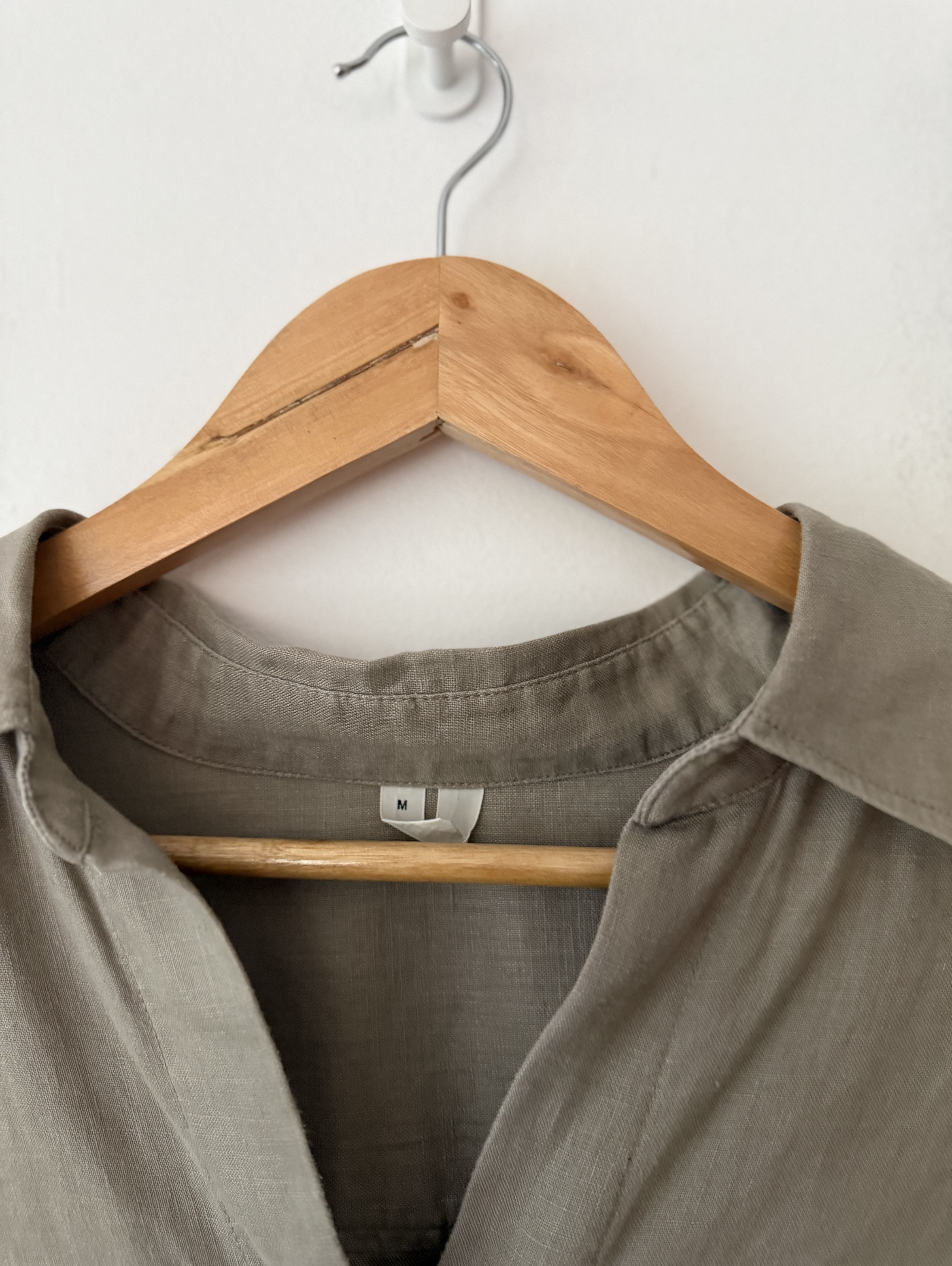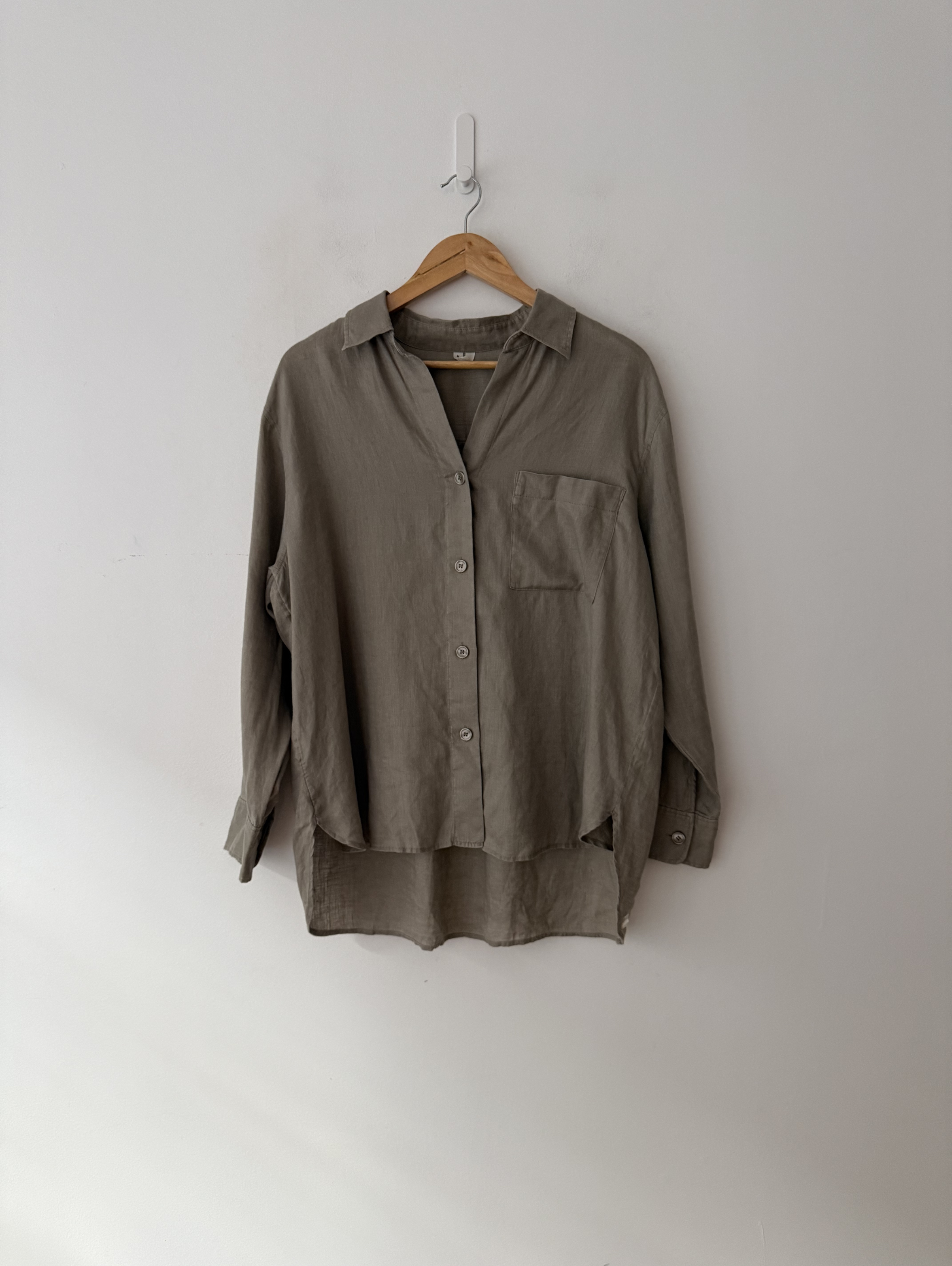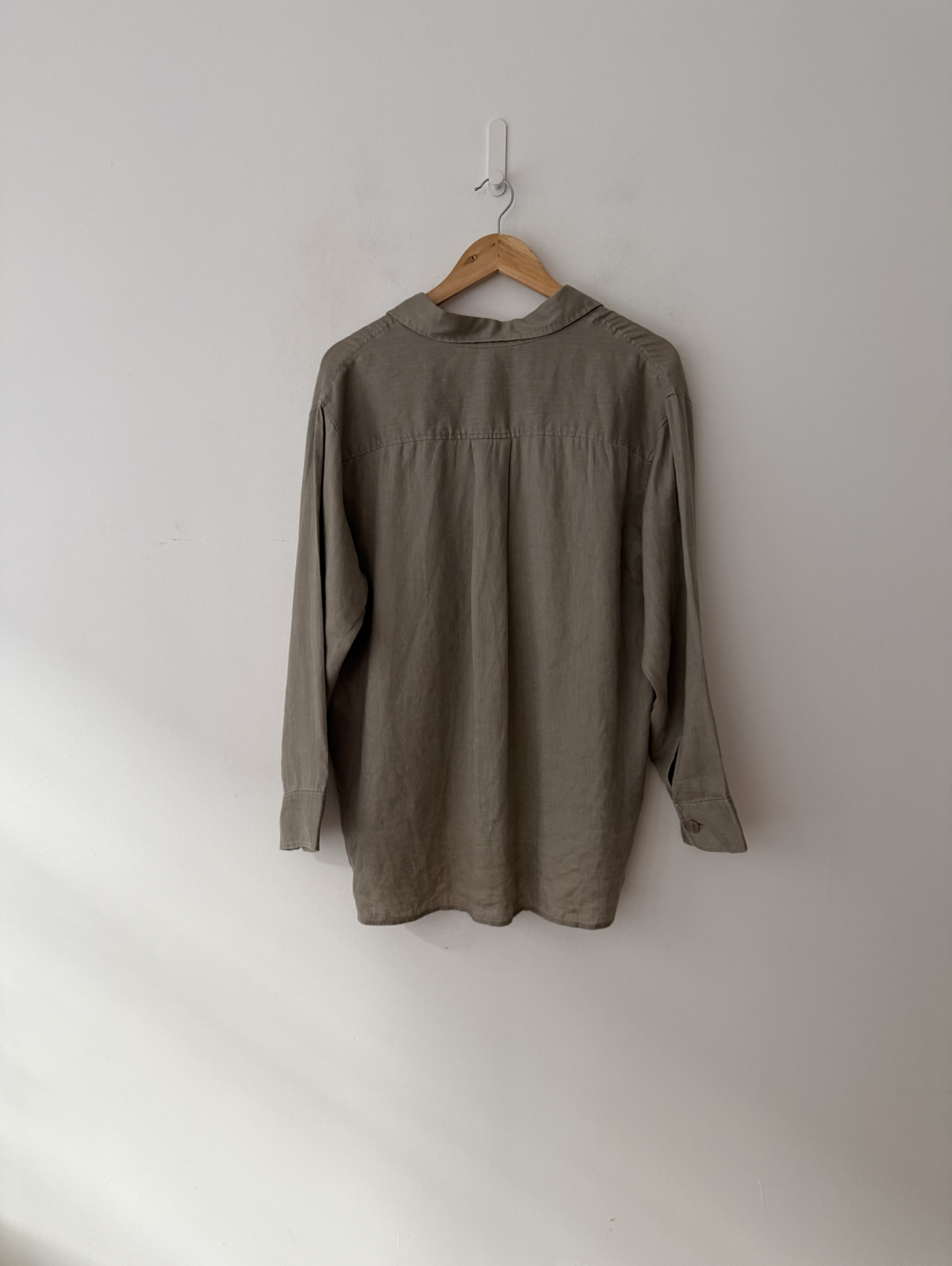 Oversized, khaki green, long-sleeve button-up shirt.