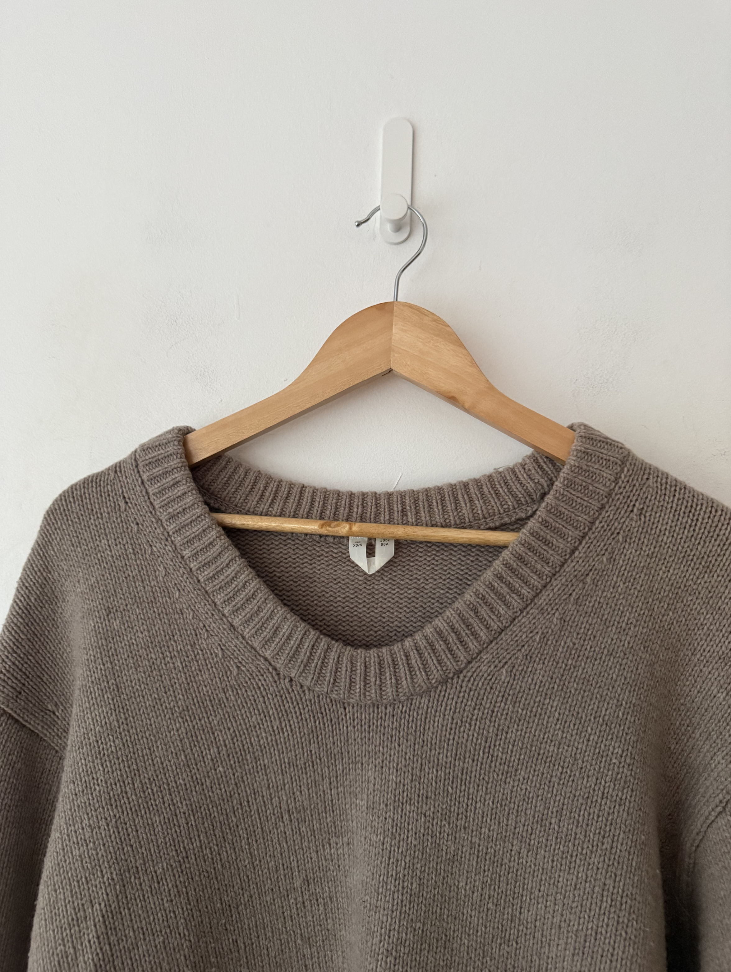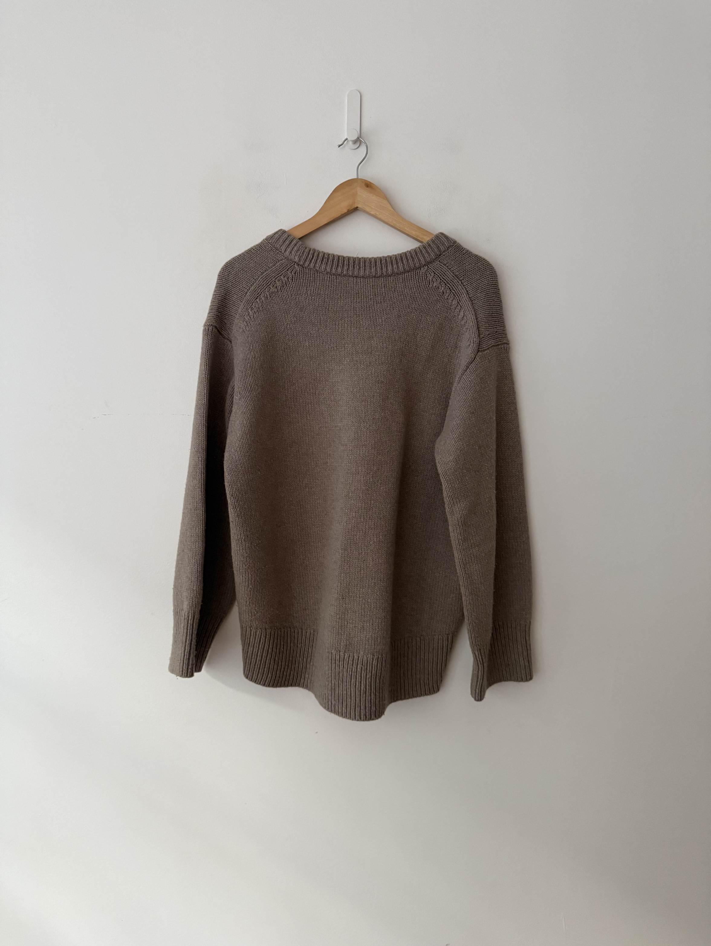 Oversized XS, tanned, ribbed crew neck knitted wool jumper.