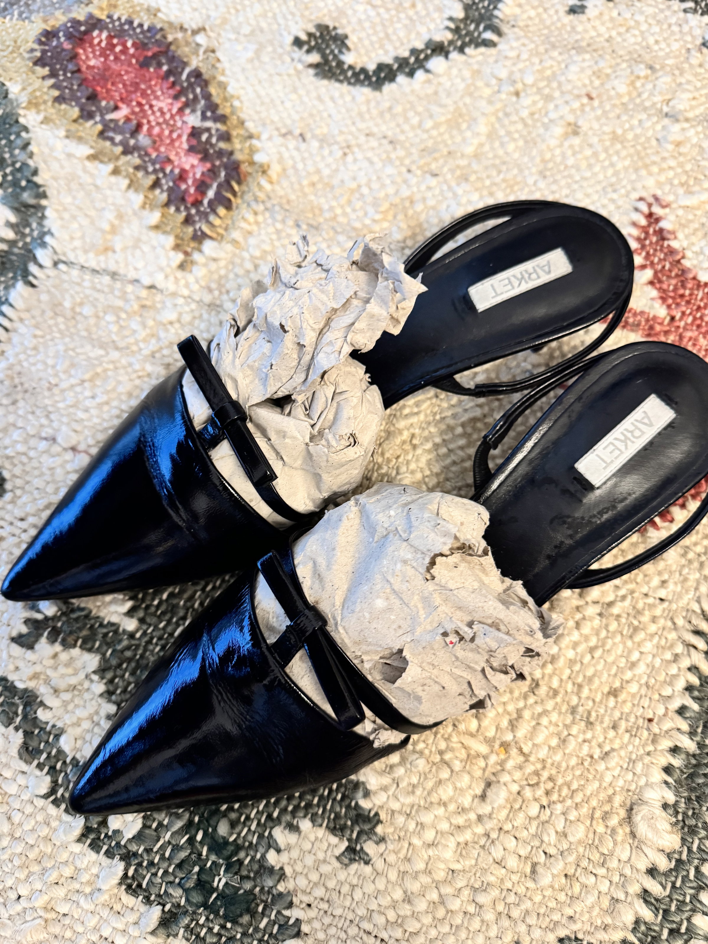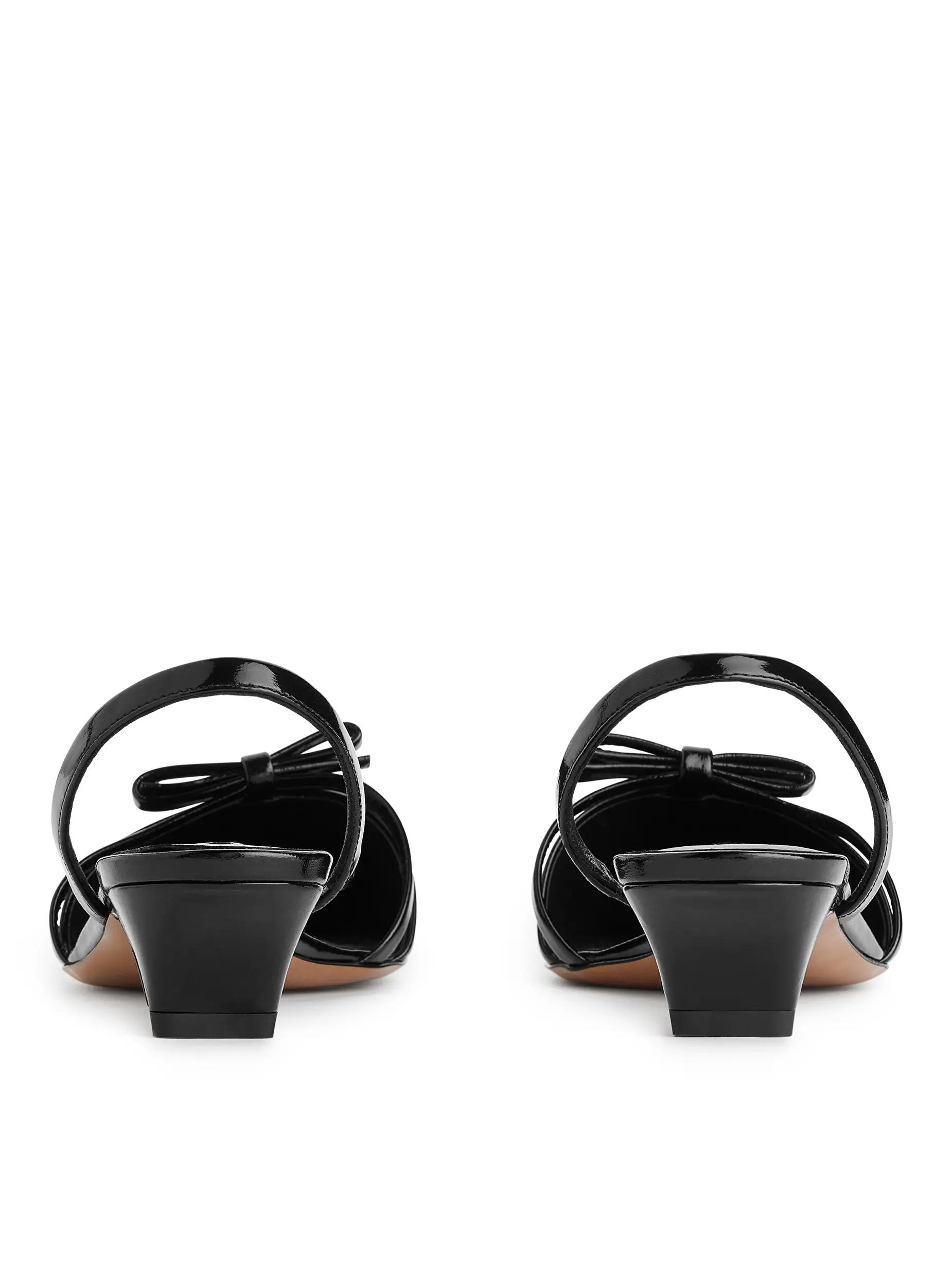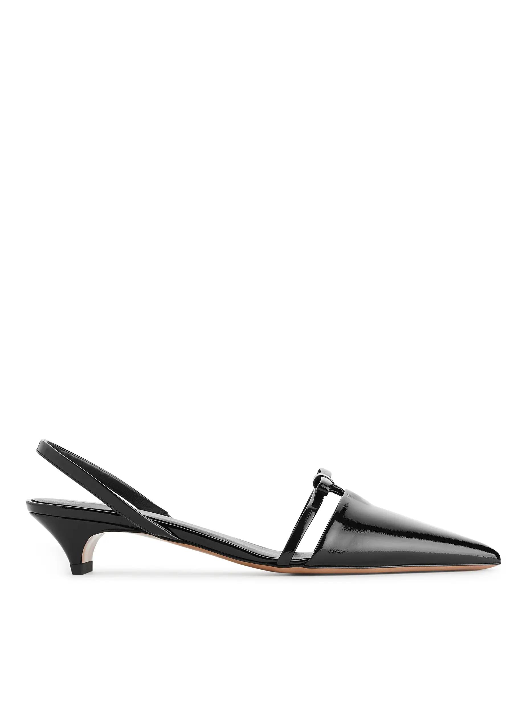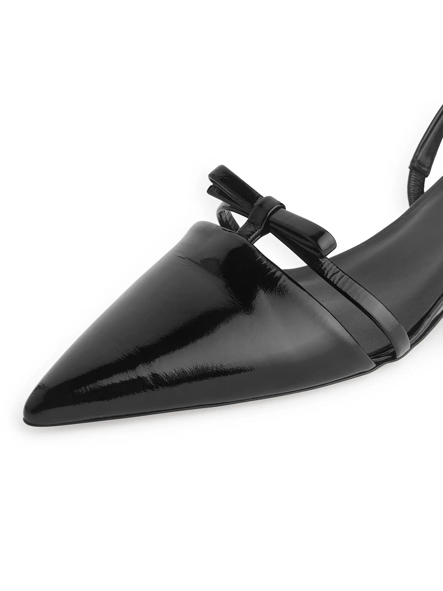 Slingback pumps in glossy chrome-free leather. Styled with low heel, pointy toe and decorative bow.