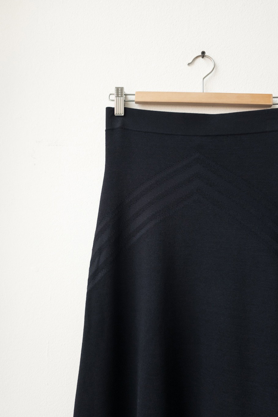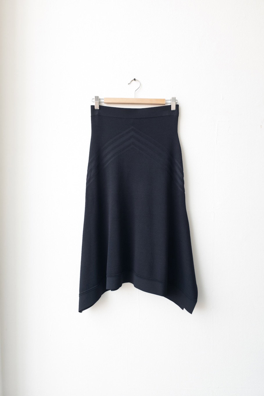 -This knitted navy skirt features an elasticated waistband and an asymmetrical hem in a stretchy material. Label Size: Size M RRP £135