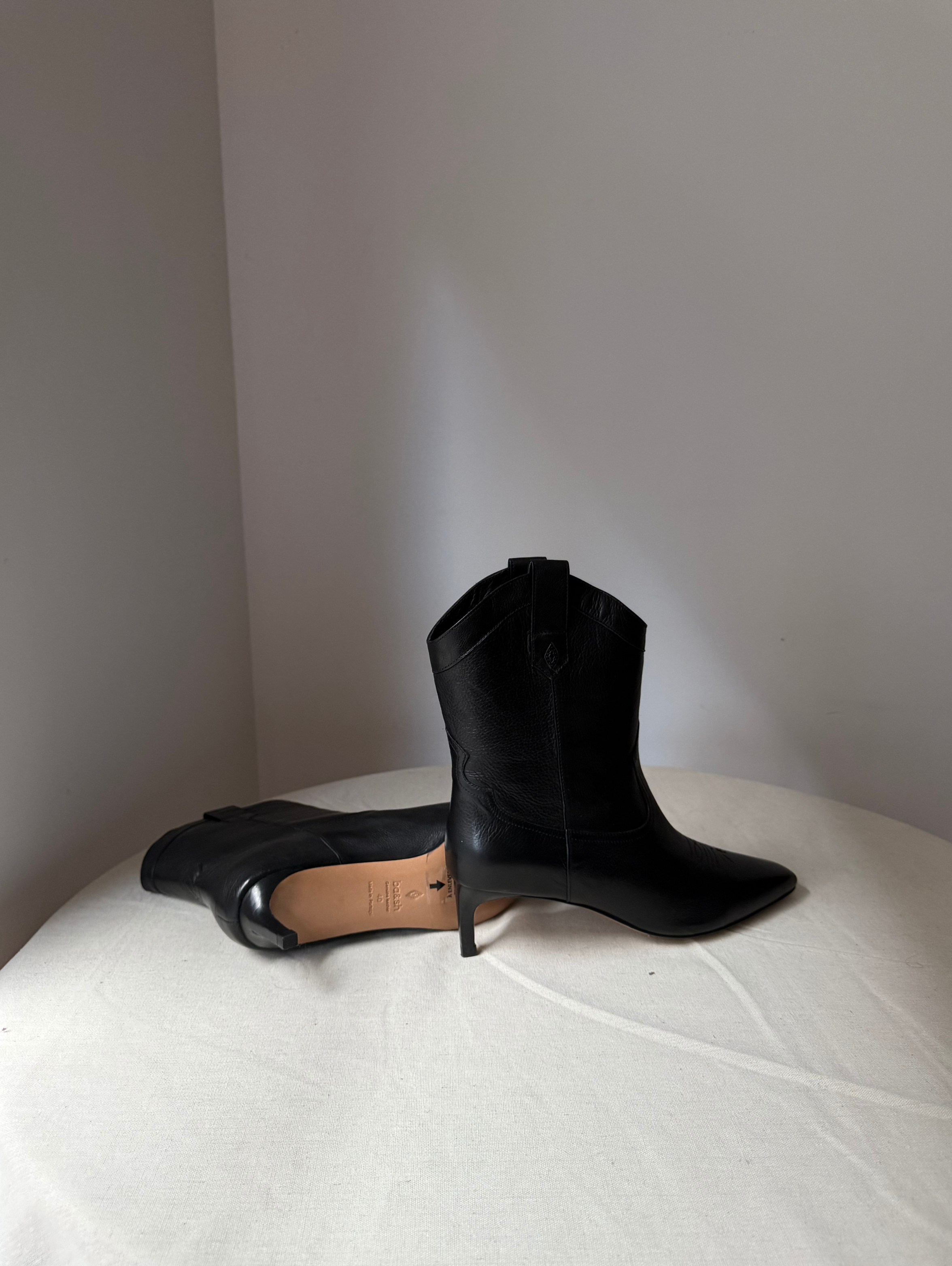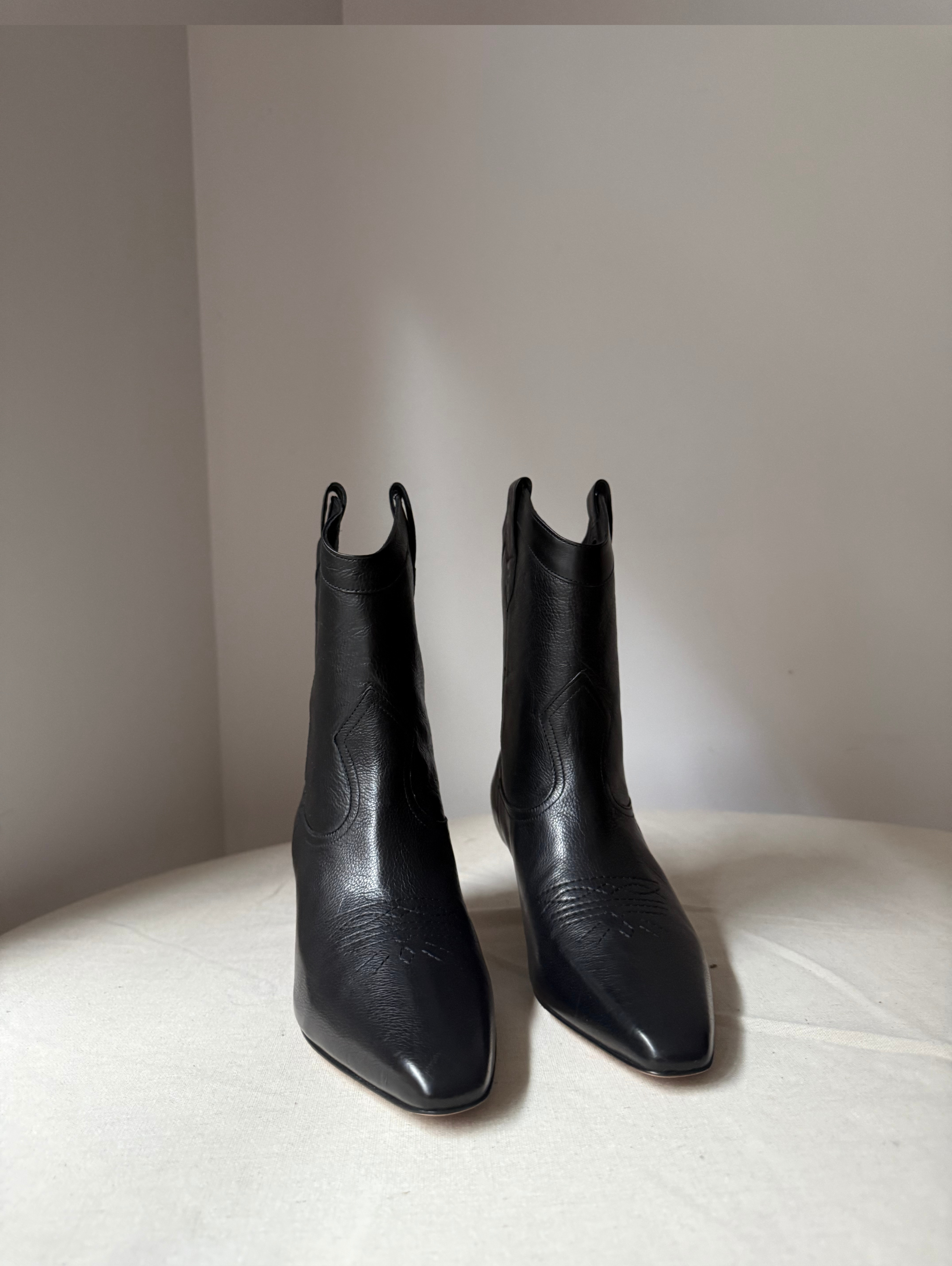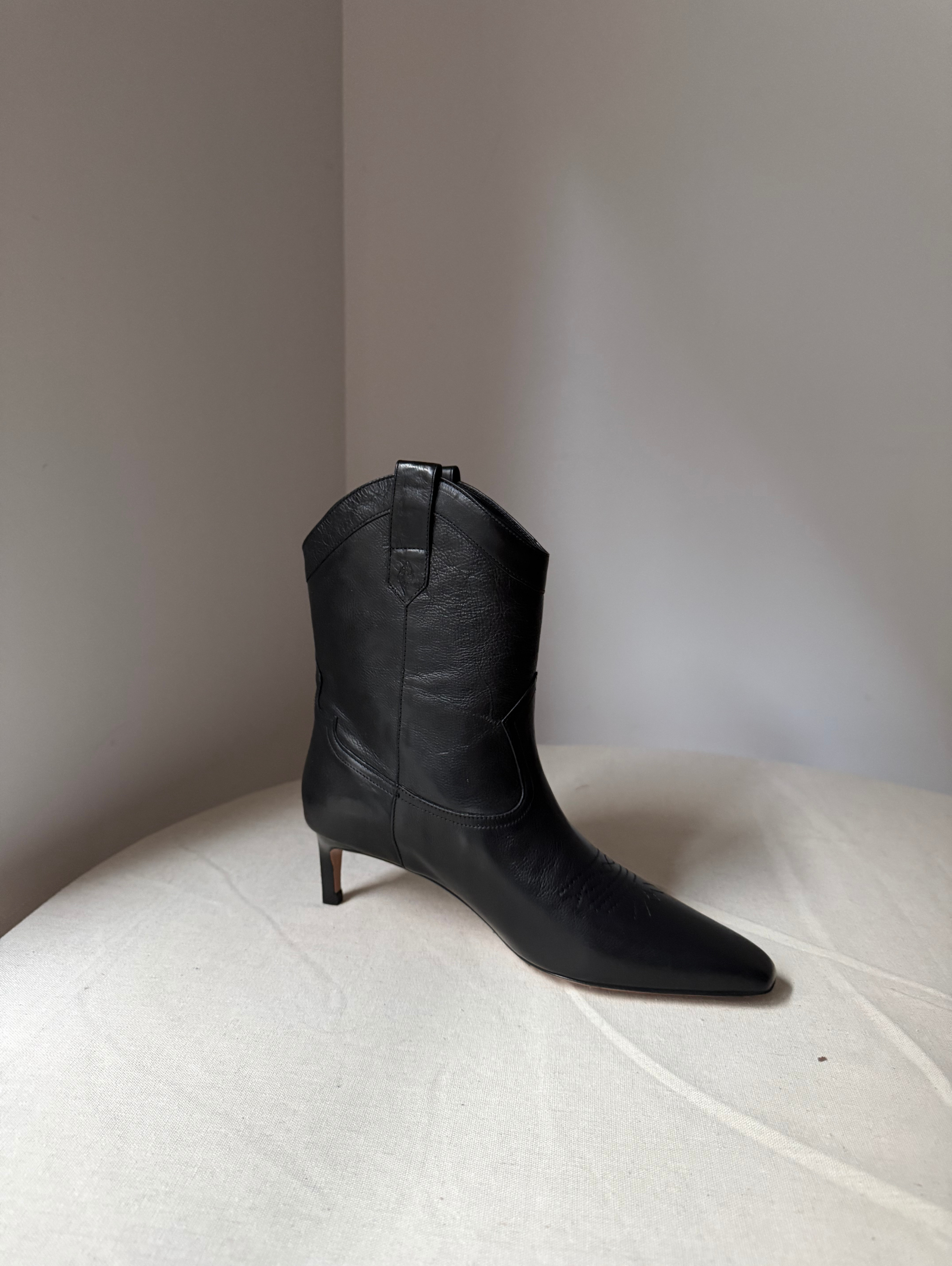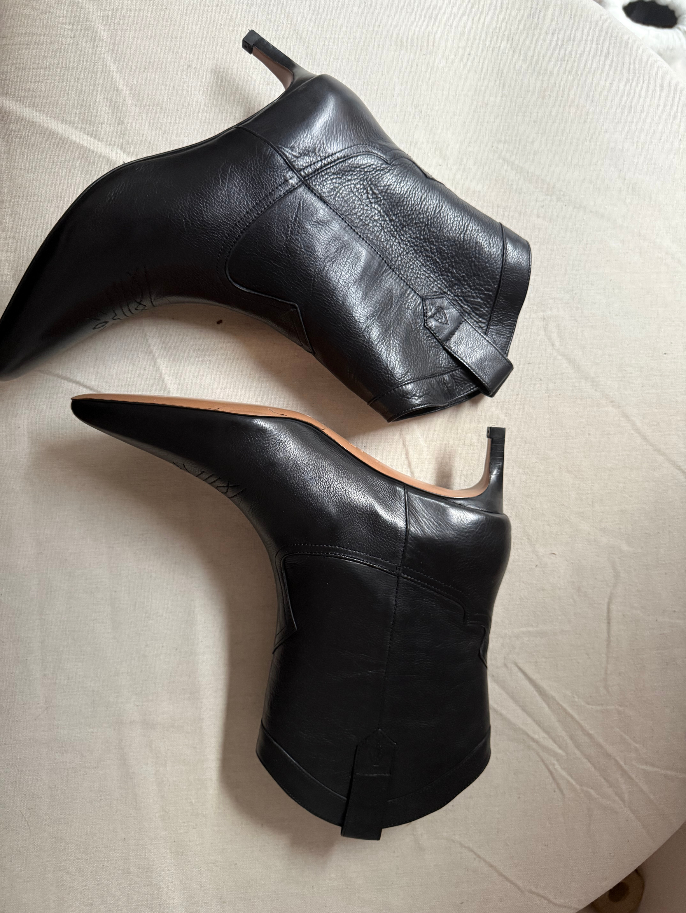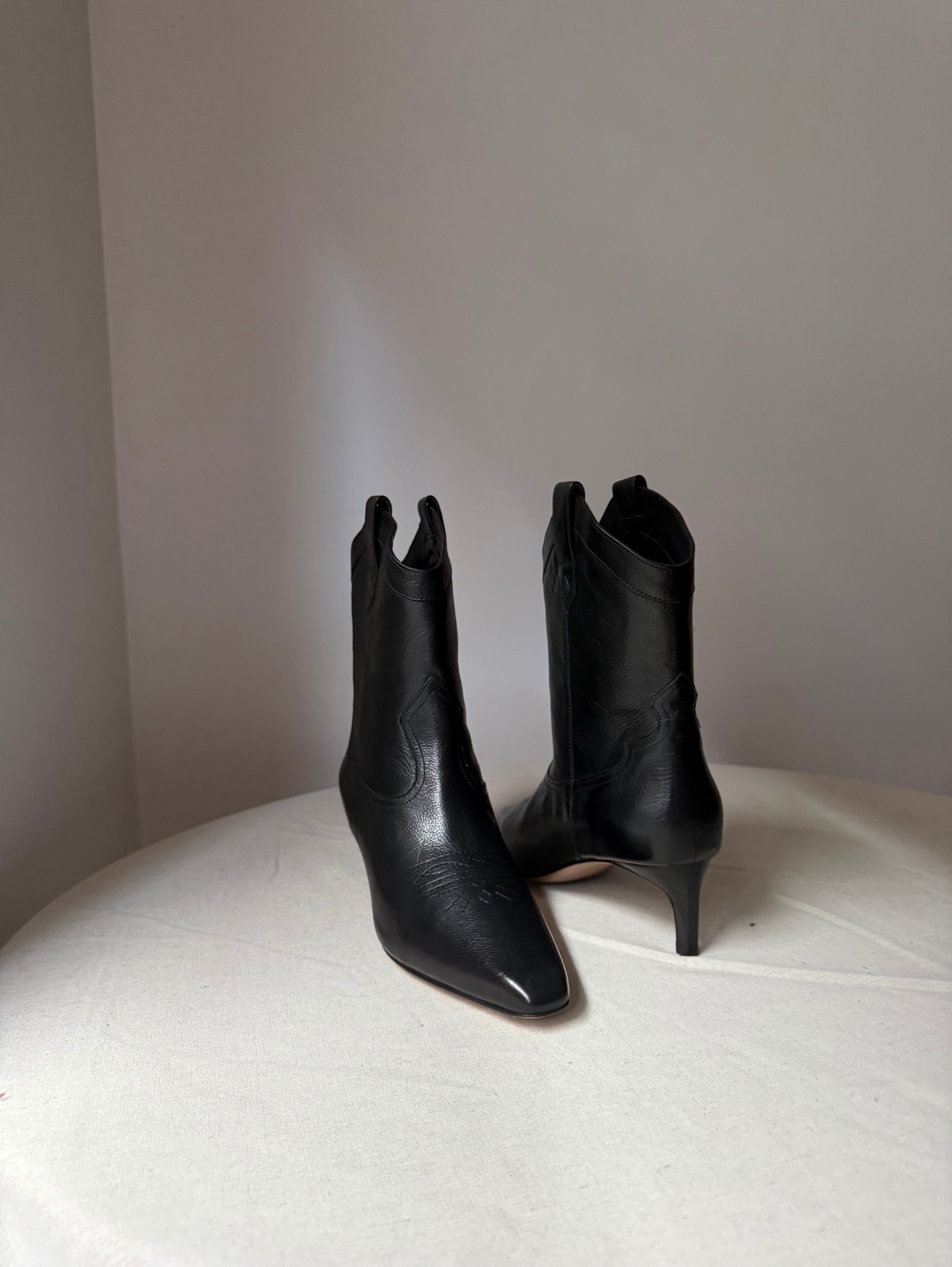 Cowboy ankle boots, leather, plain colour, brand logo, pointed toe, covered heel, leather sole, leather lining.