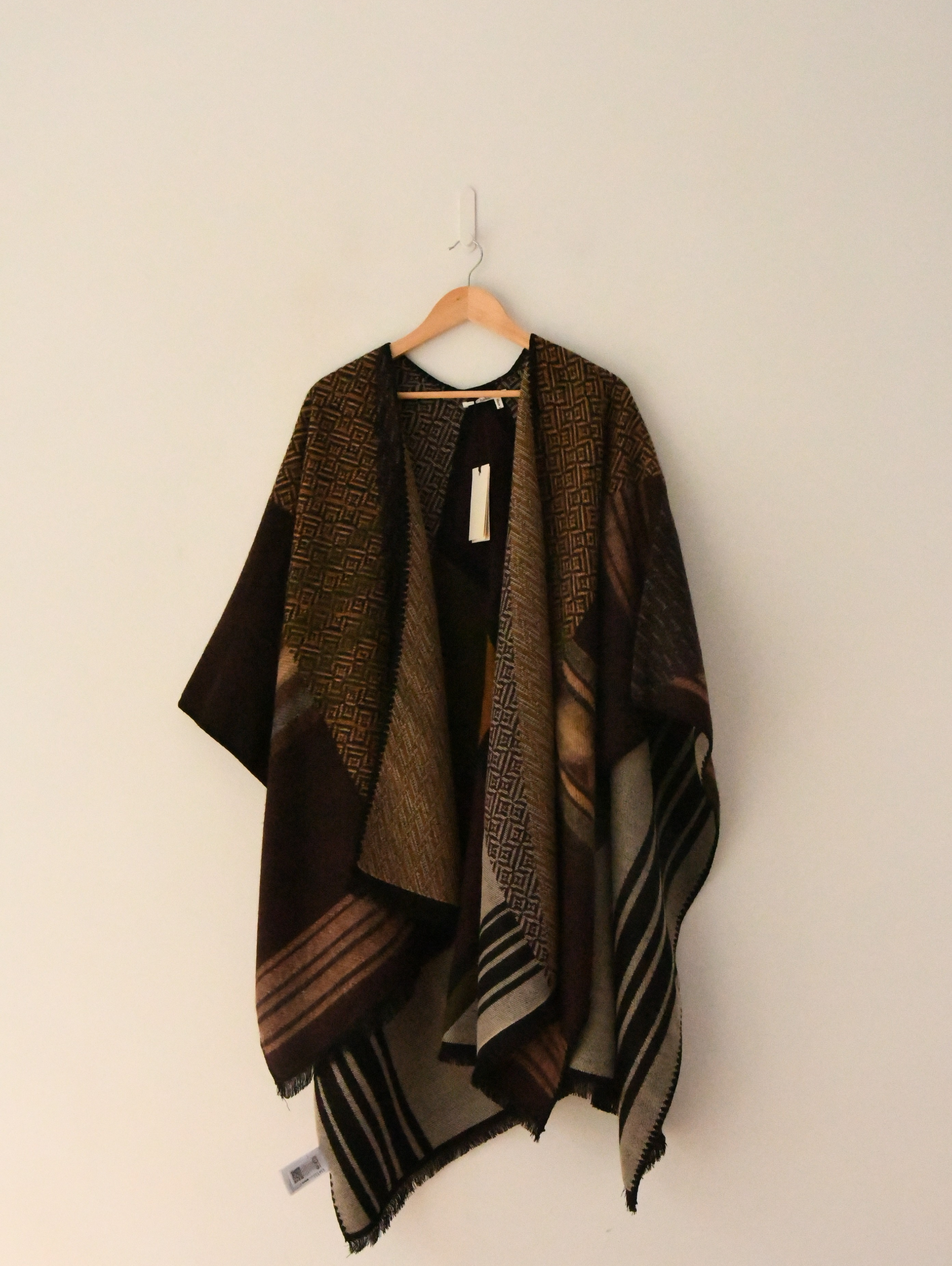 Brown multicoloured cape with a geometric pattern and striped detail, fringed edge and open front.