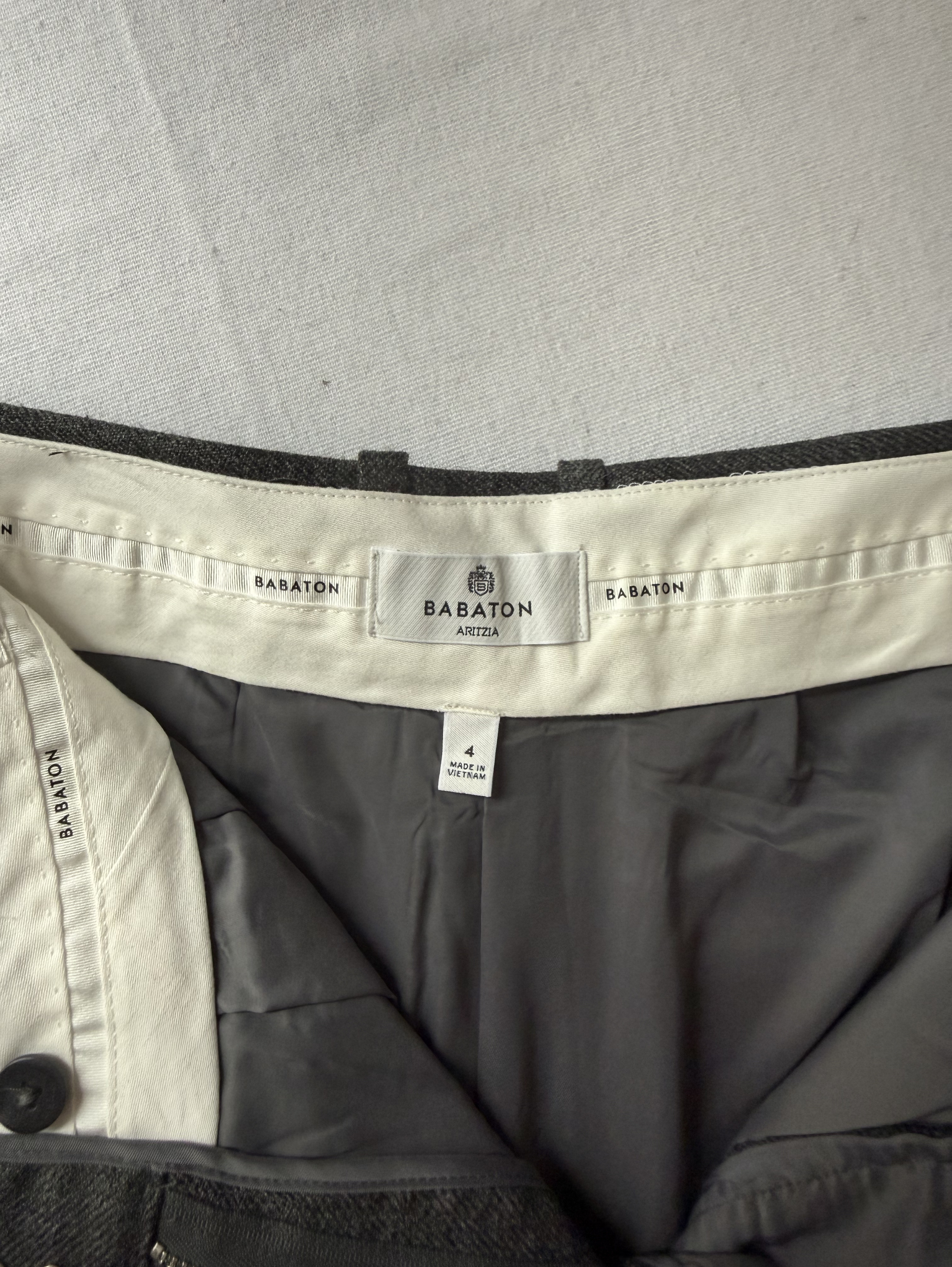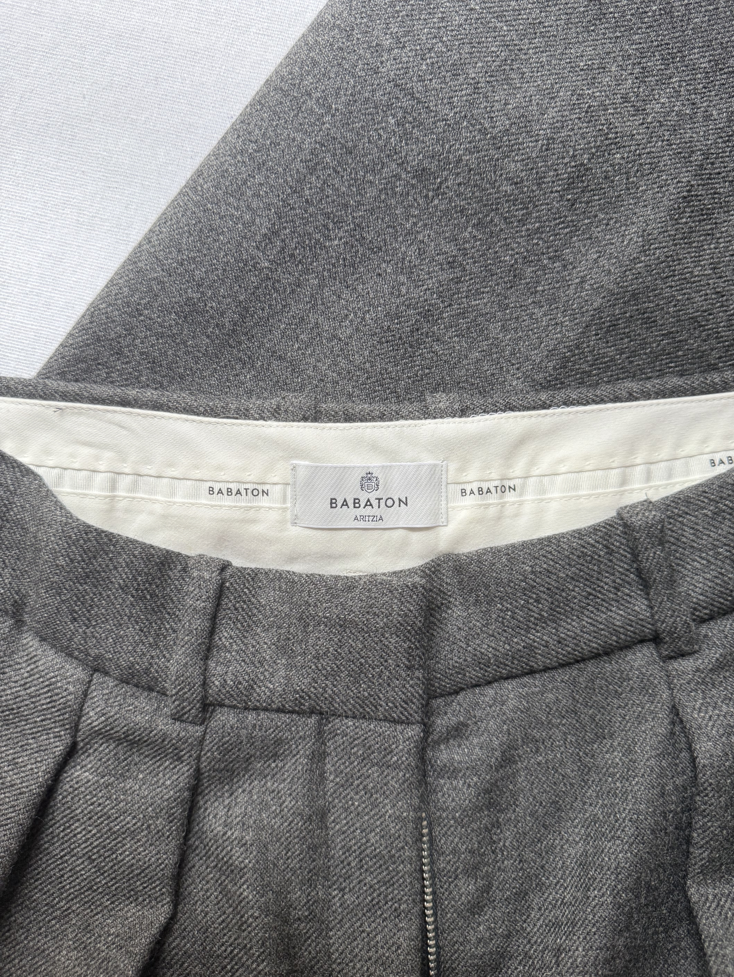 Dark grey tailored trousers with pleats at the waist. ( See my other items for matching Blazer)