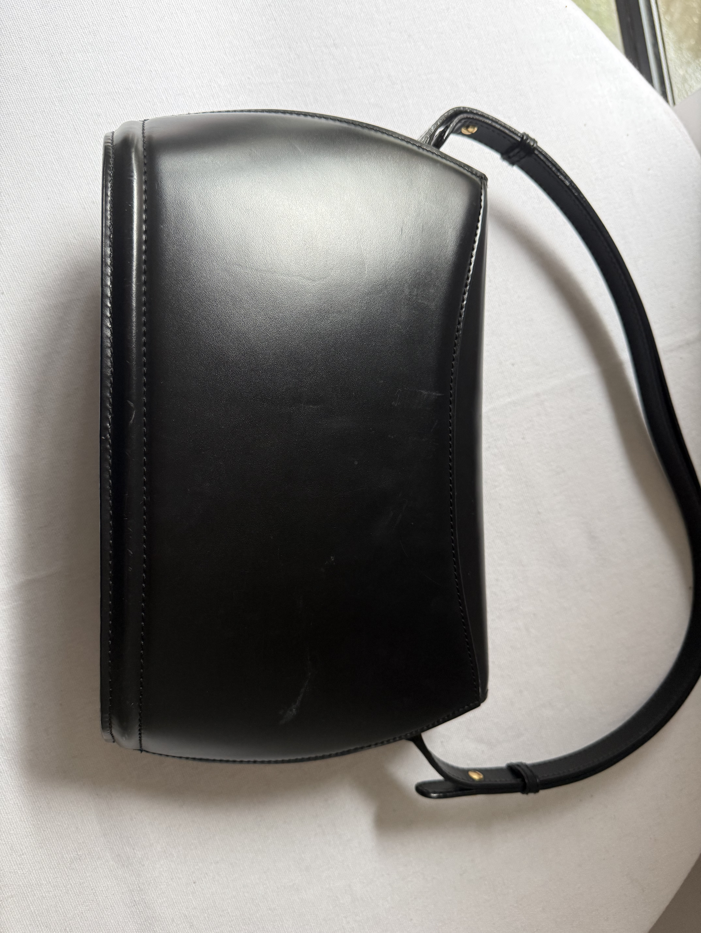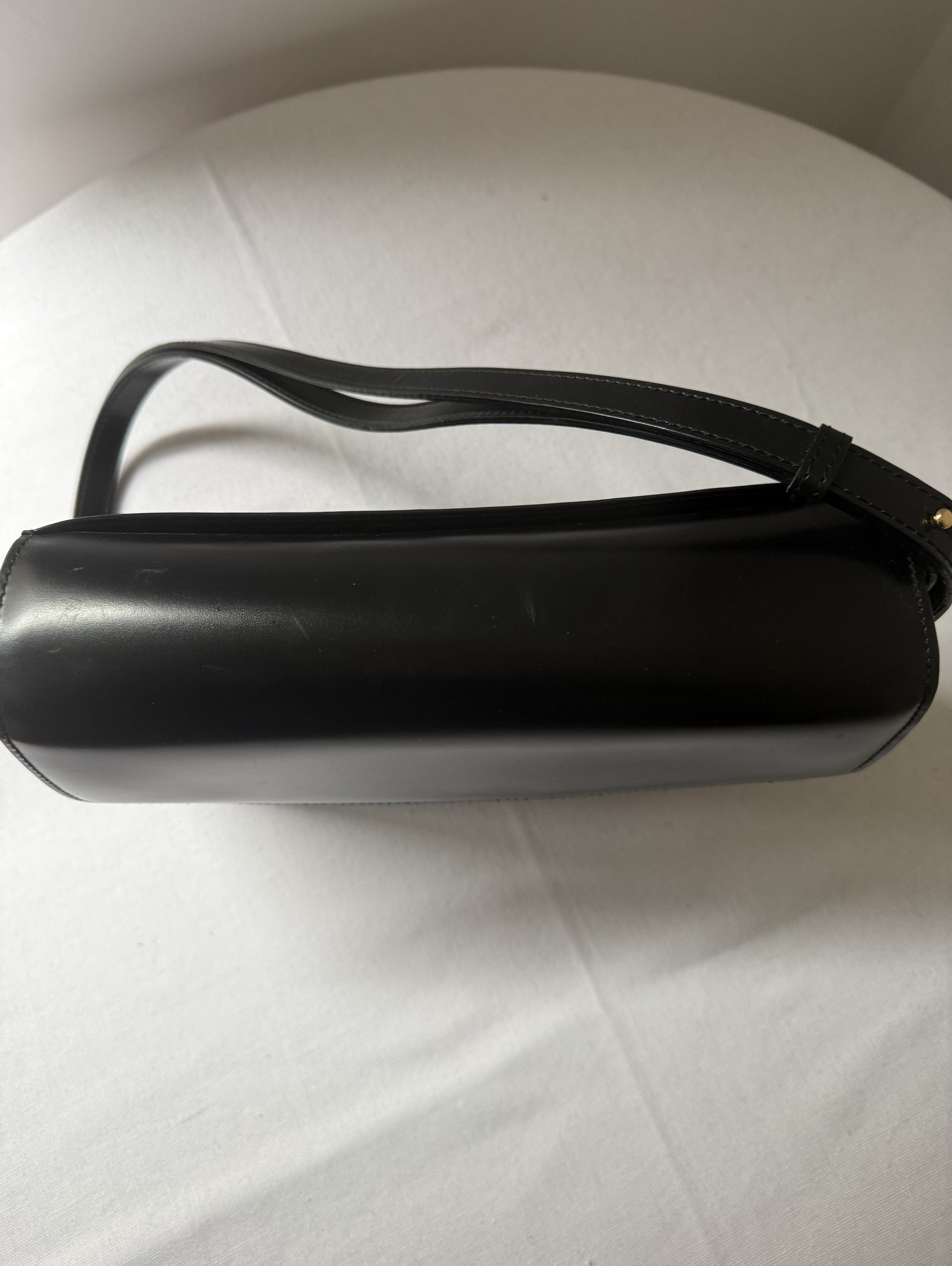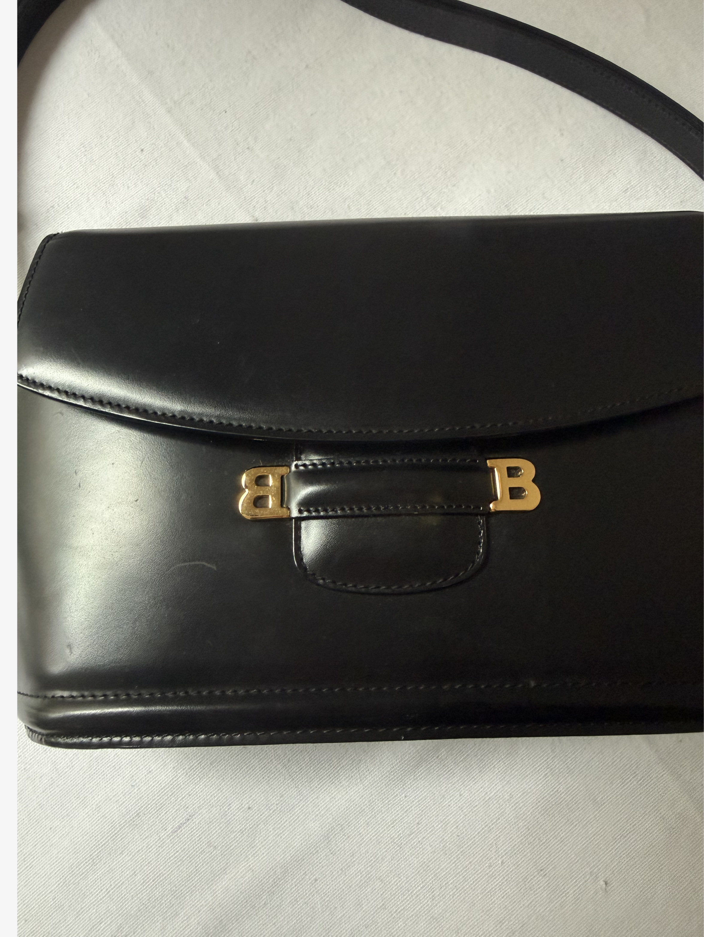 Calf Leather Shoulder bag with gold metal logo. Flap closure with a clasp, top handle and adjustable shoulder strap.
