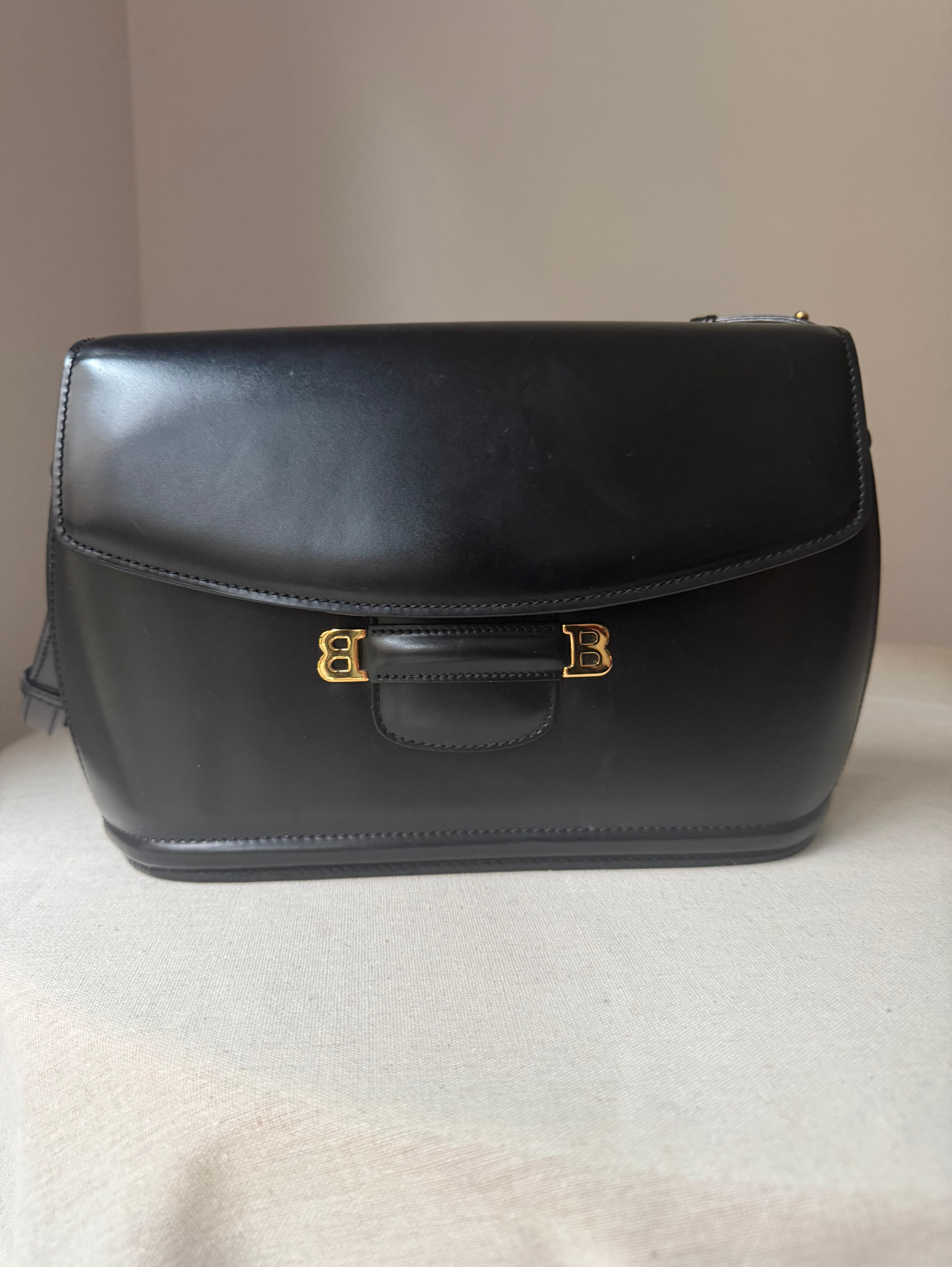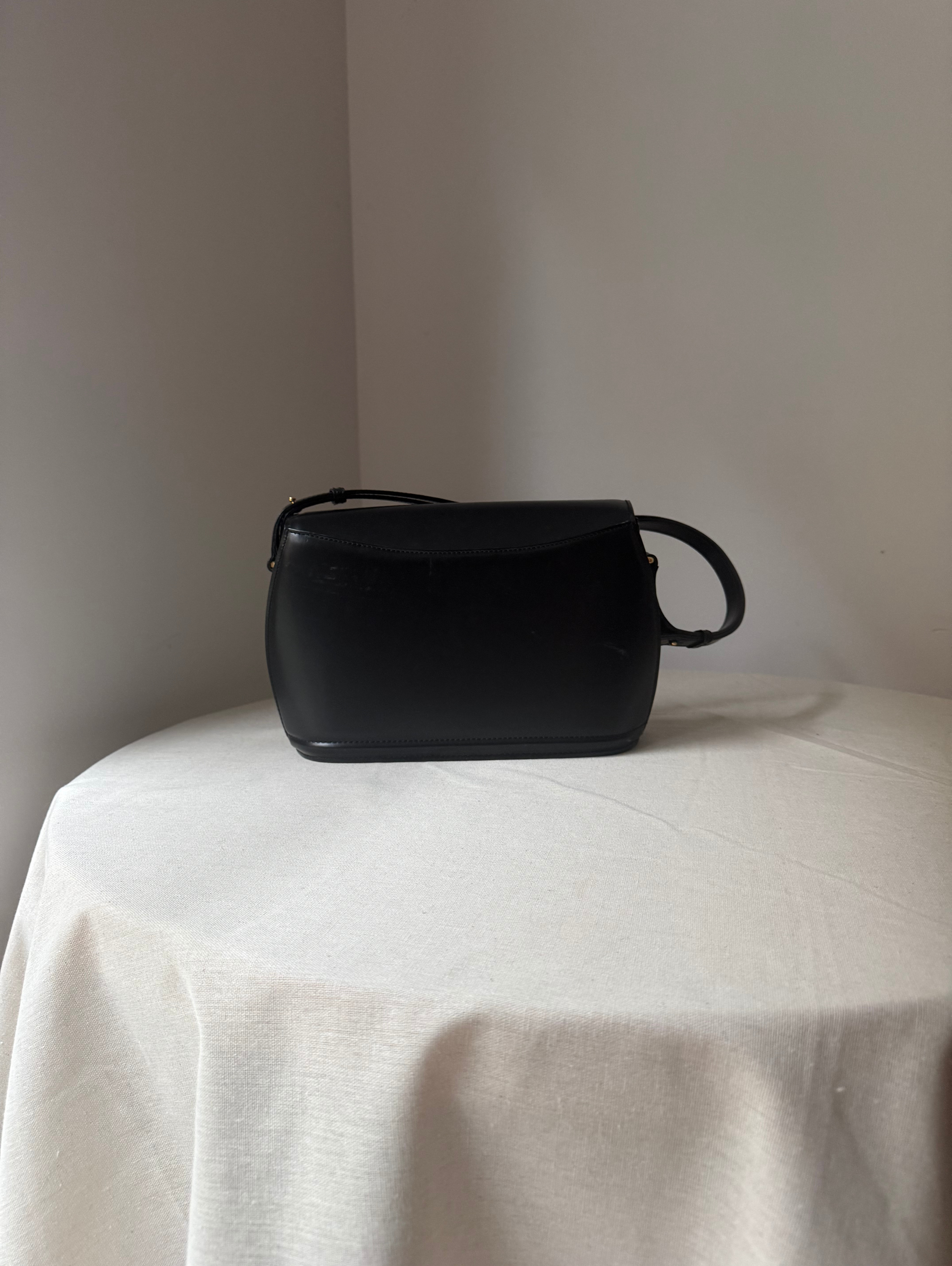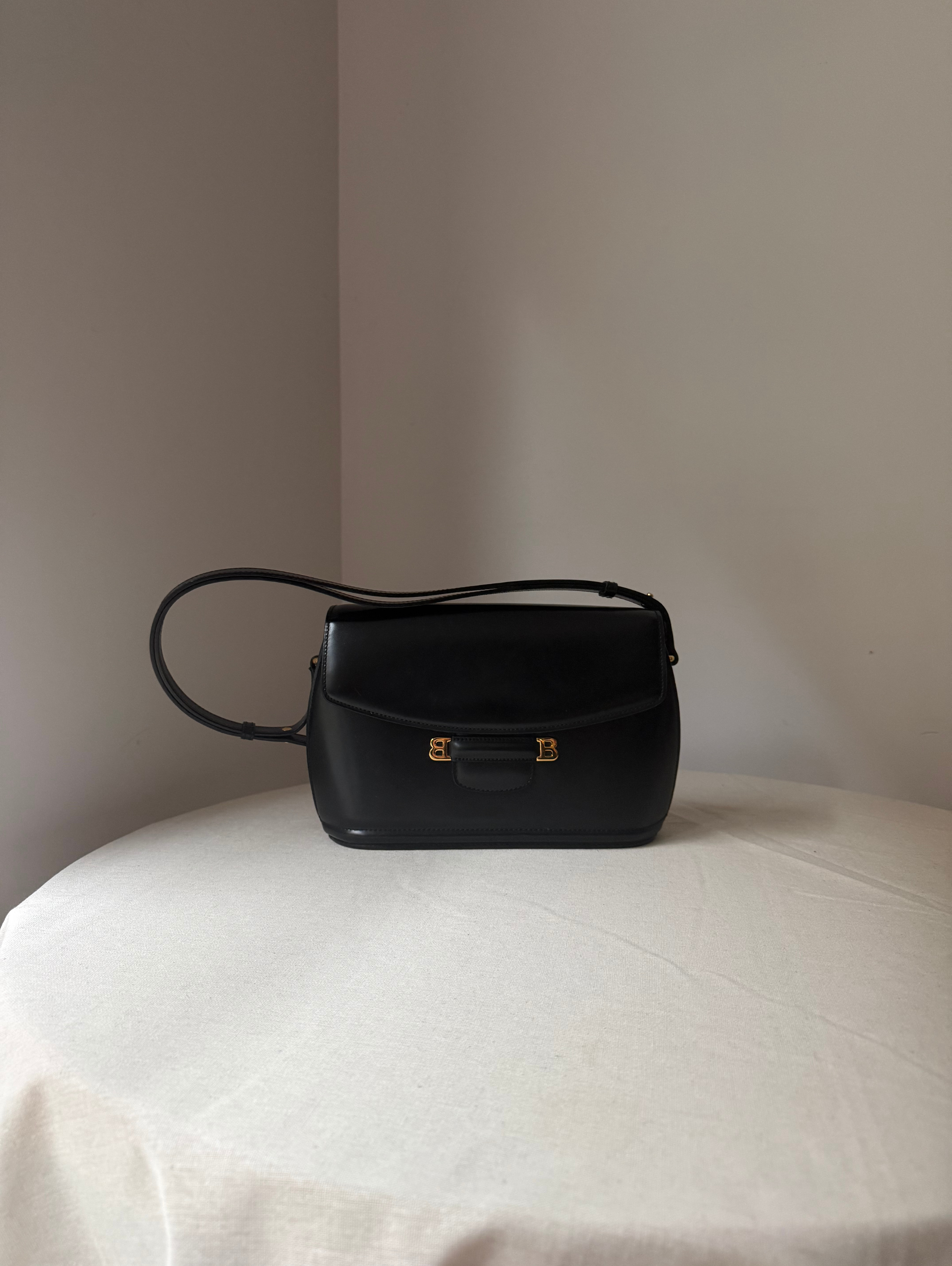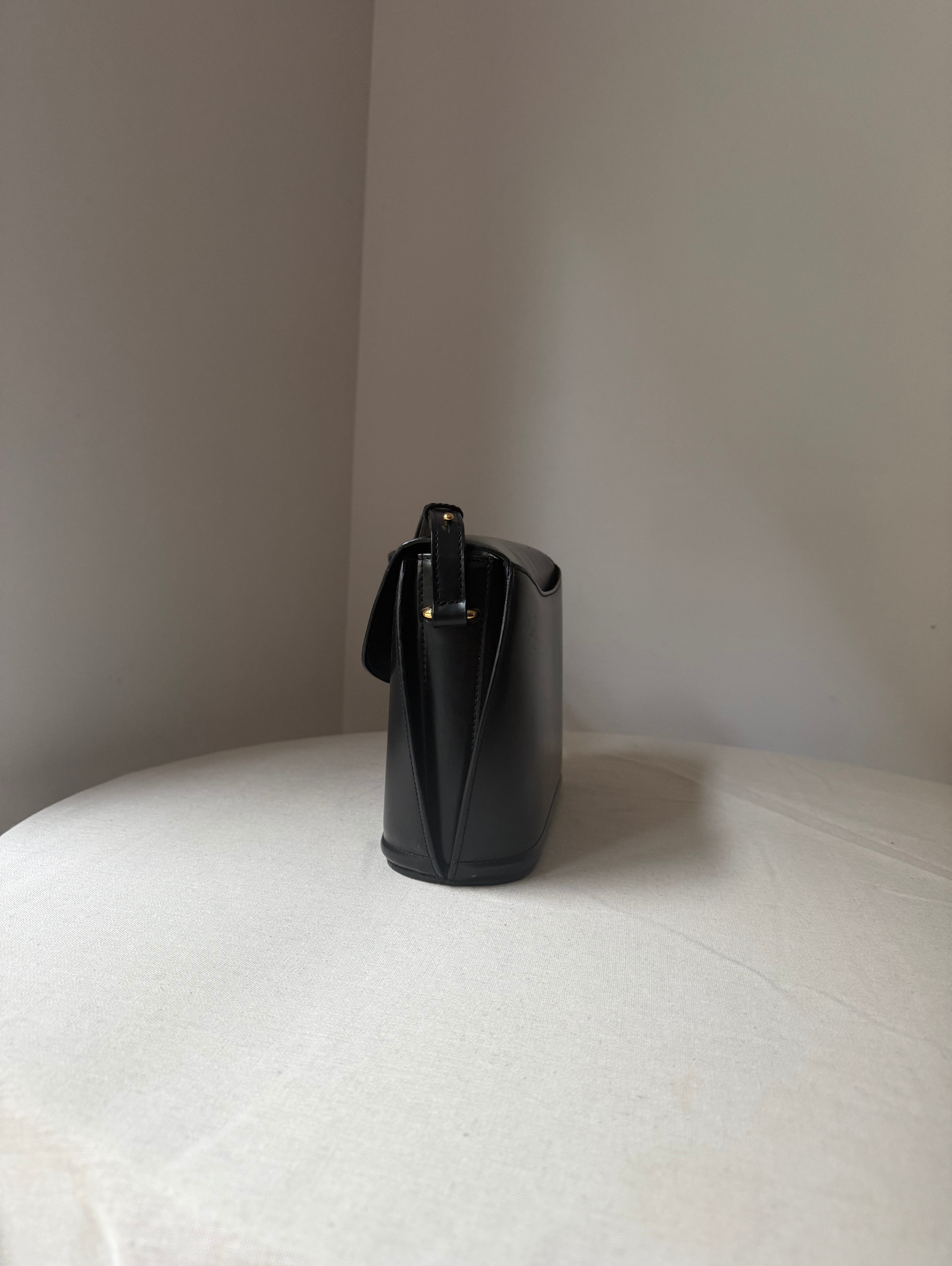 Calf Leather Shoulder bag with gold metal logo. Flap closure with a clasp, top handle and adjustable shoulder strap.