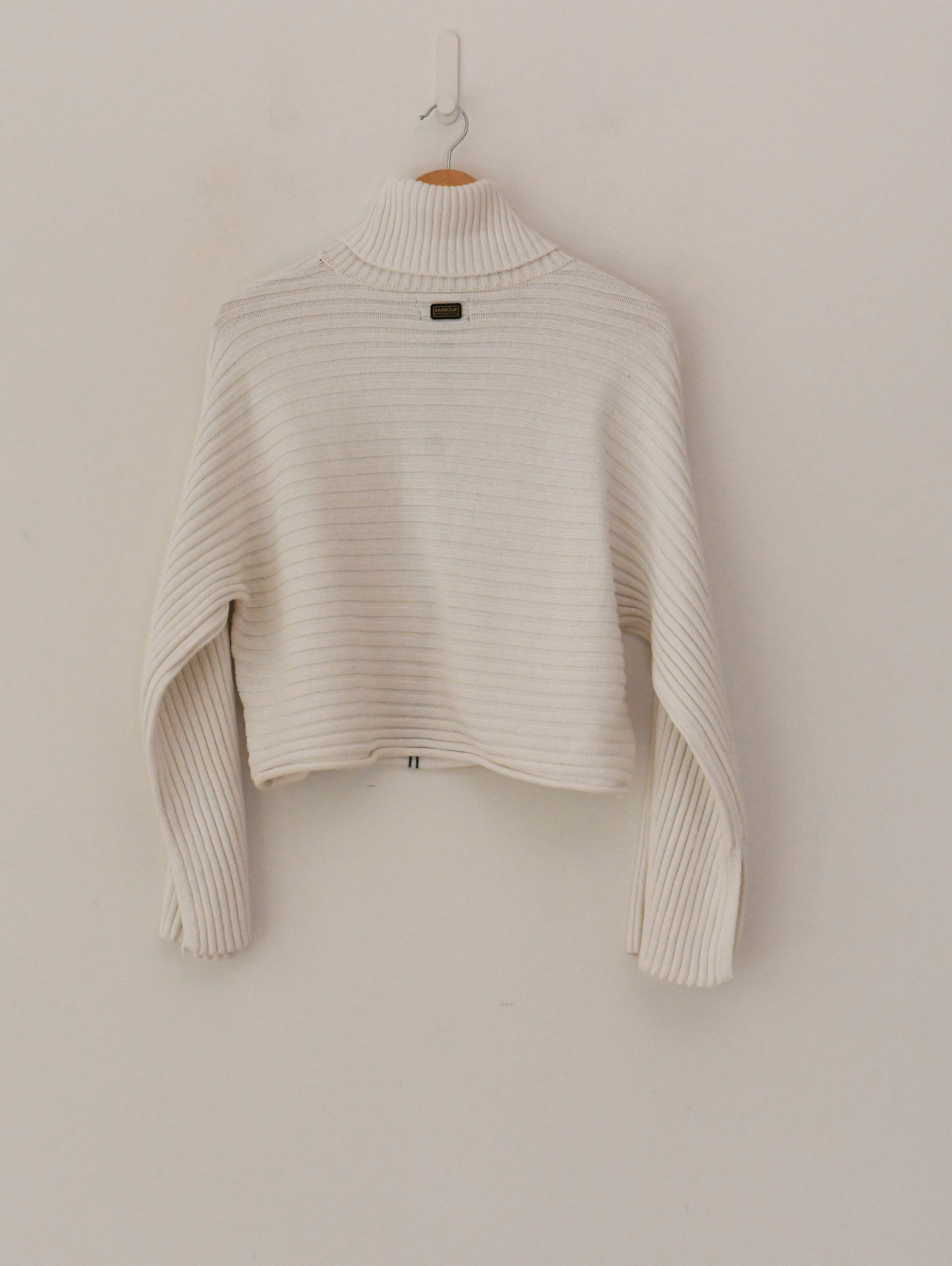 Revamp your knitwear collection with the women's Barbour International Serova Knitted Jumper. This heavyweight roll neck knit boasts a stylish horizontal rib knit structure, adding texture and depth to your look. With its dropped shoulder and wide sleeves, it exudes a relaxed yet contemporary vibe.