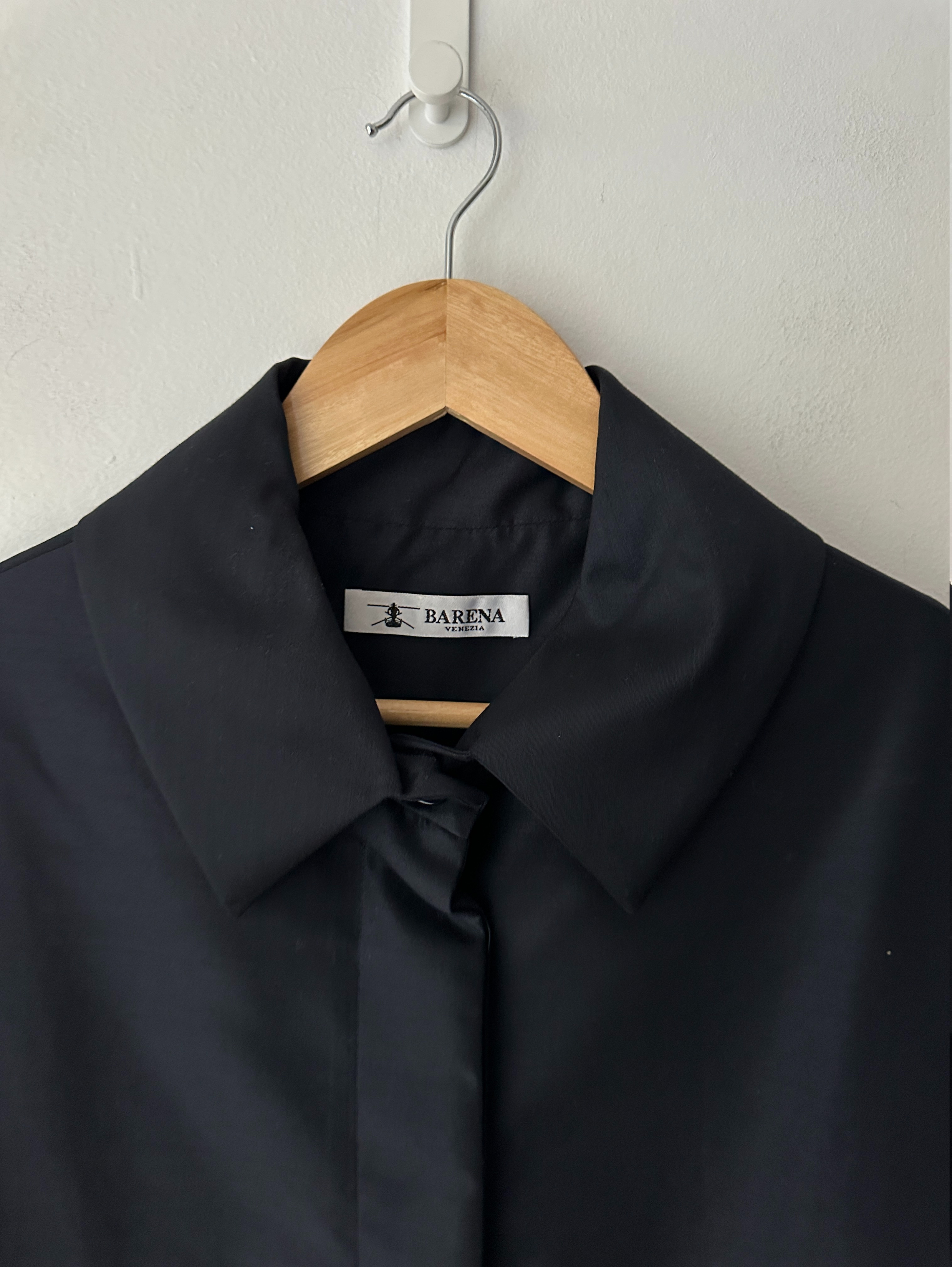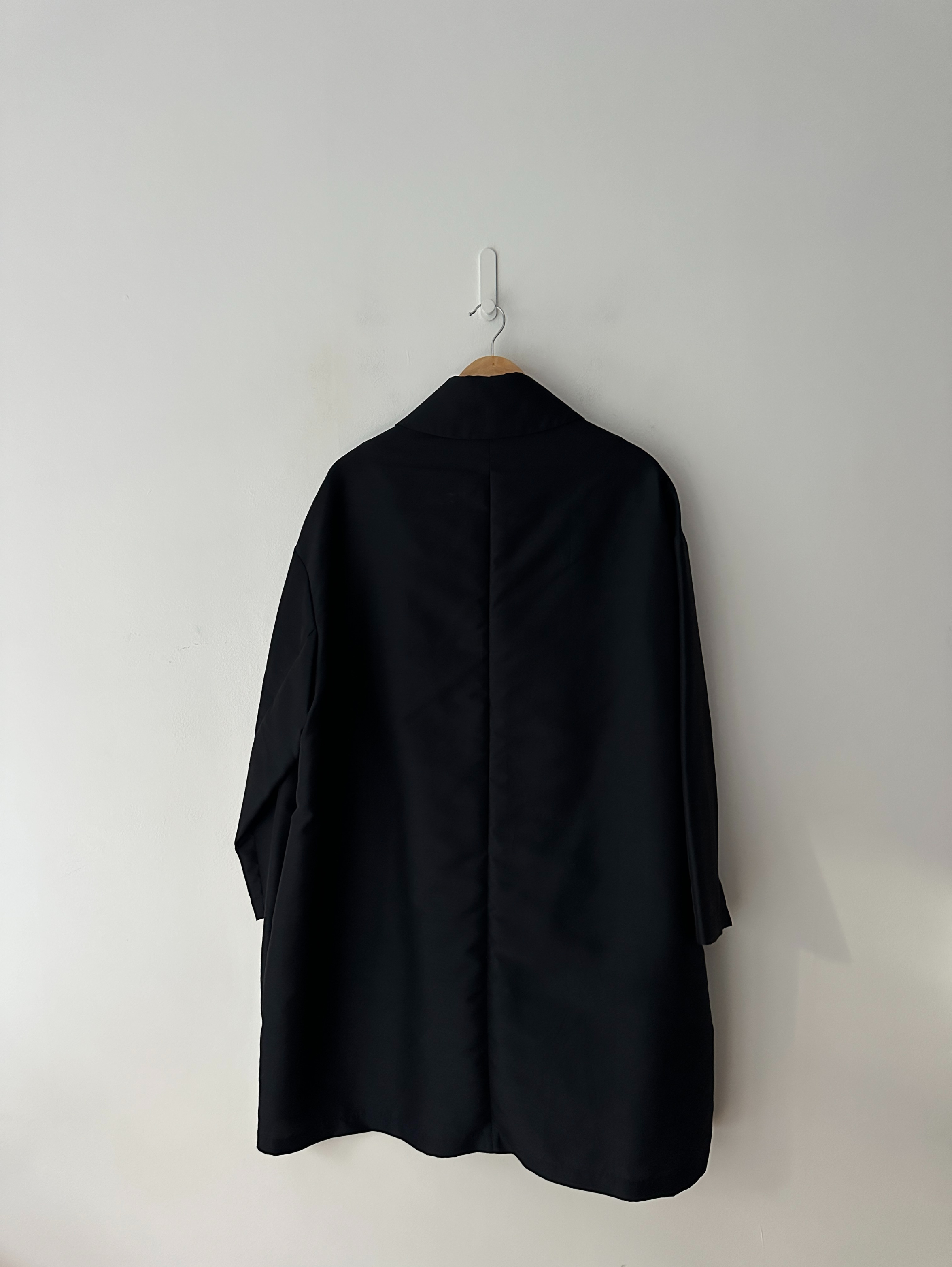 Classic single-breasted mac or trench coat. Features a pointed collar, a concealed or clean front button closure, and a mid-length or longline silhouette.