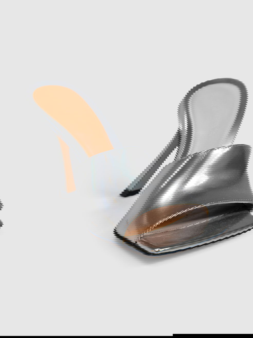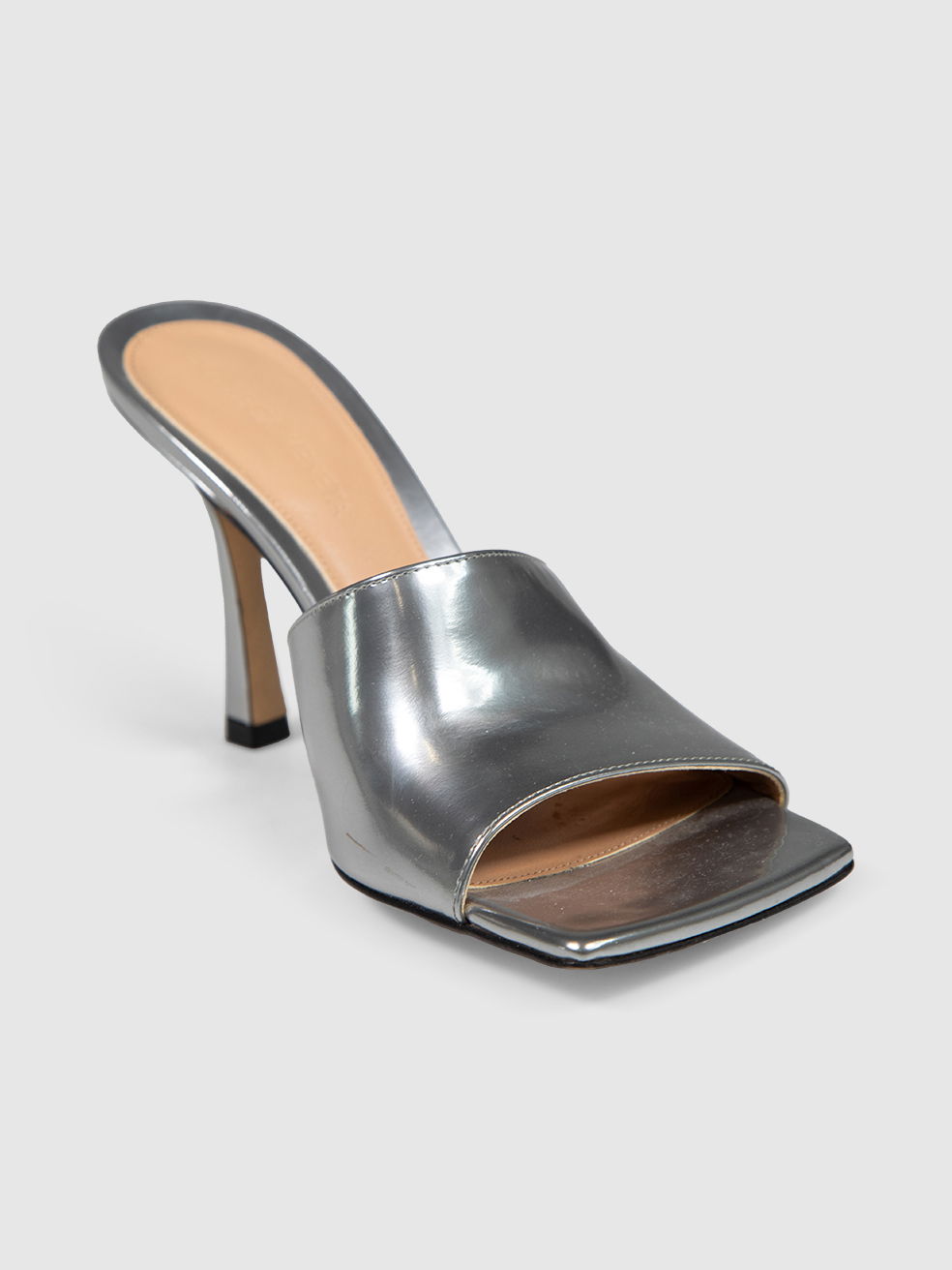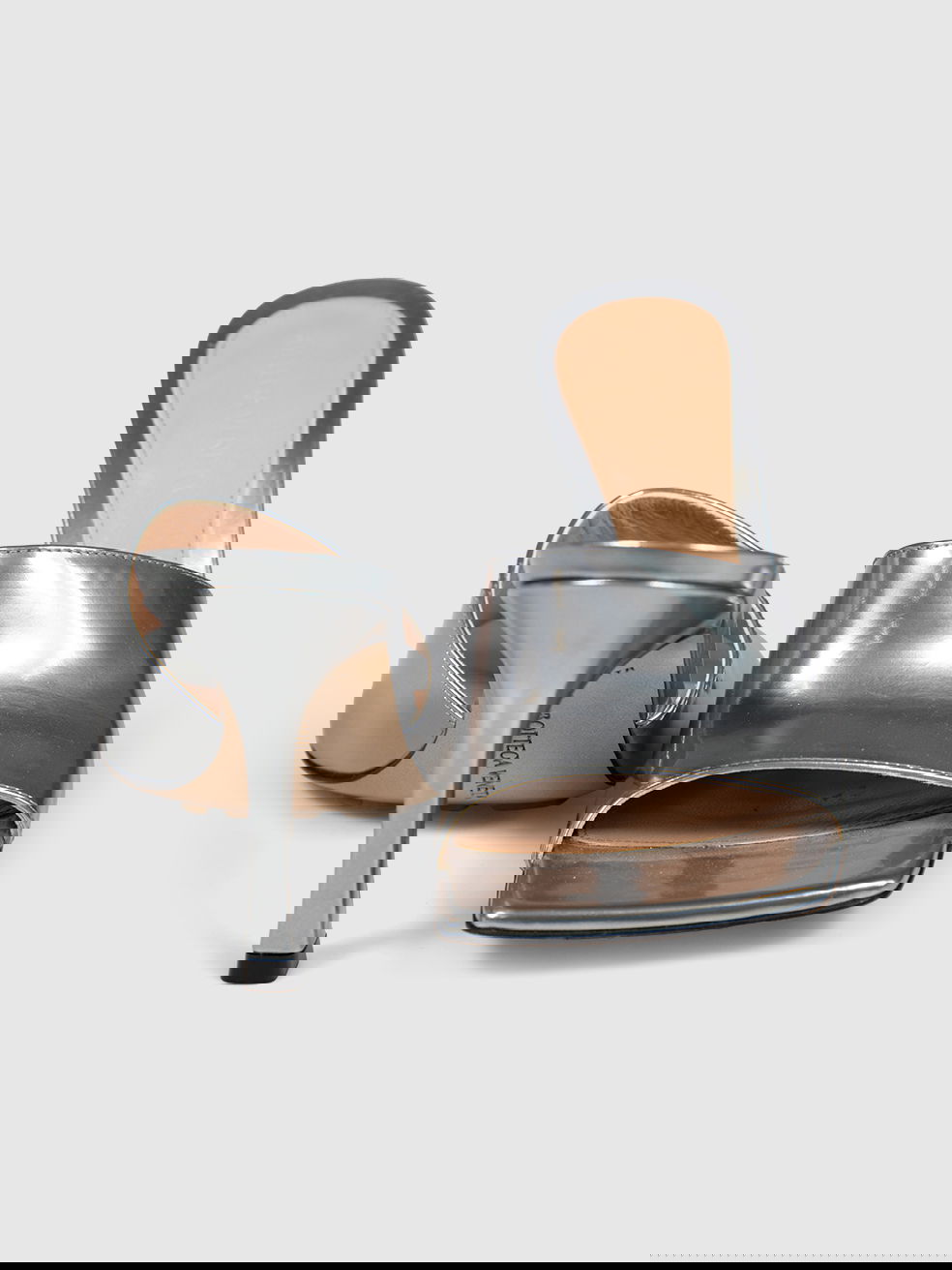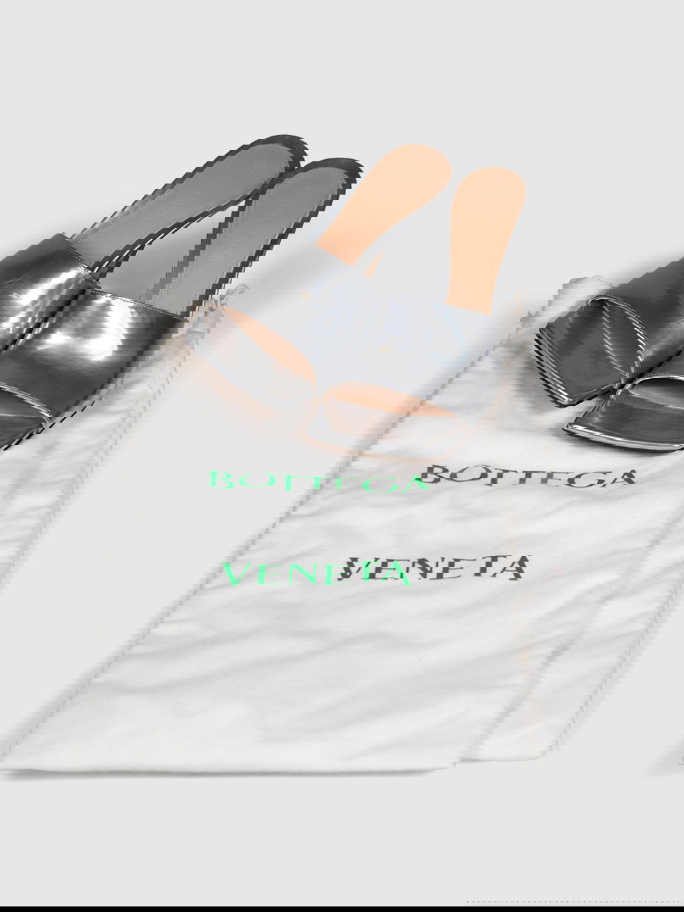 Silver heeled open-toe mules in excellent, pre-worn condition. See images for signs of wear. Shoes come with original dust bags. Composition: 100% leather. Heel height 100mm.