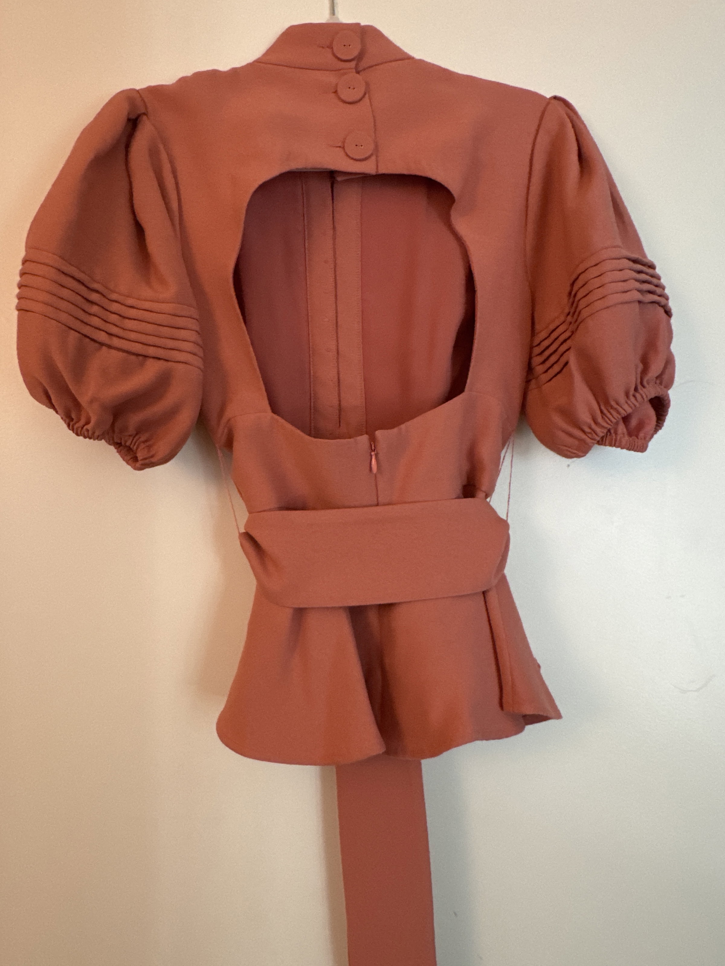 Peplum open back shirt with puff sleeves and belt.