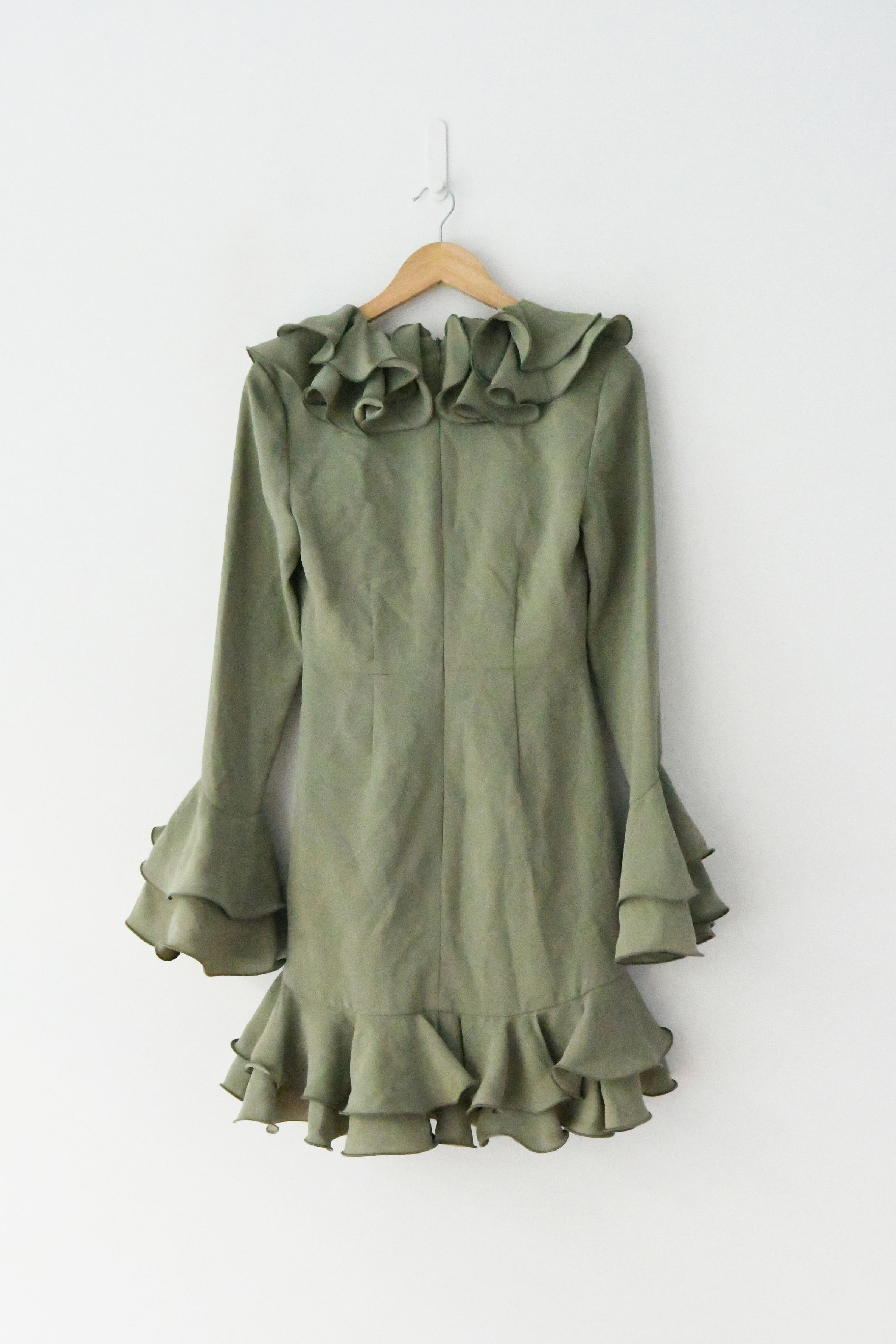 The dress features distinctive design elements, including long belle and flounce sleeves, a tiered ruffle hem, and a ruffled v-neckline with or tie-up detailing on the front.