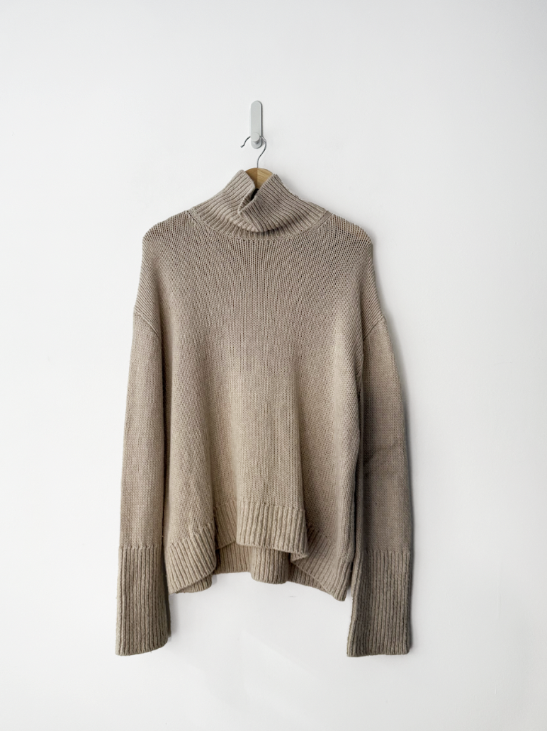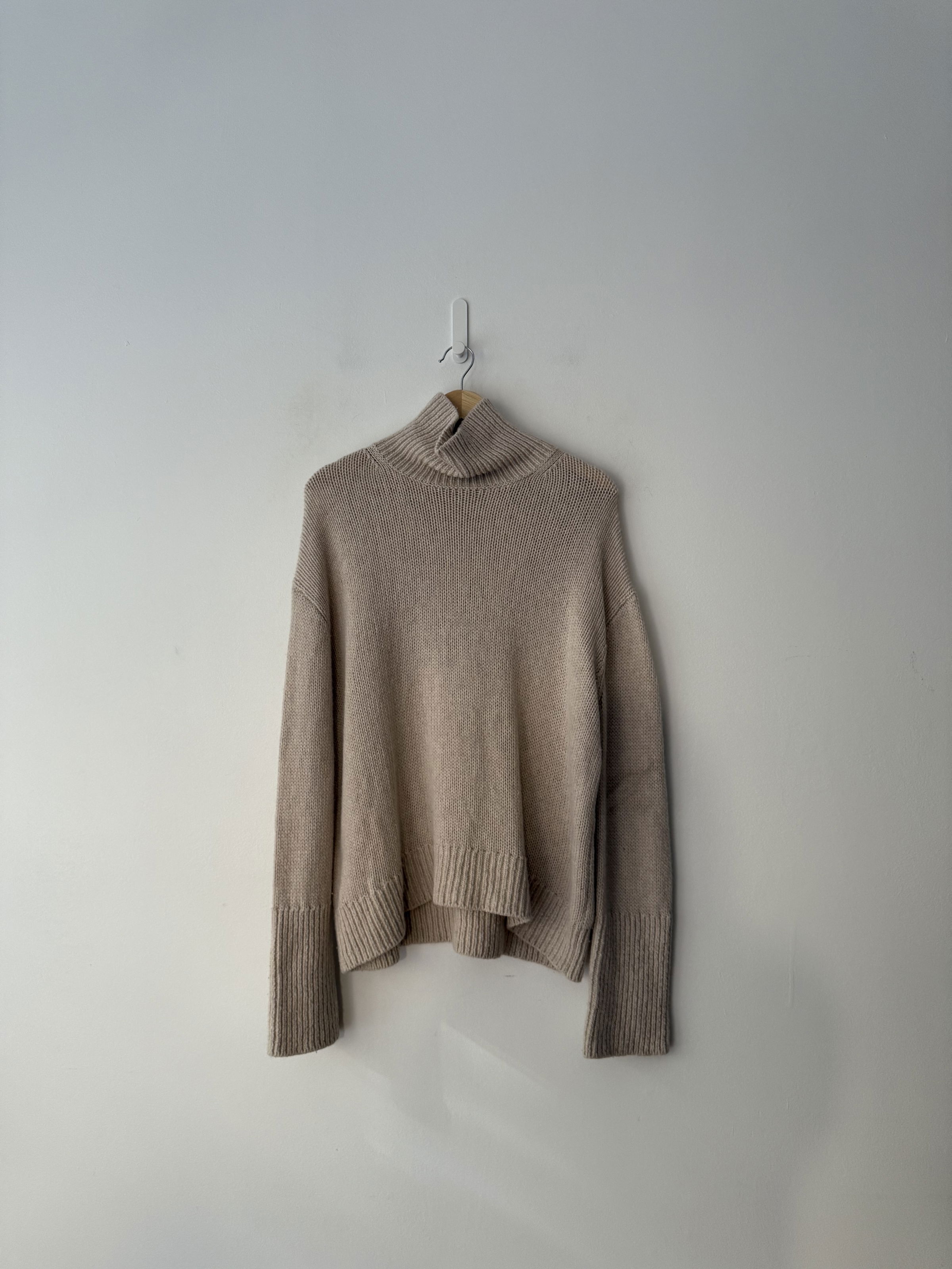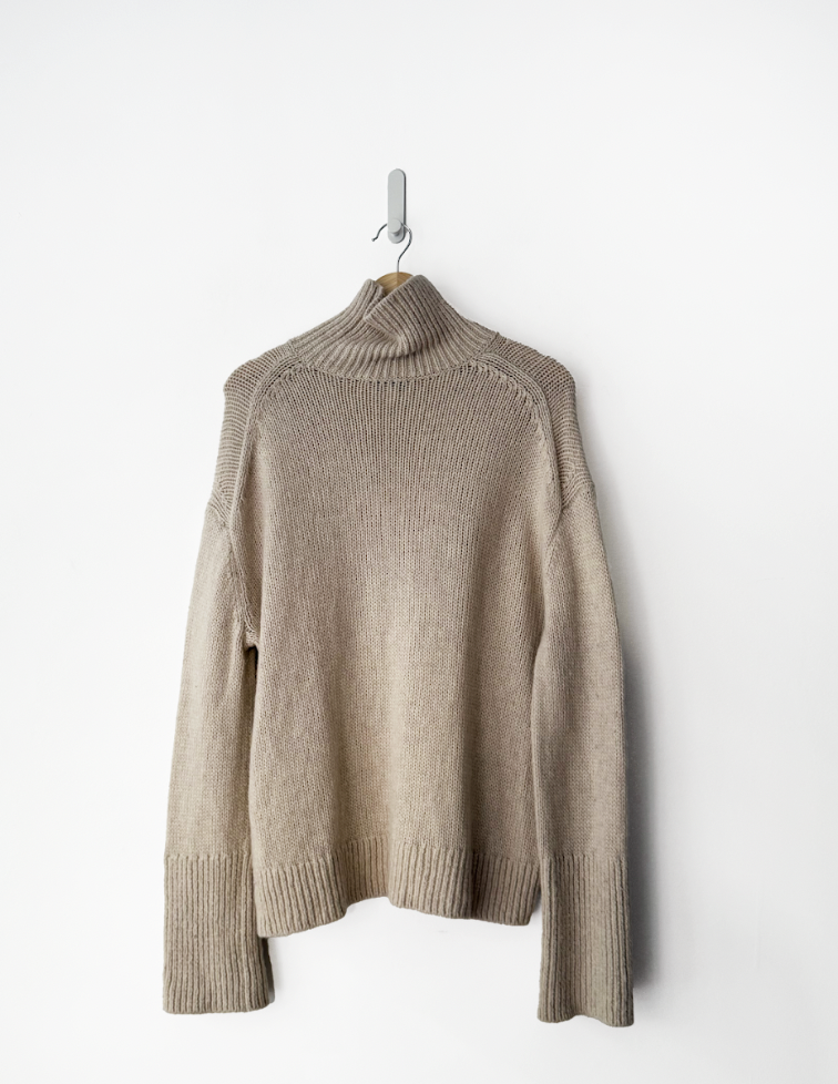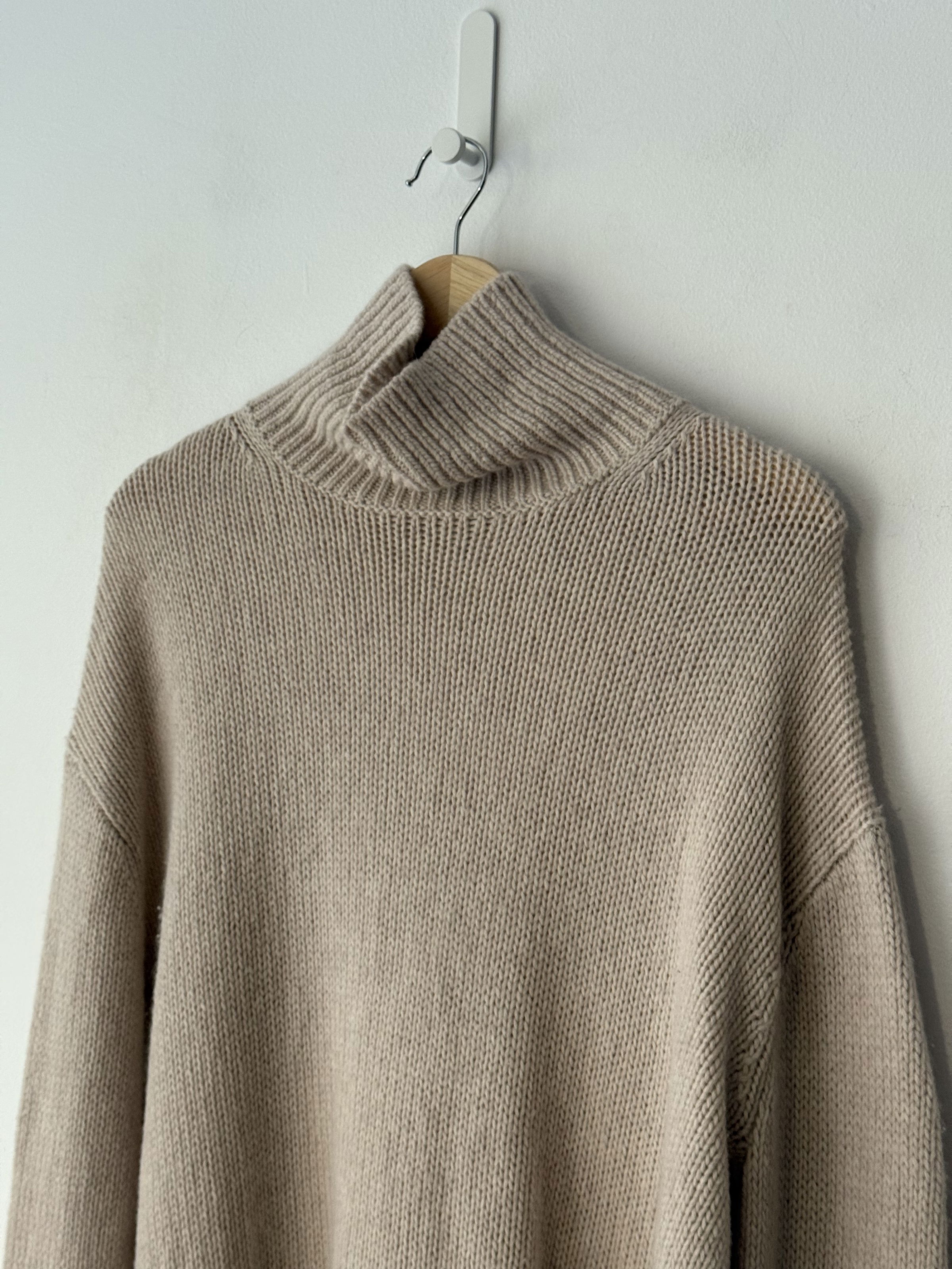 Beige mock neck jumper in excellent, pre-worn condition with ribbed collar, cuffs and hemline. Composition: wool 70%, cashmere 30%