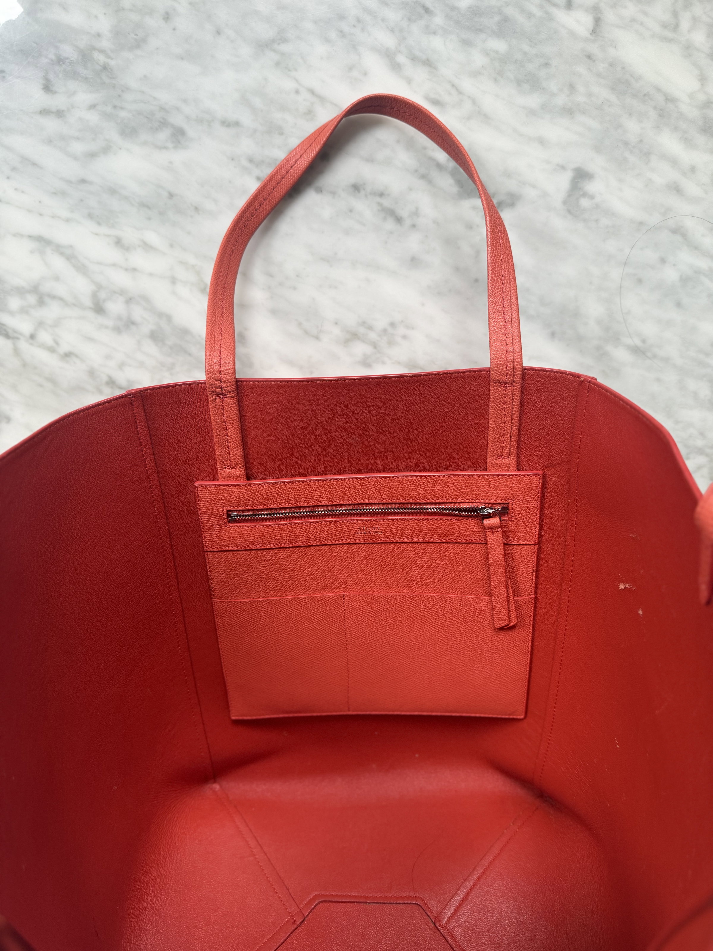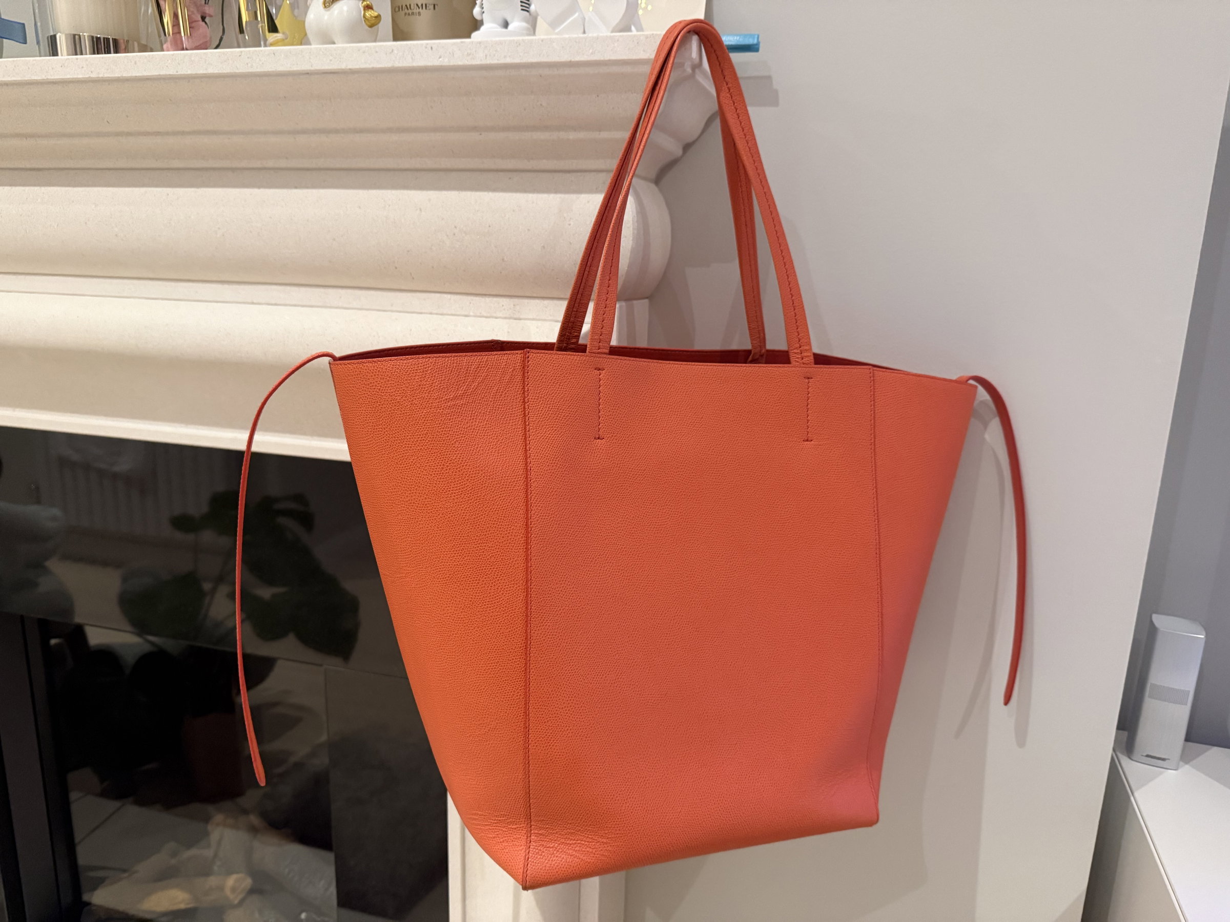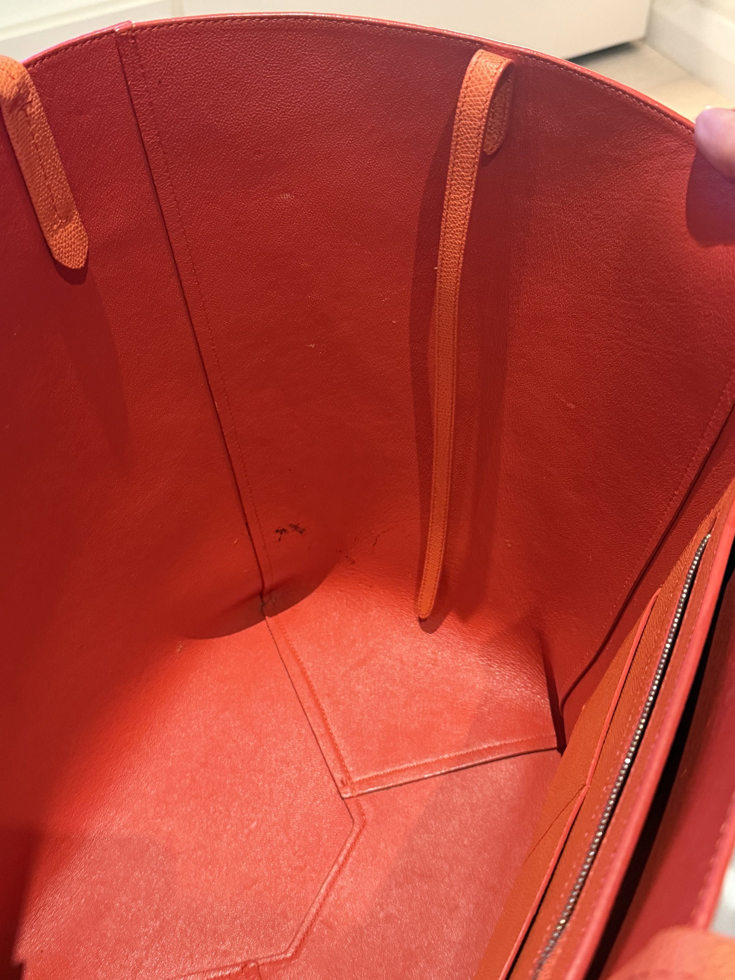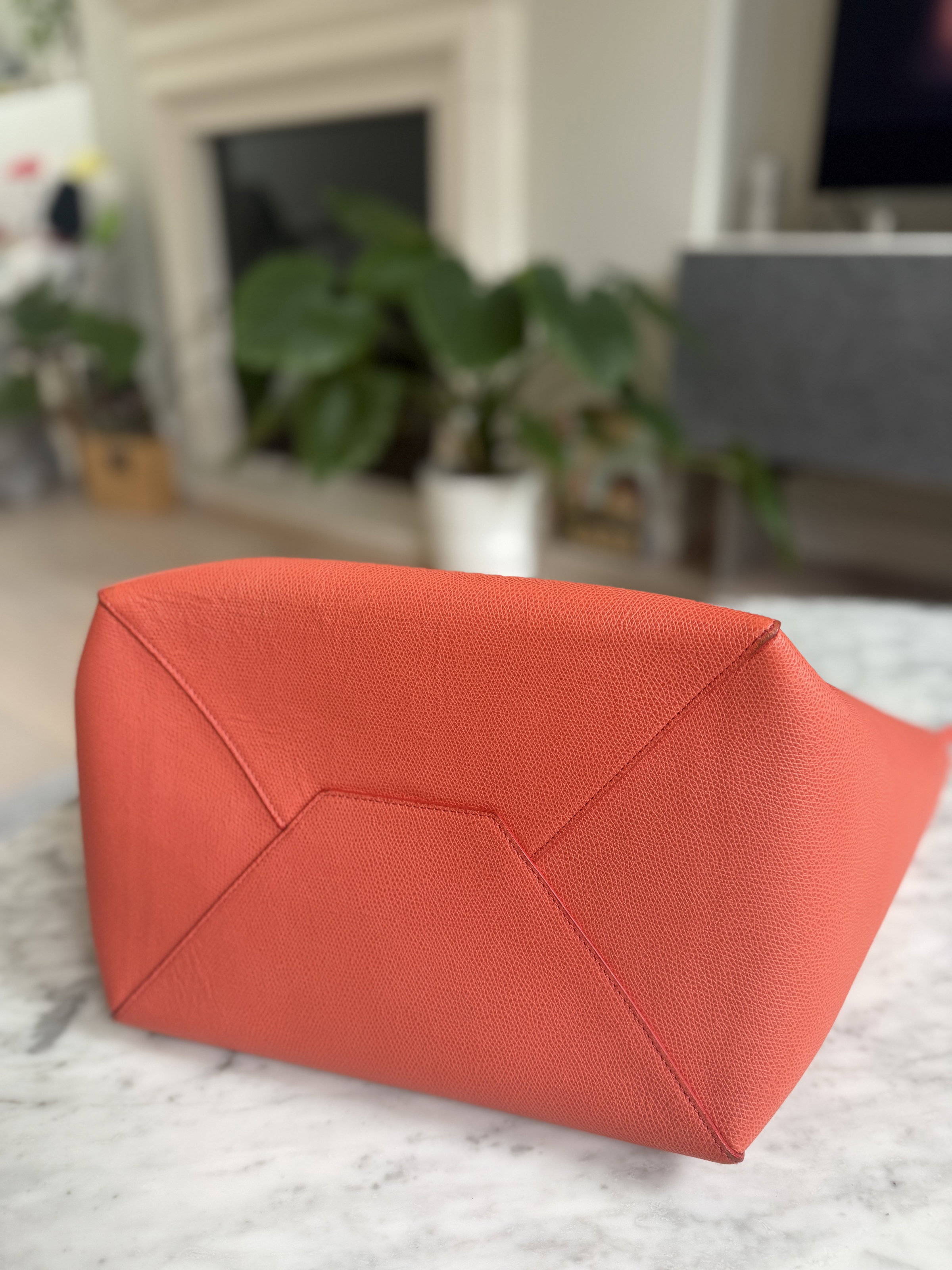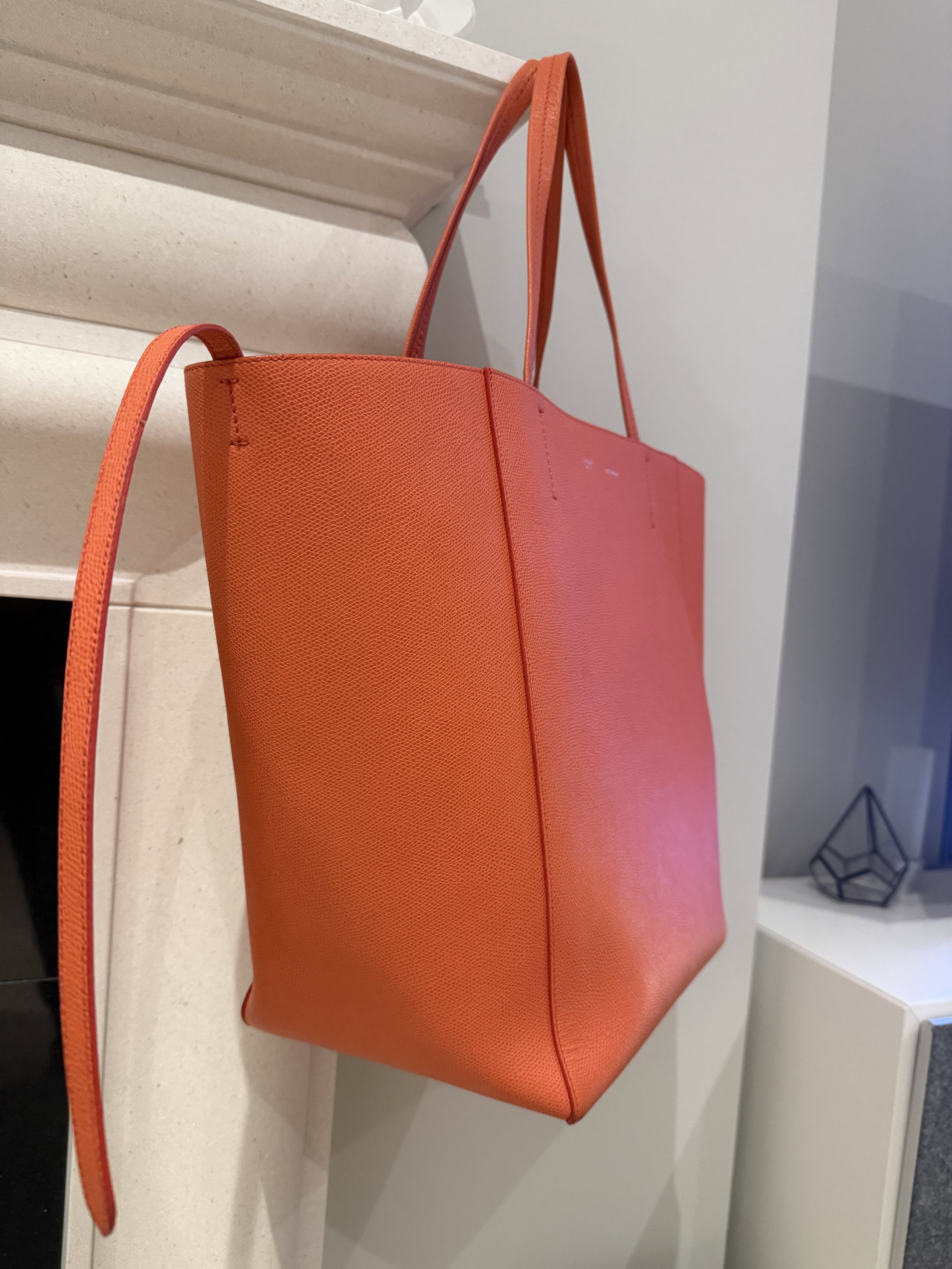 Celine Cabas well structured large leather tote bag. Very stylish with vibrant orange colour. Made in Italy. Few marks inside the bag but not obvious. Outside only the bottom has tiny signs of usage. Overall it looks super good condition.