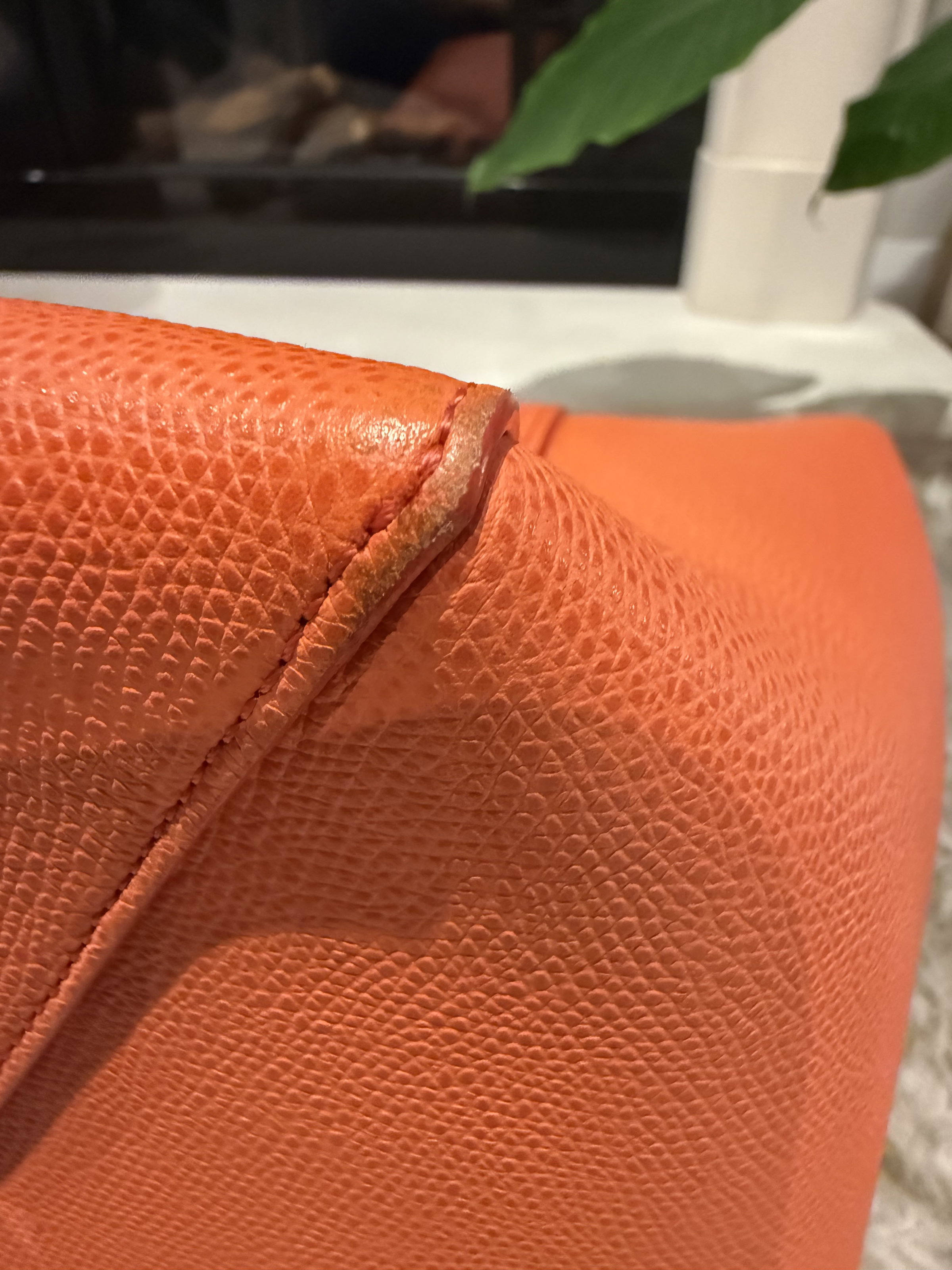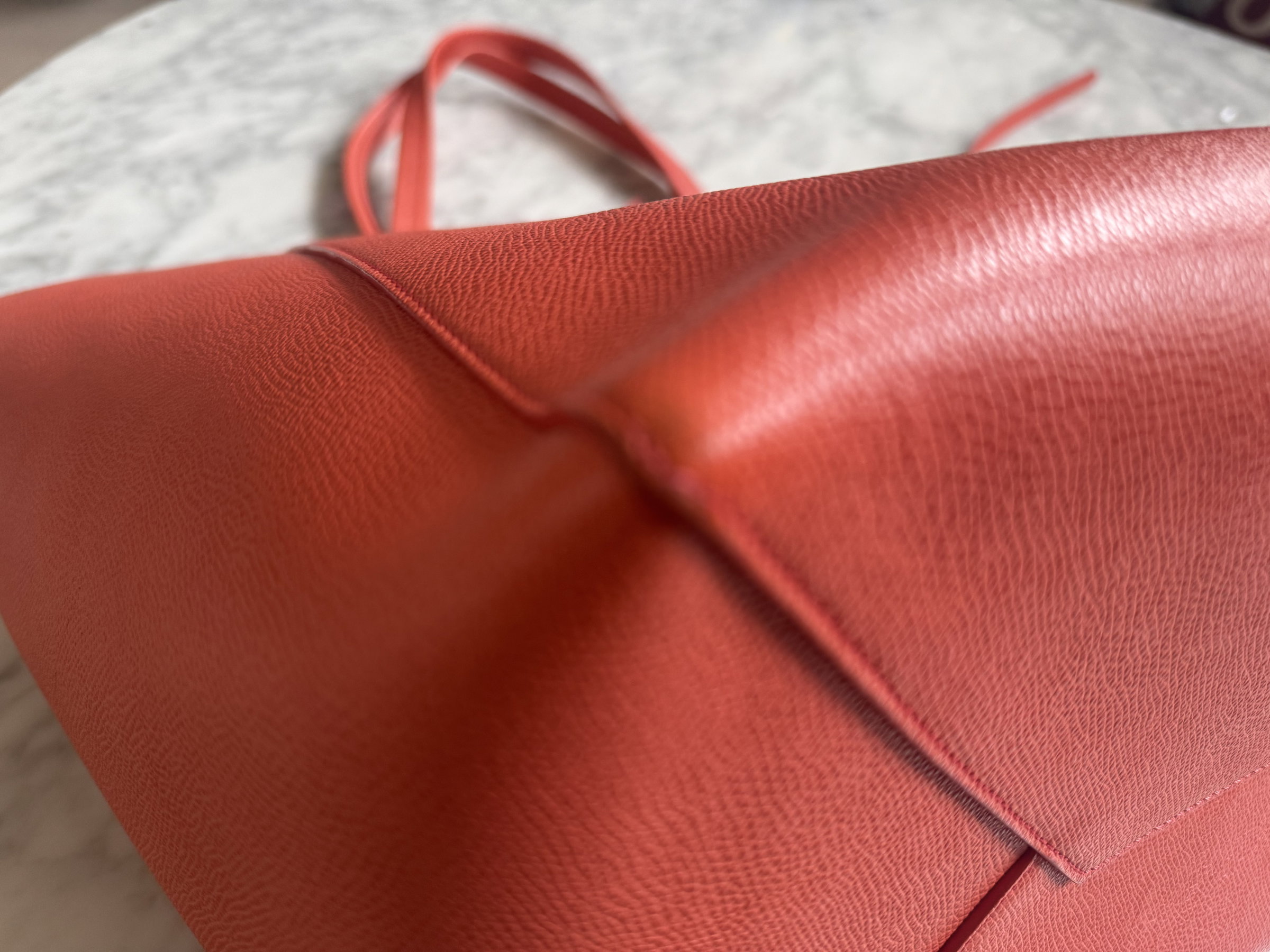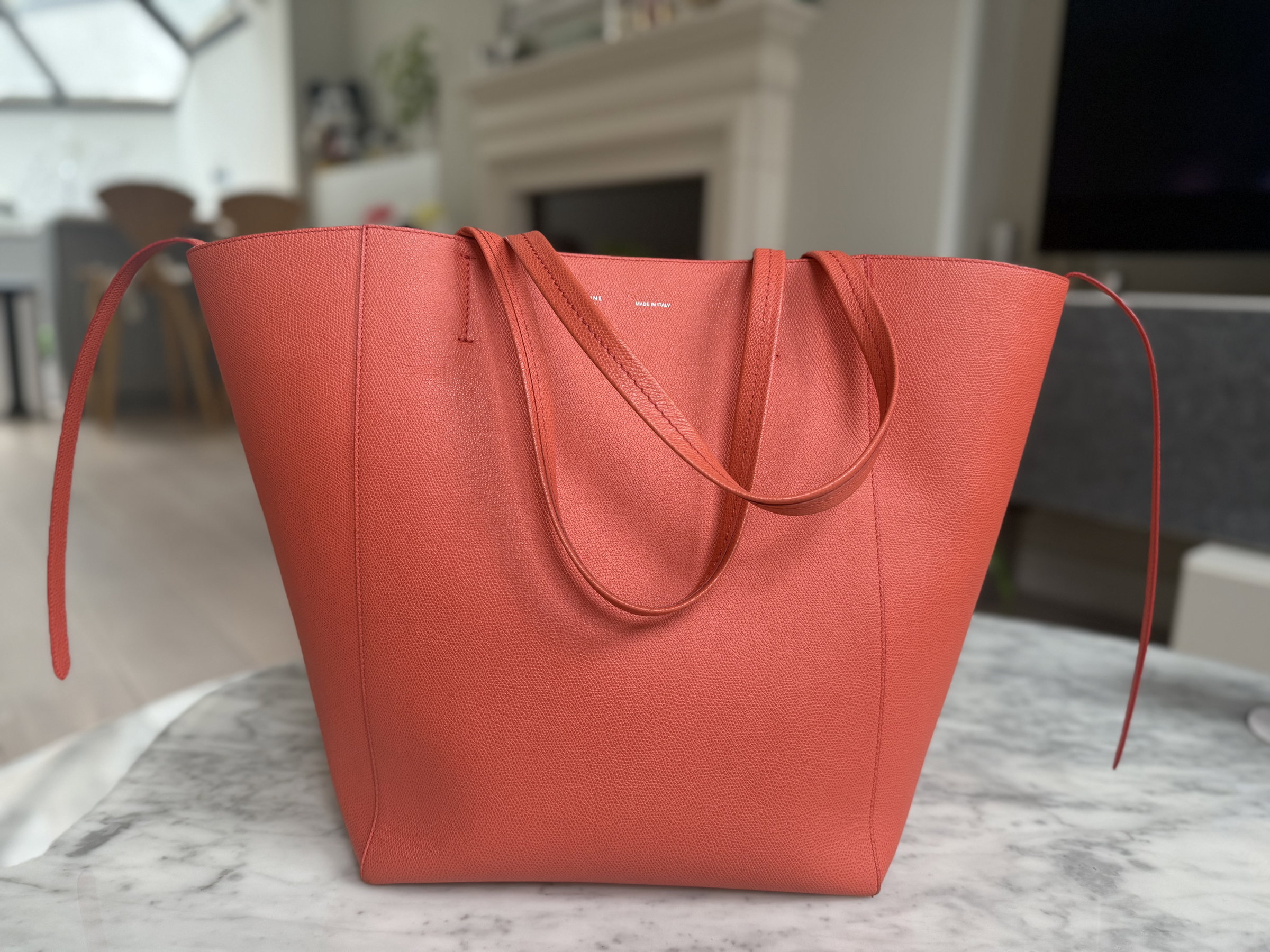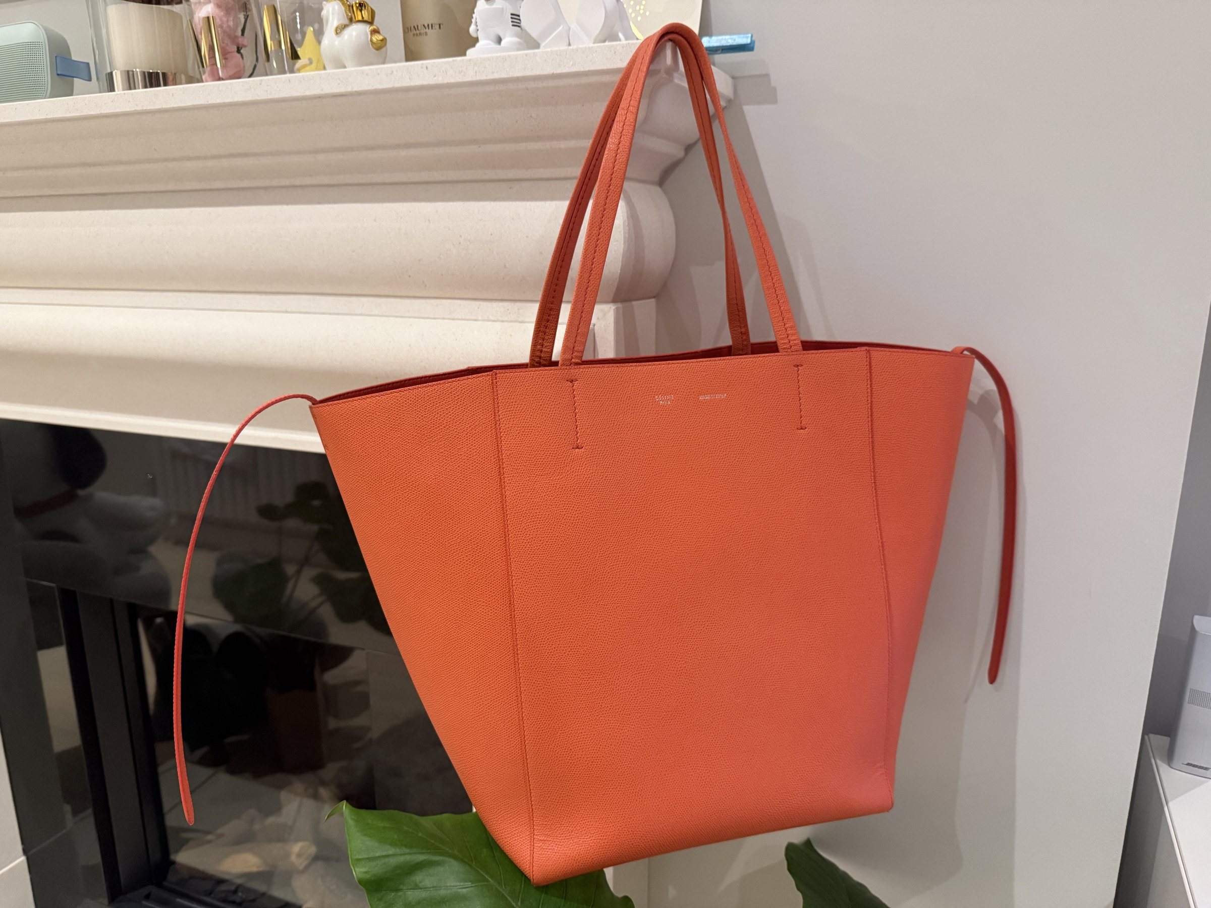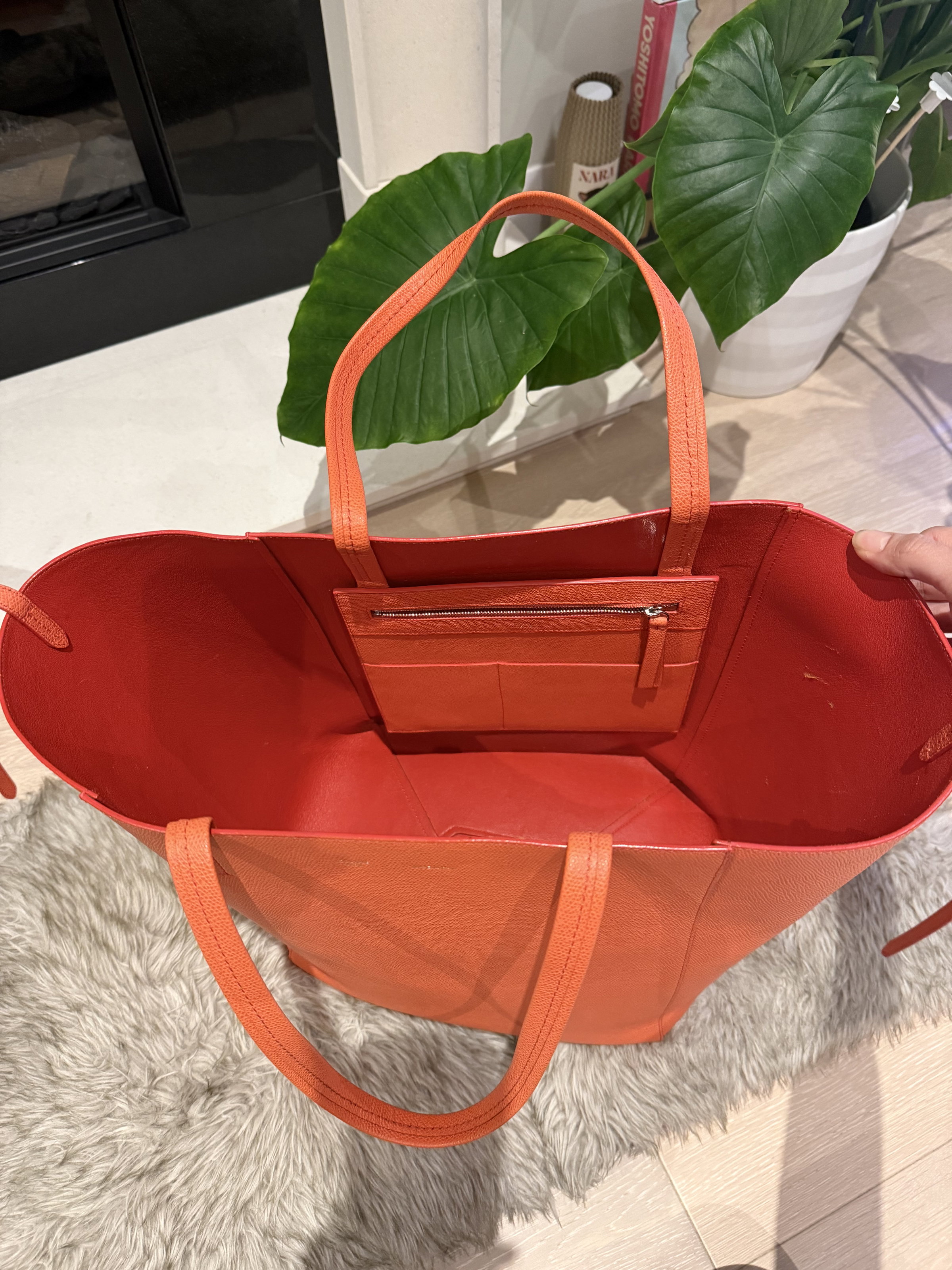 Celine Cabas well structured large leather tote bag. Very stylish with vibrant orange colour. Made in Italy. Few marks inside the bag but not obvious. Outside only the bottom has tiny signs of usage. Overall it looks super good condition.