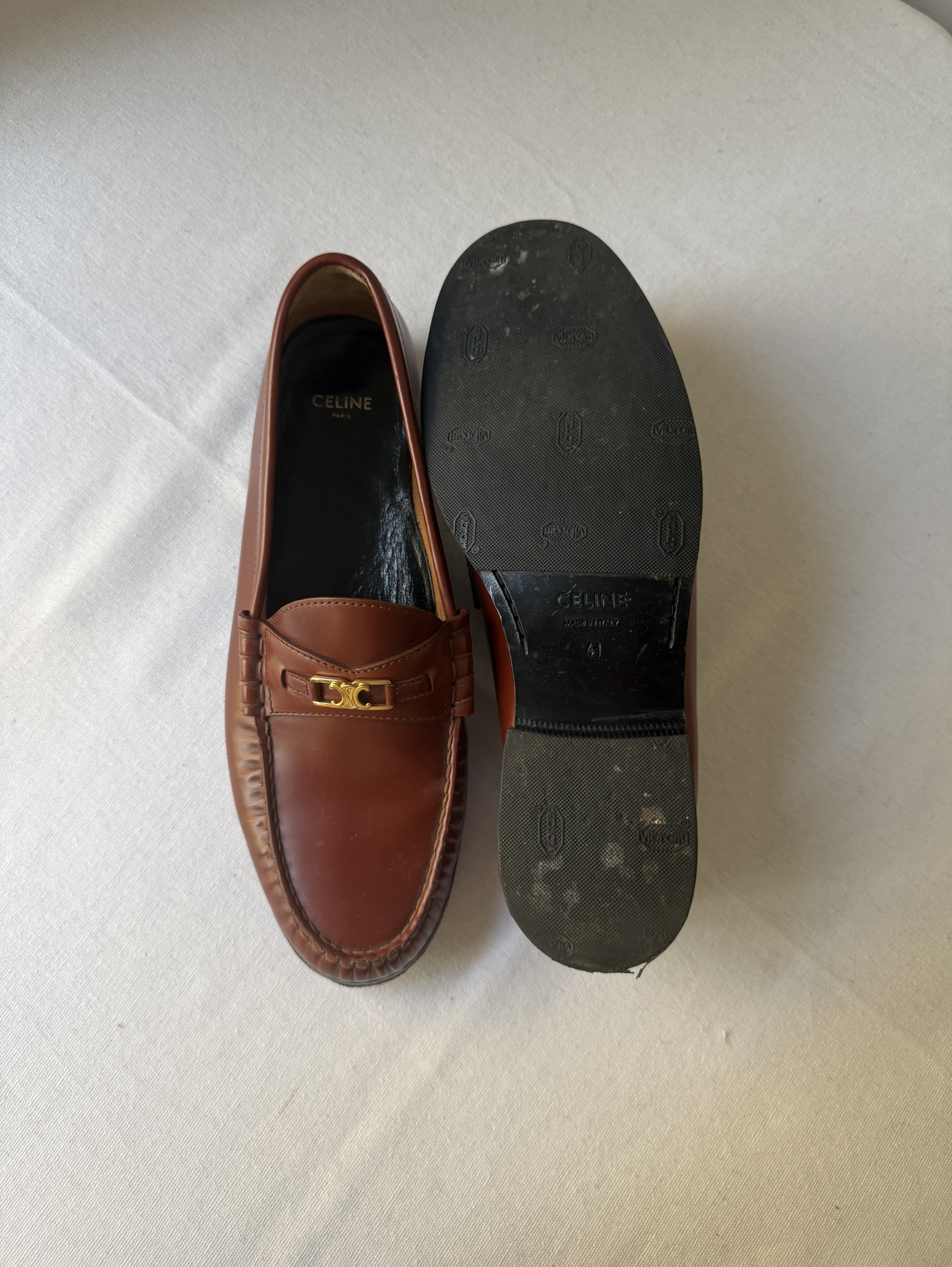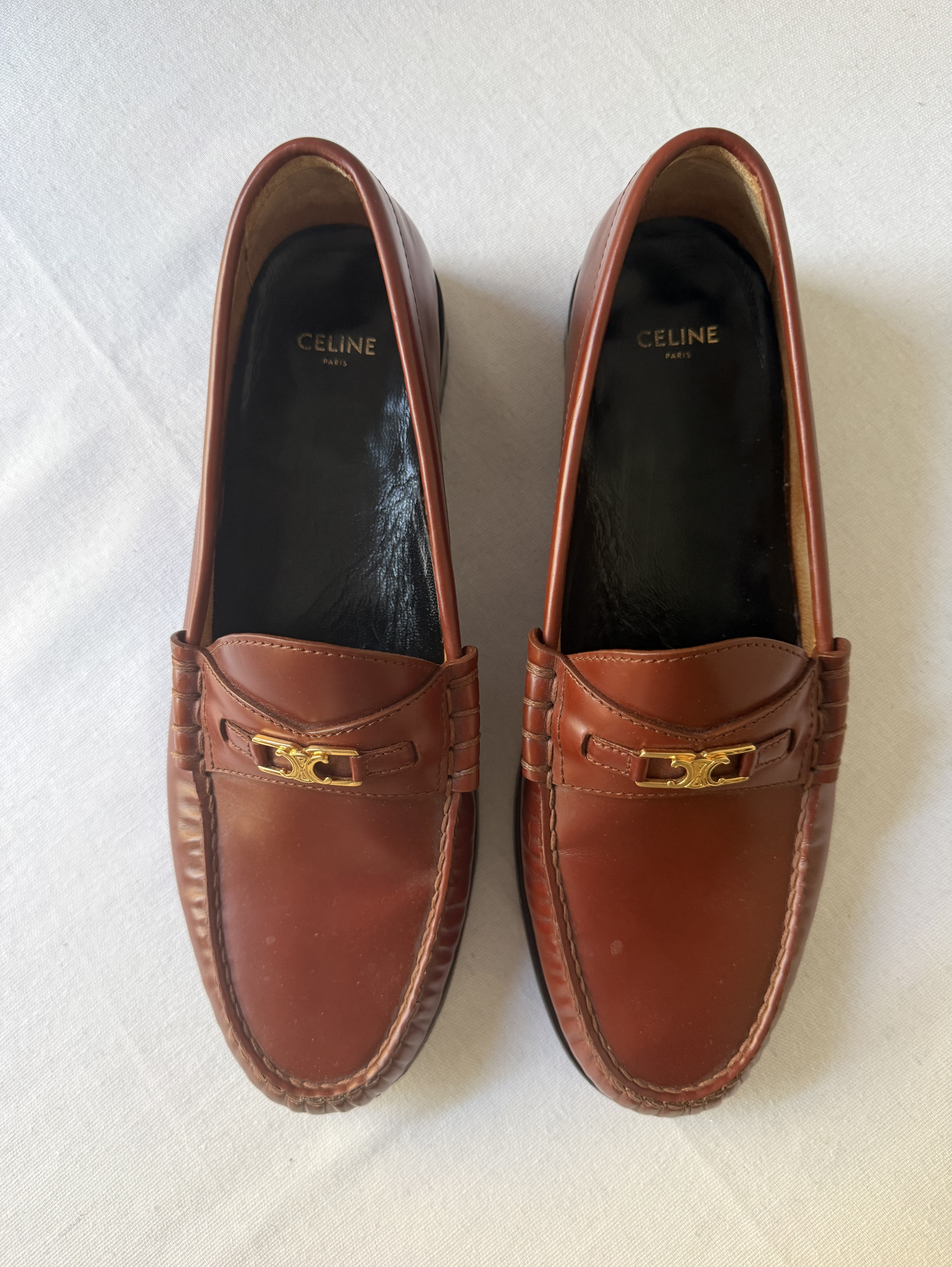 Classic leather round toe loafer with gold tone chain across the front.
