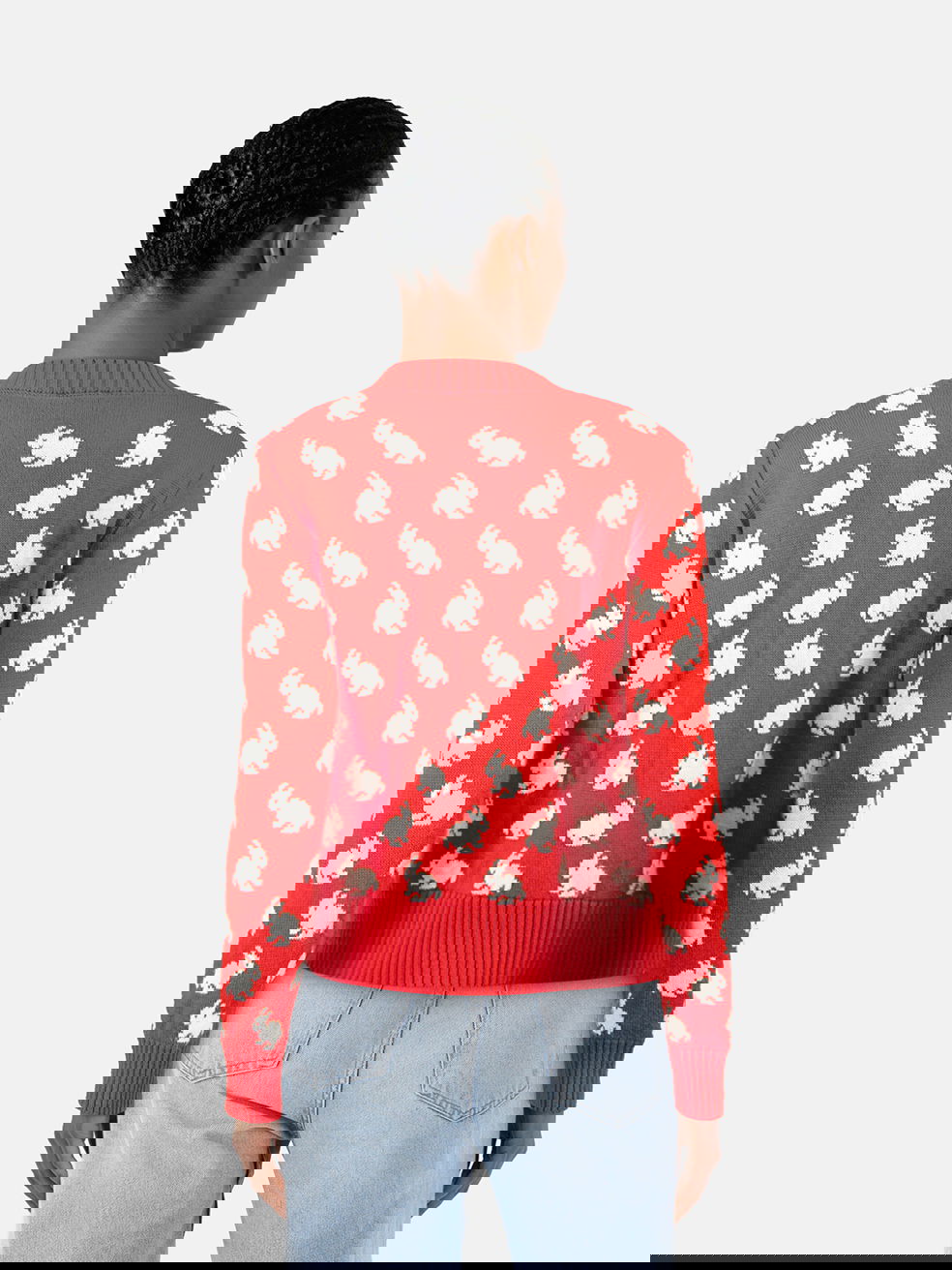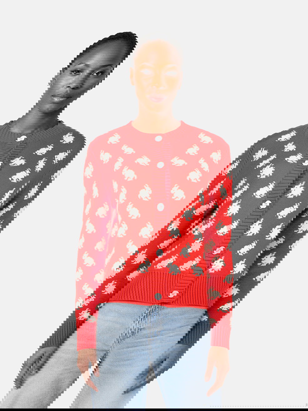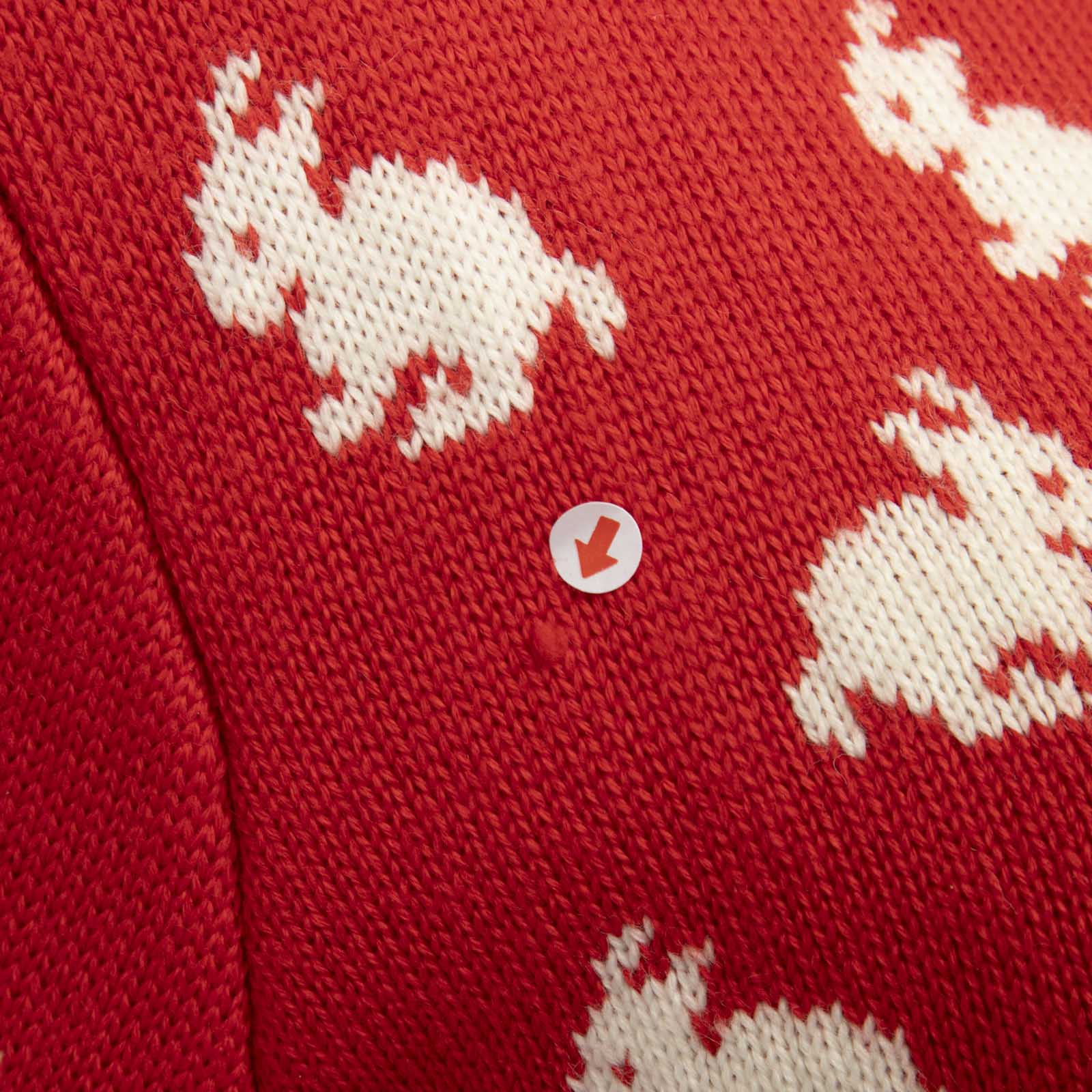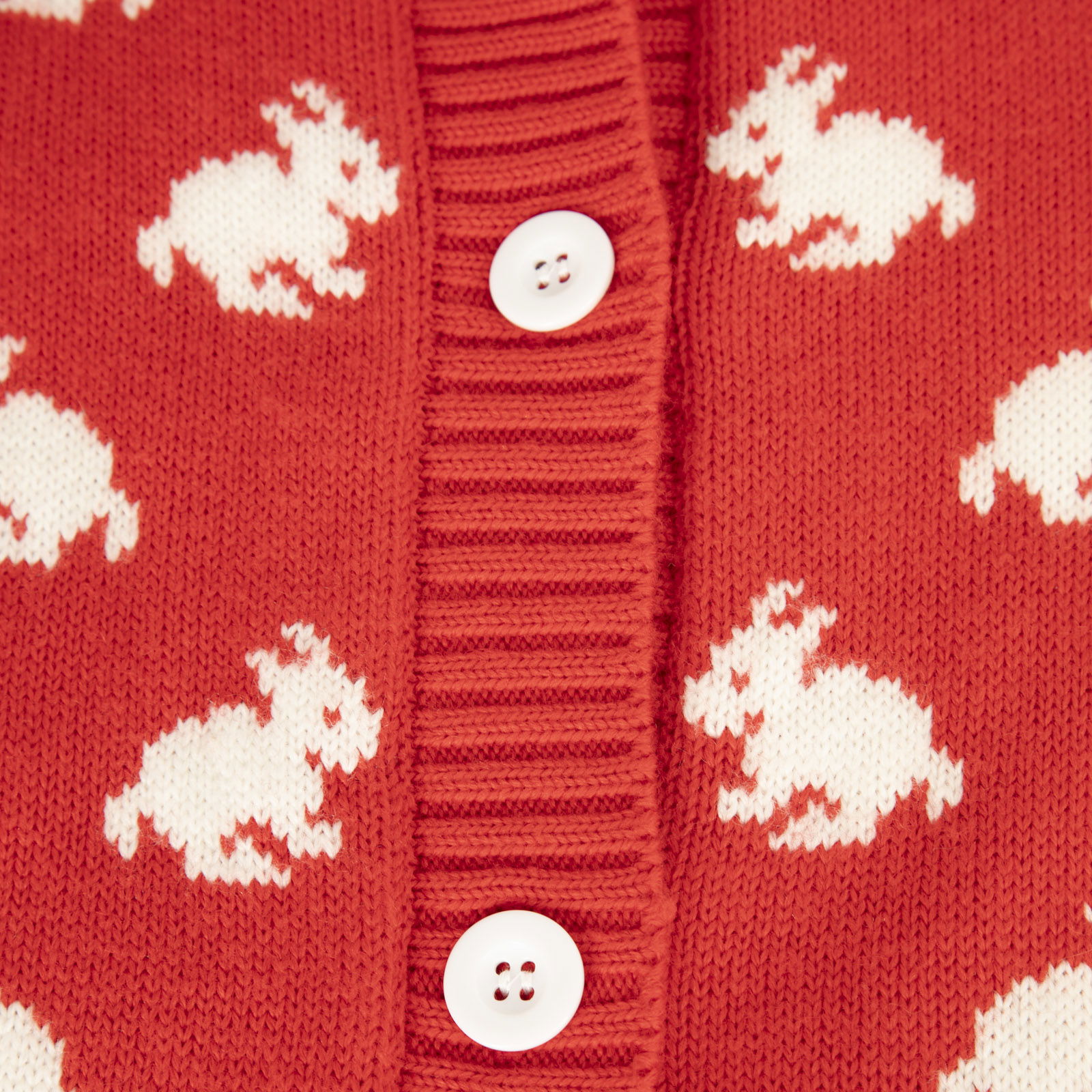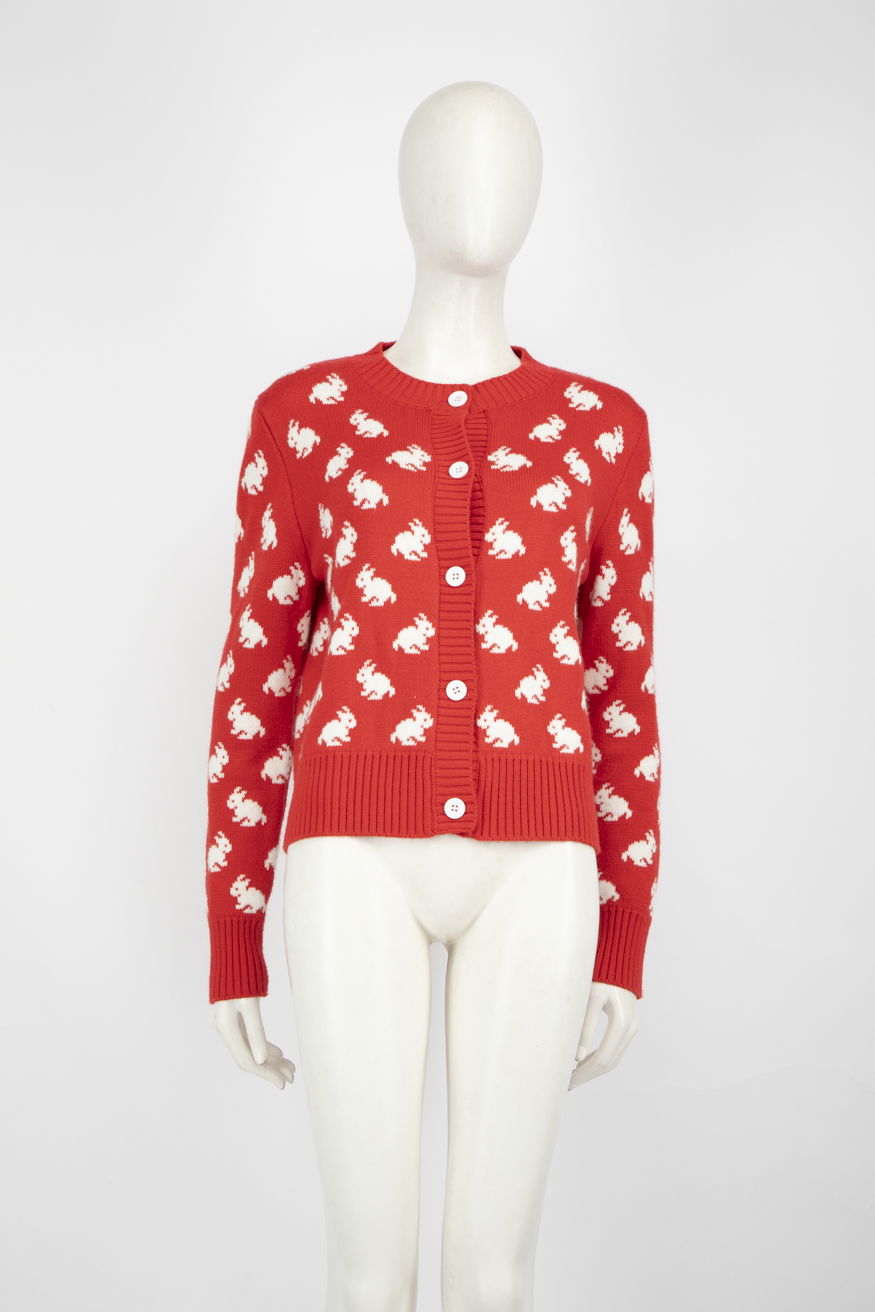 Red and white rabbit print cardigan in excellent, pre-worn condition. See images for signs of wear. Composition: 80% wool, 10% acrylic, 10% polyamide. Dry clean or hand wash. Measurements: shoulder 41cm, sleeves 64cm, bust 40cm, waist 49cm, length 58cm.