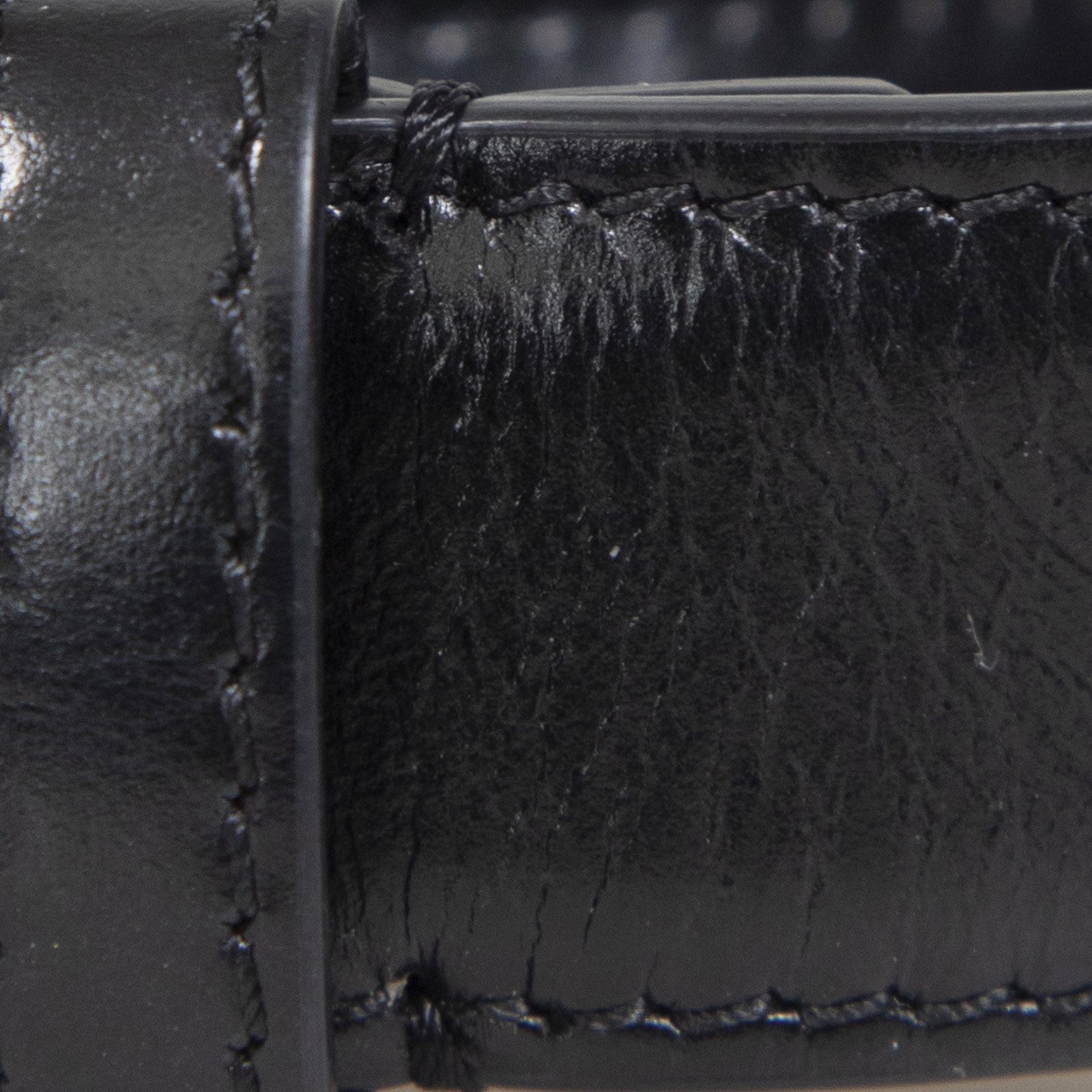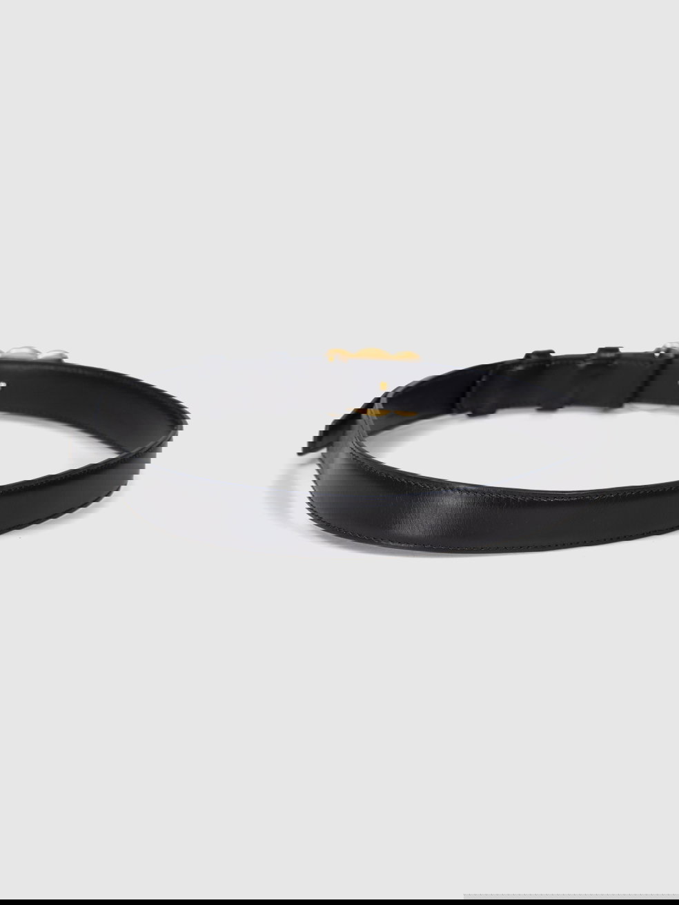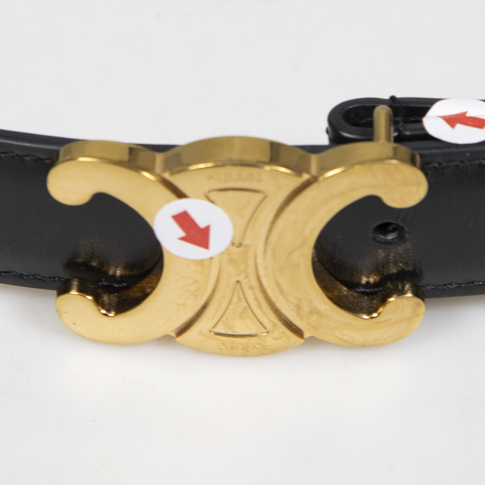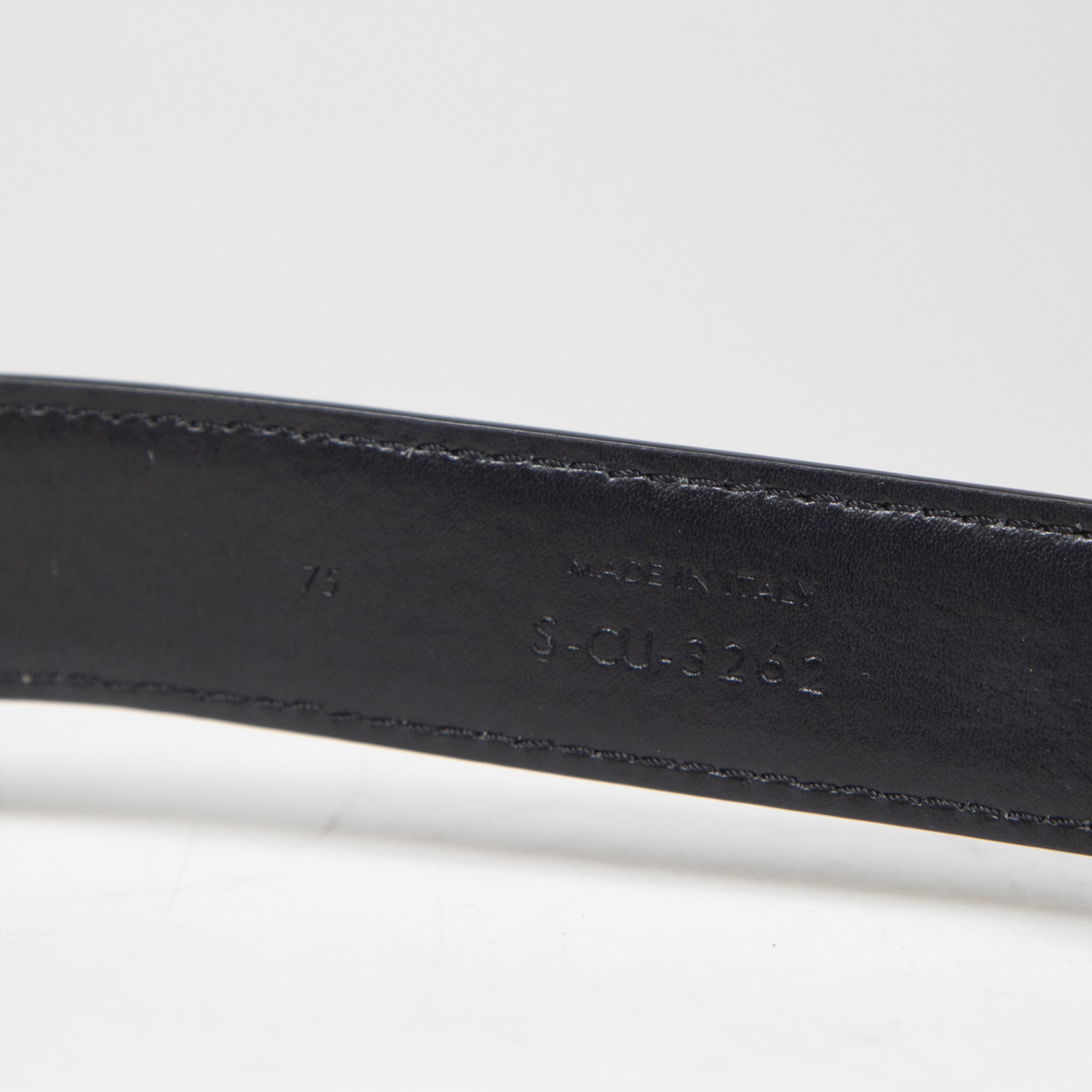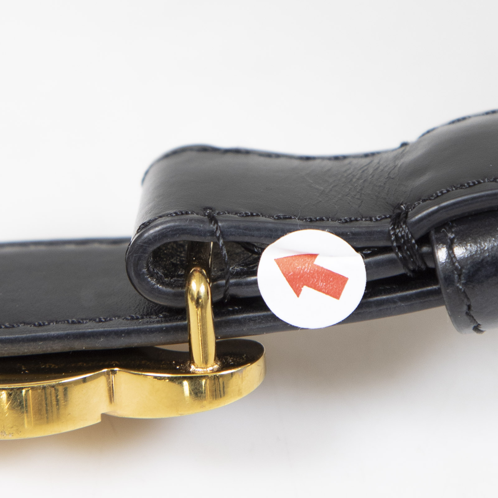 Black leather belt with gold hardware in excellent, pre-worn condition. See images for signs of wear. Measurements: length first hole 75cm, length last hole 65cm, full length 88cm, width 3cm.