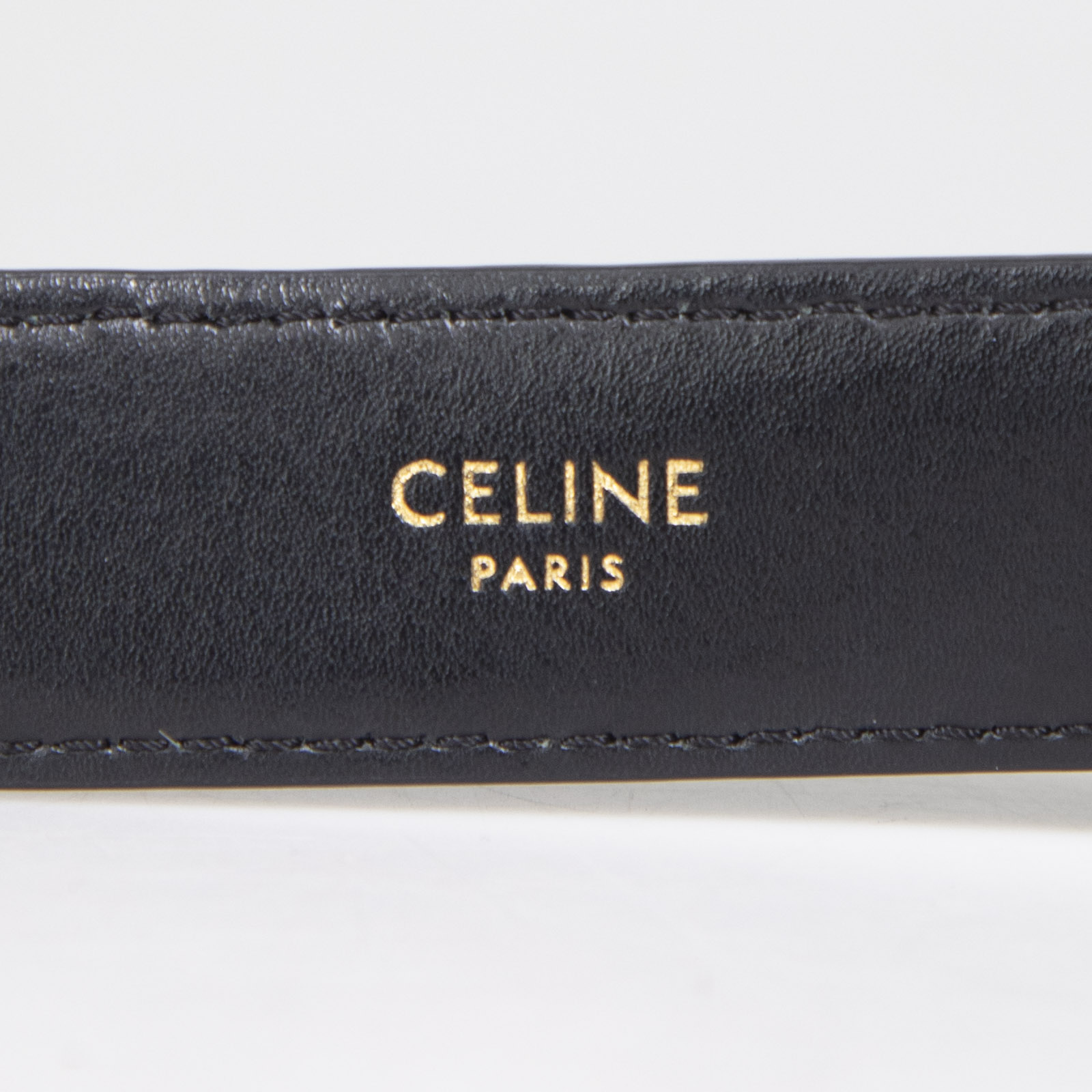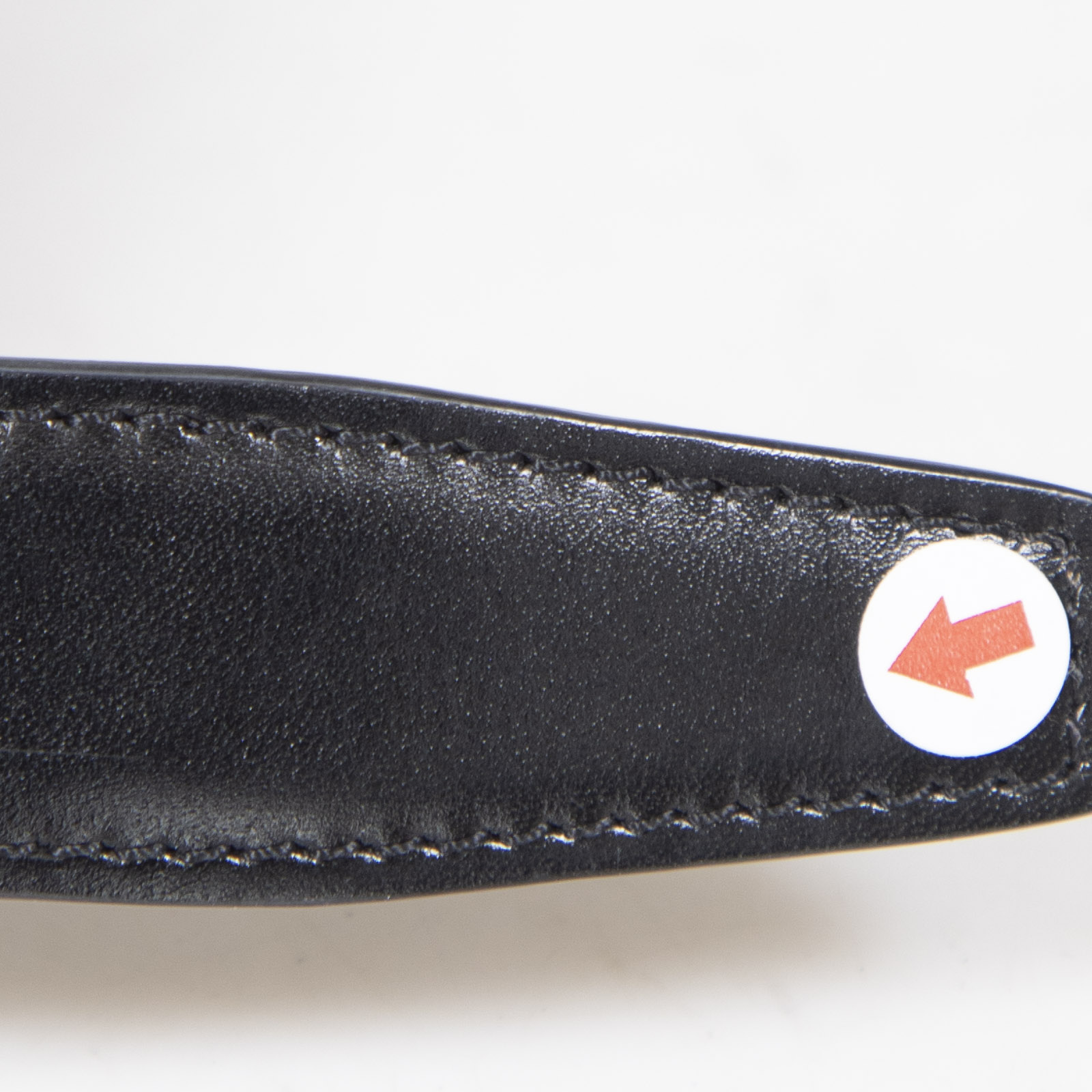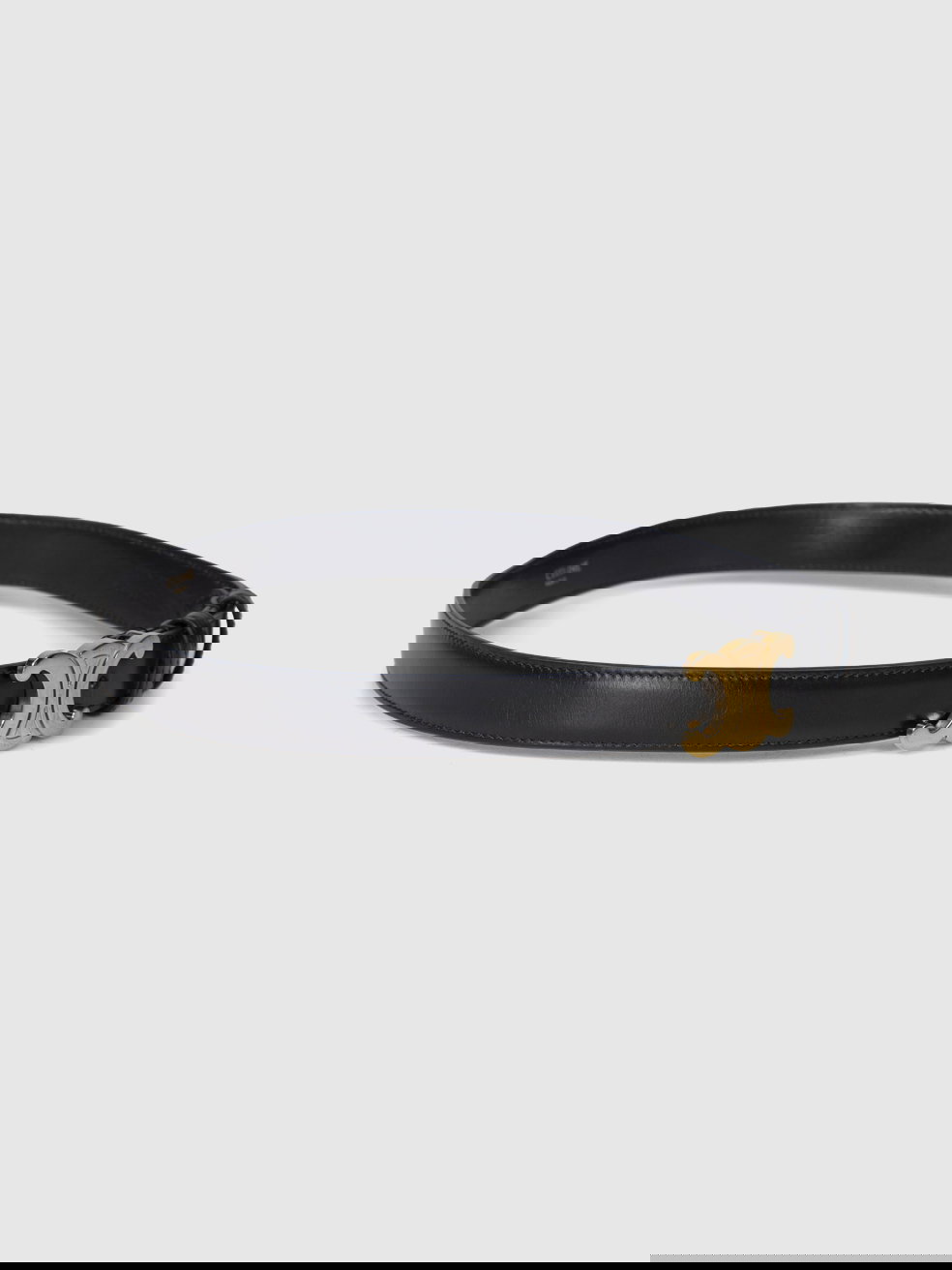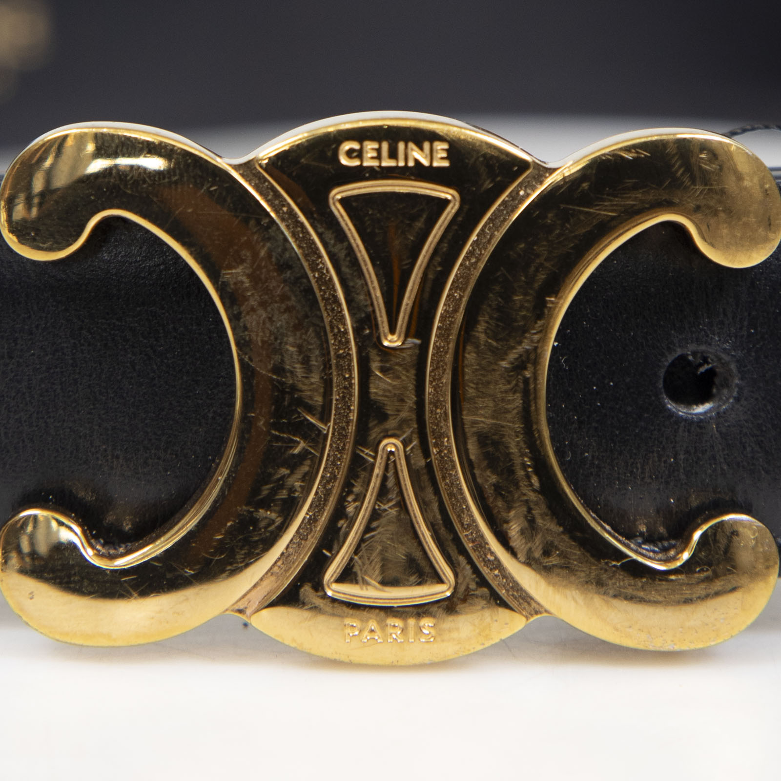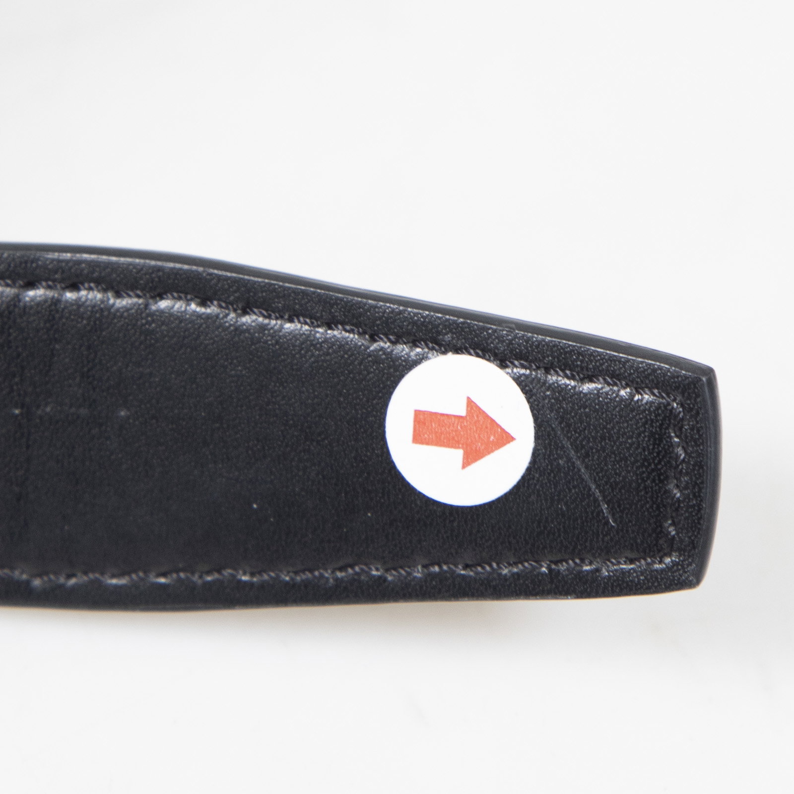Black leather belt with gold hardware in excellent, pre-worn condition. See images for signs of wear. Measurements: length first hole 75cm, length last hole 65cm, full length 88cm, width 3cm.