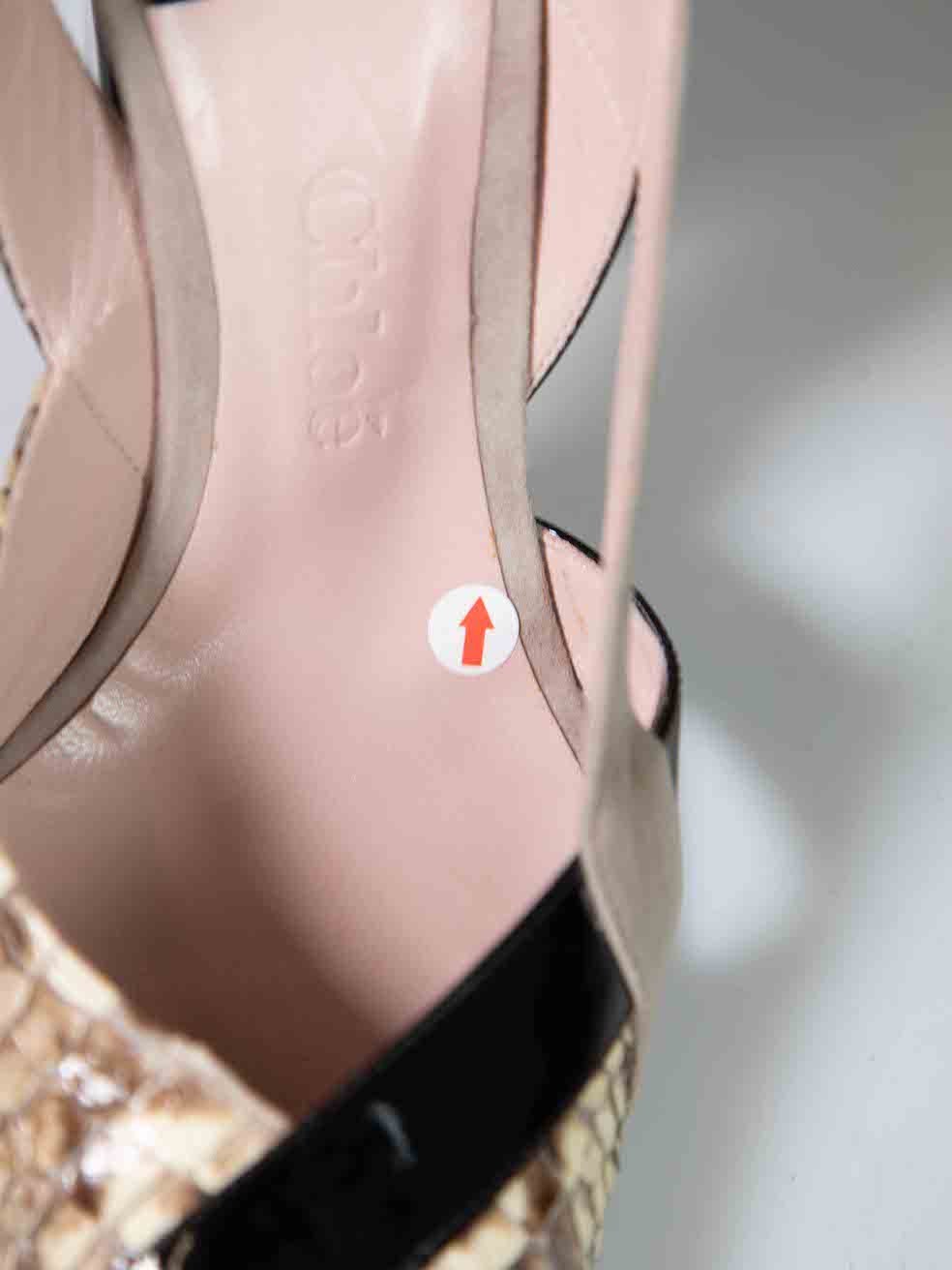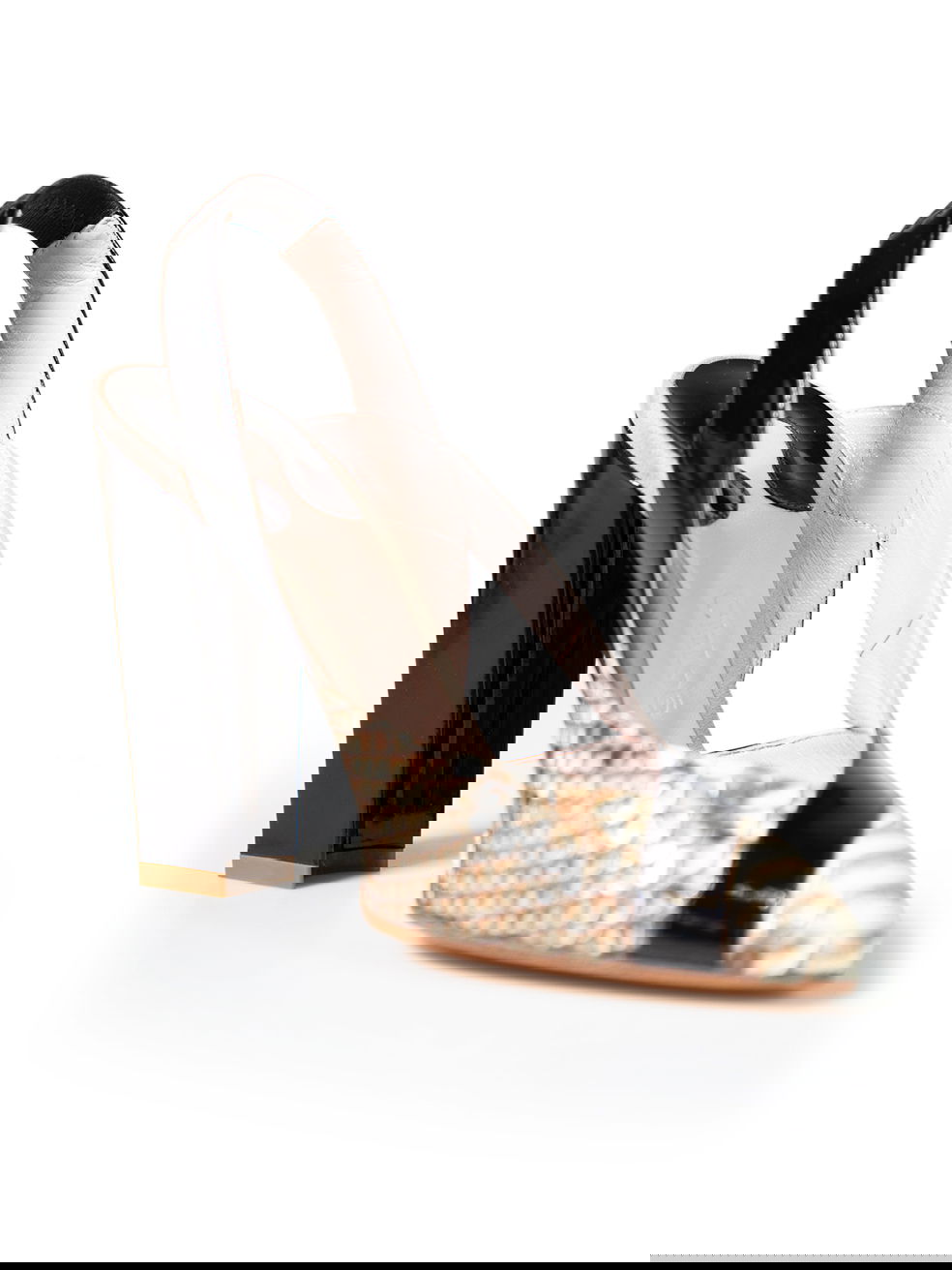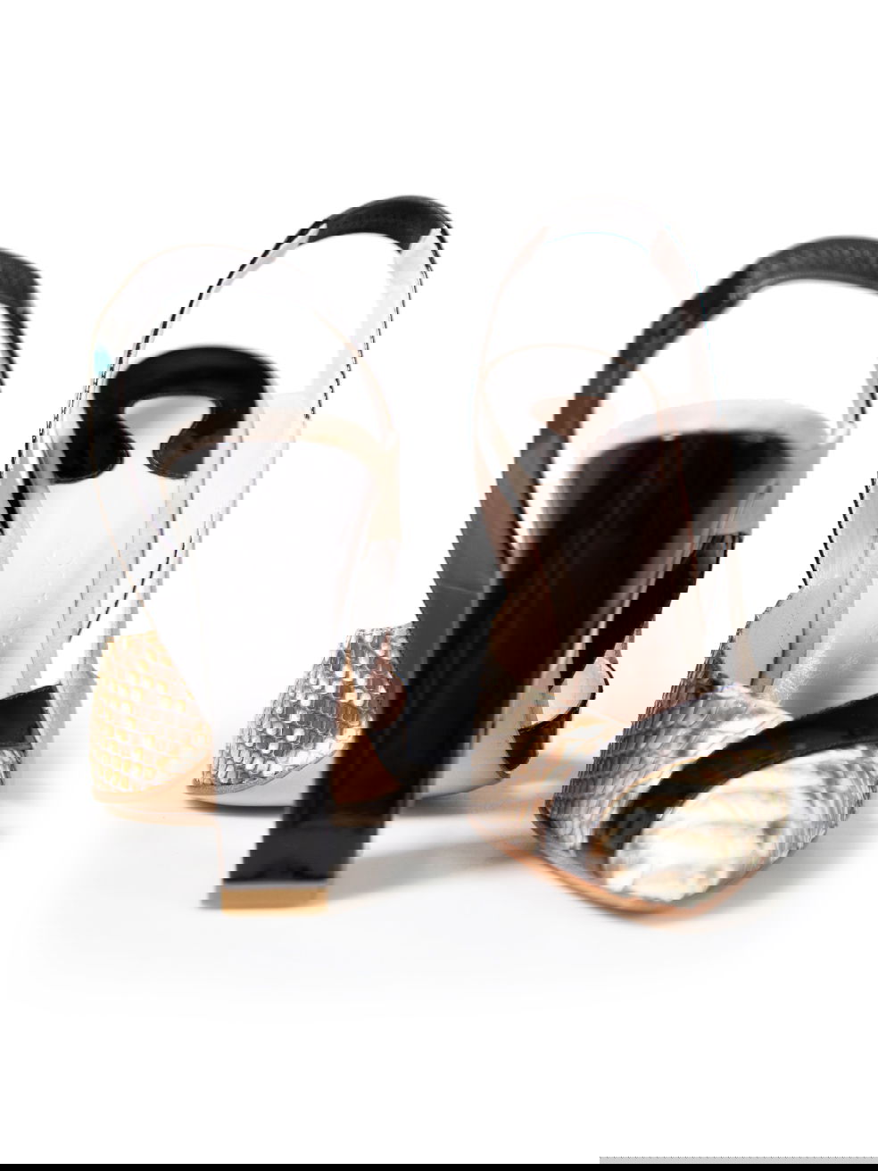 Snakeskin and black leather high-heeled slingbacks in excellent, pre-worn condition. Comes with original dust bag and box. Composition: python, leather. Heel height 116mm.