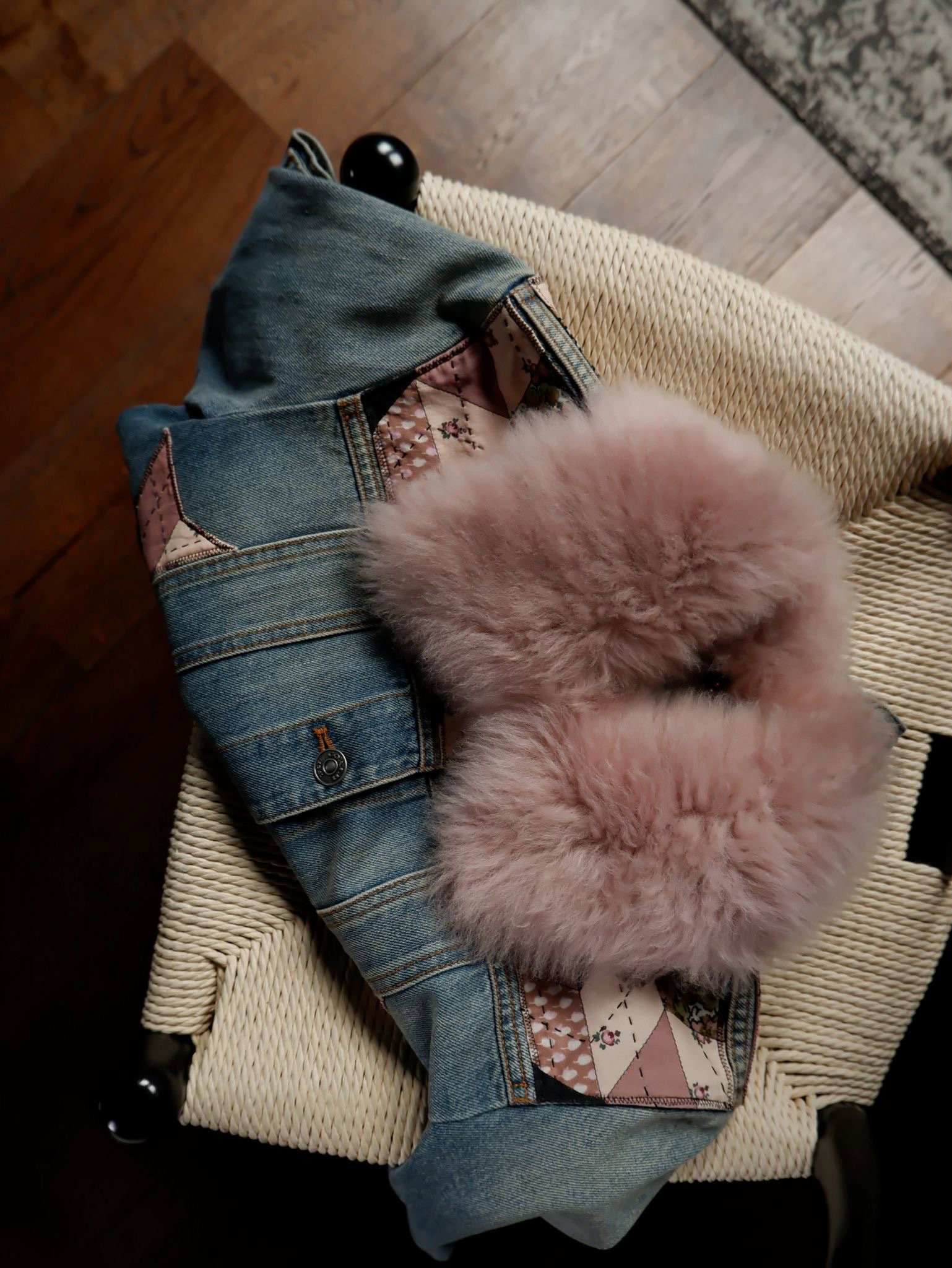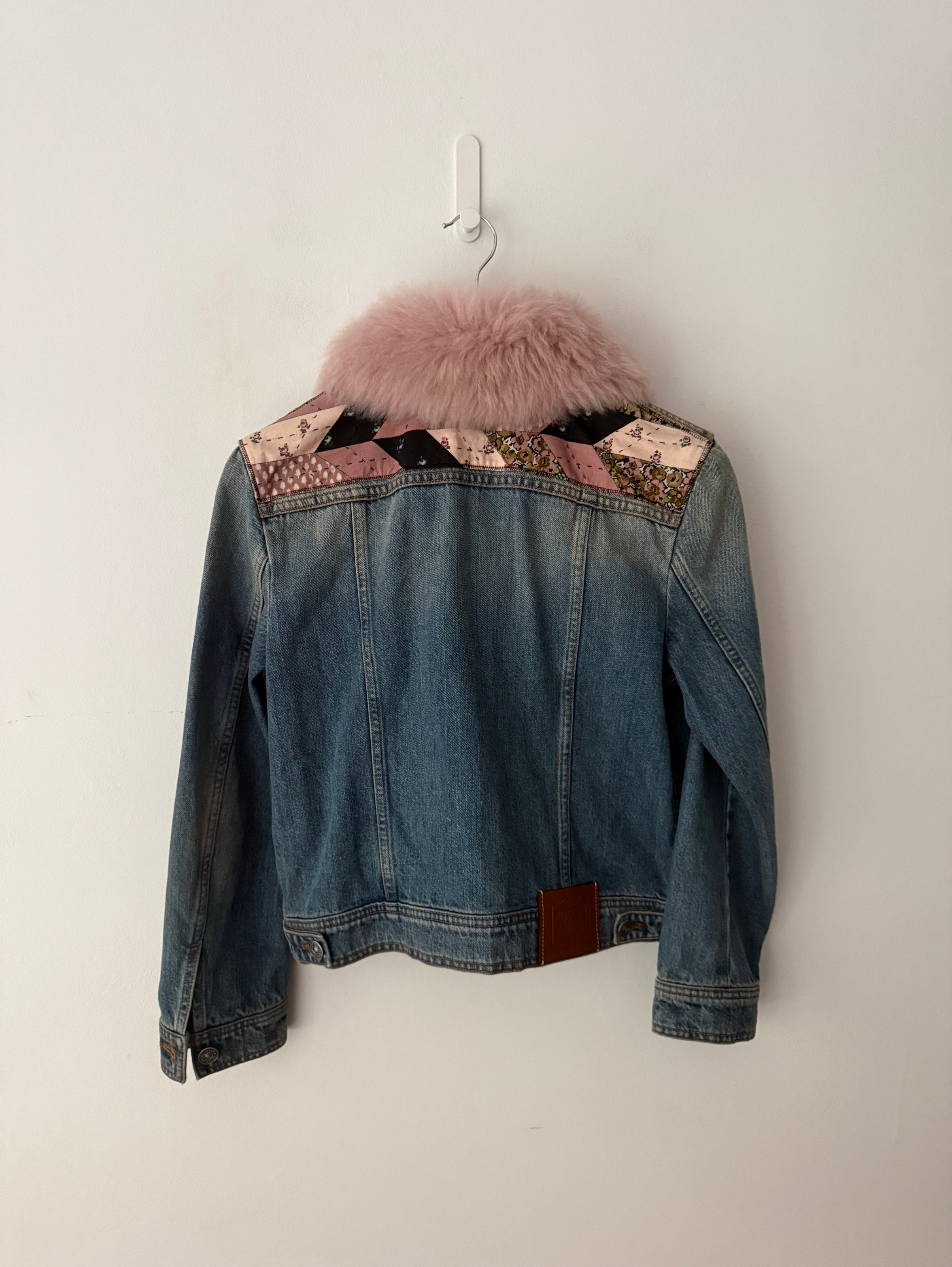 Quilted Denim Patchwork Denim Jacket with a removable pink shearling (lamb fur) collar. This style features a prairie patchwork design inspired by vintage american quilts.