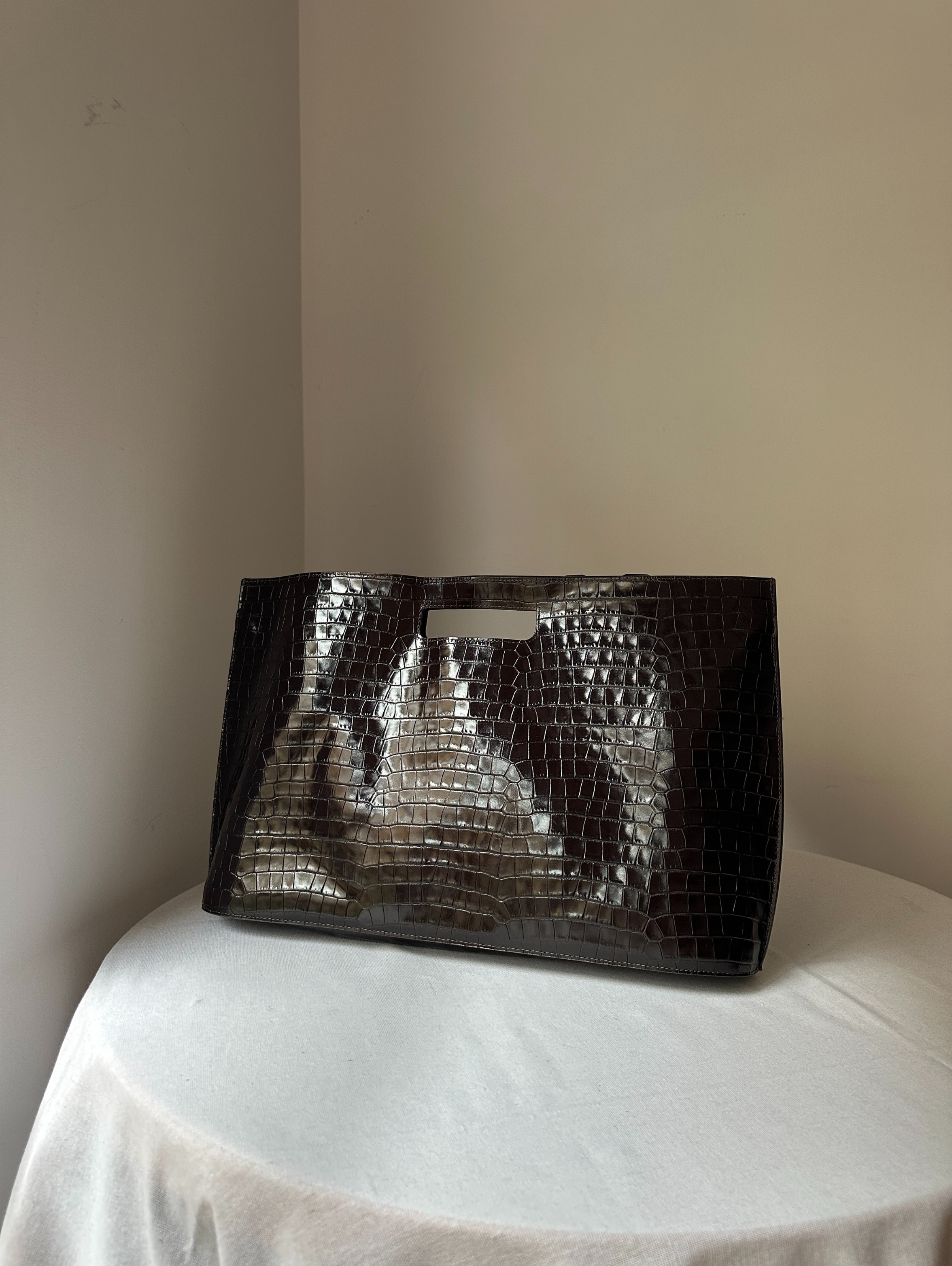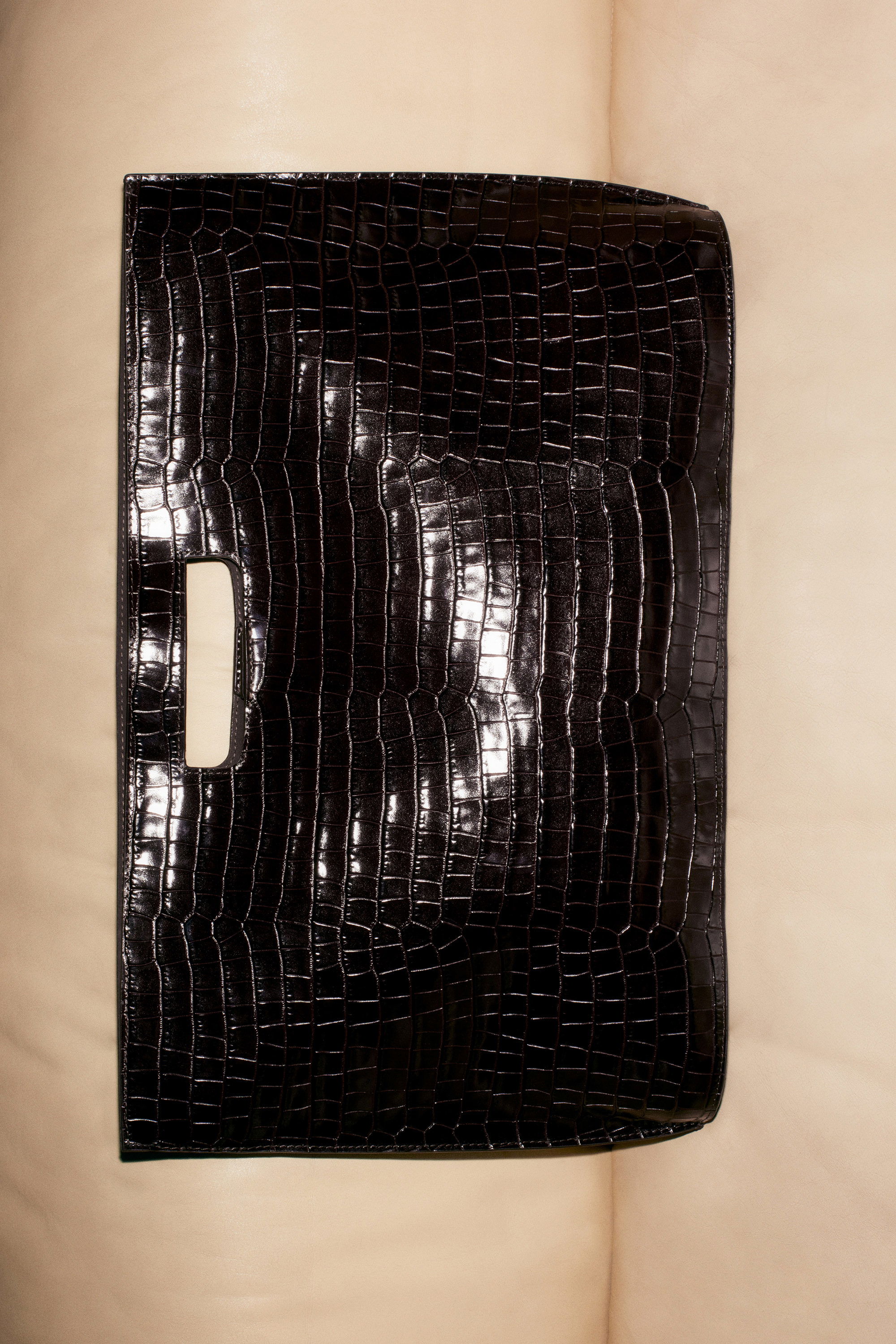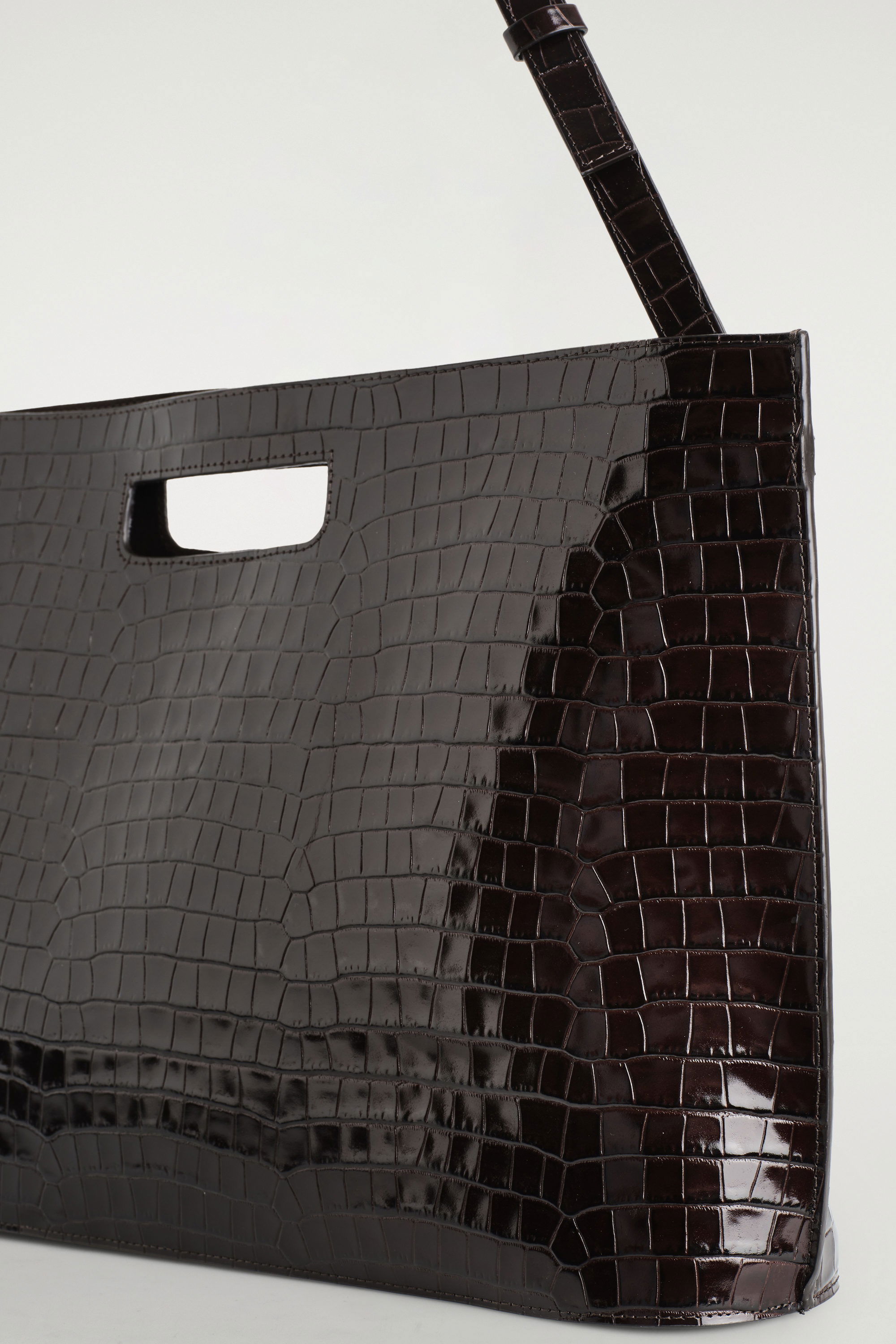 Introducing the Folio bag: revisited from the COS archive, renewed for the upcoming season. This oversized version is crafted from the most supple crocodile-effect leather and retains its distinctive, slim silhouette with angular sides and an oval-shaped base. Style it across the body or carry it by the cutout handle.