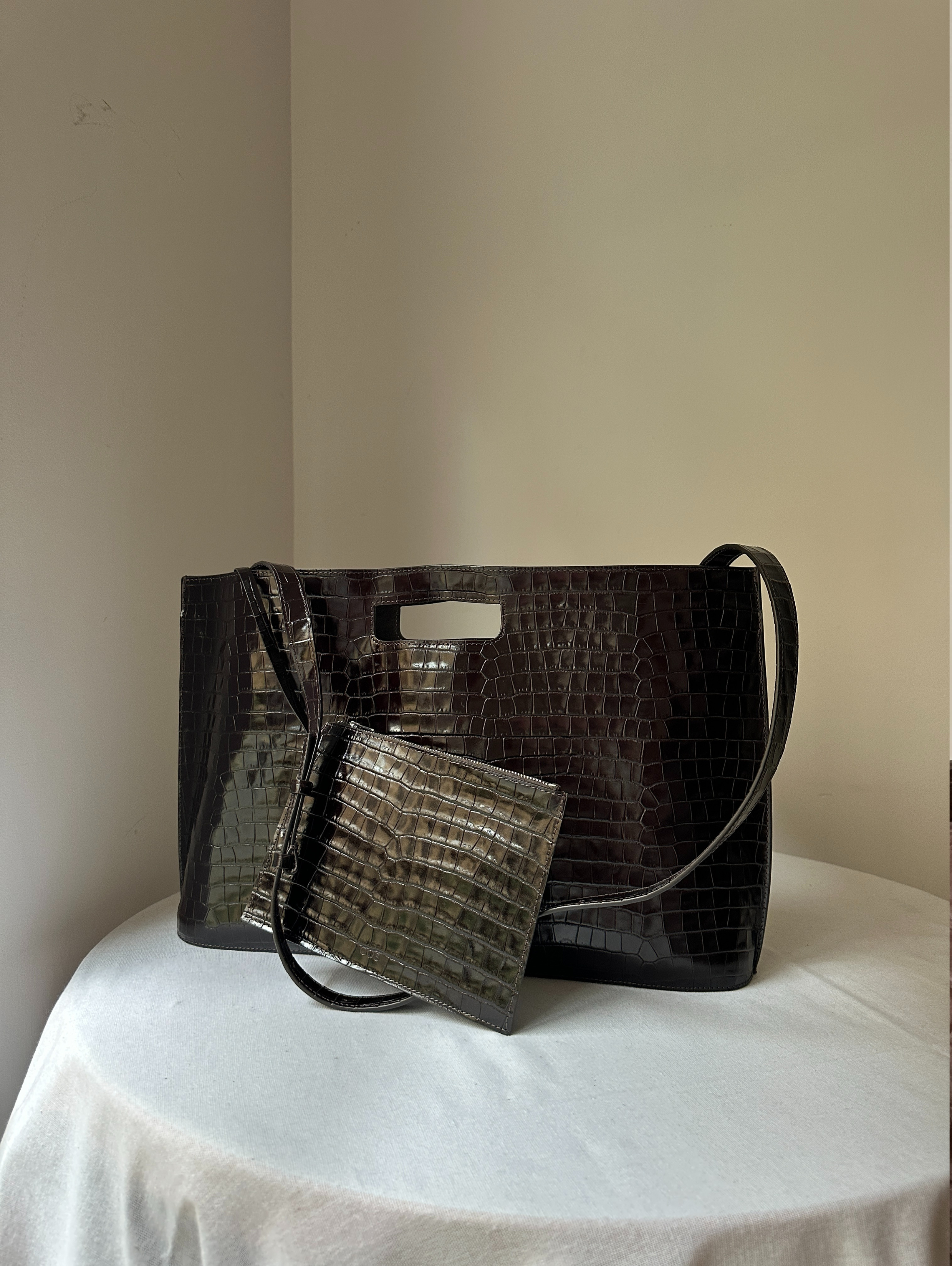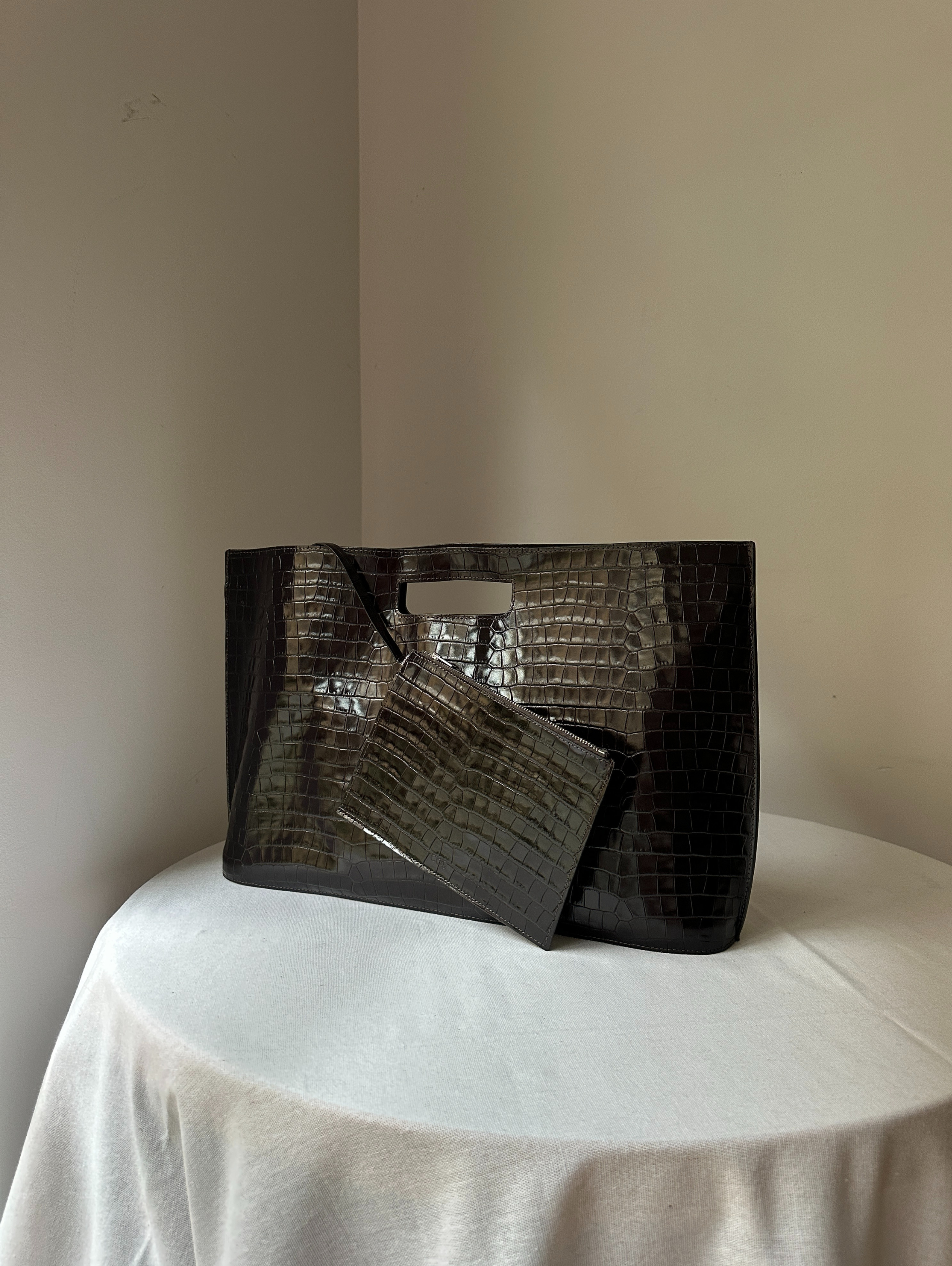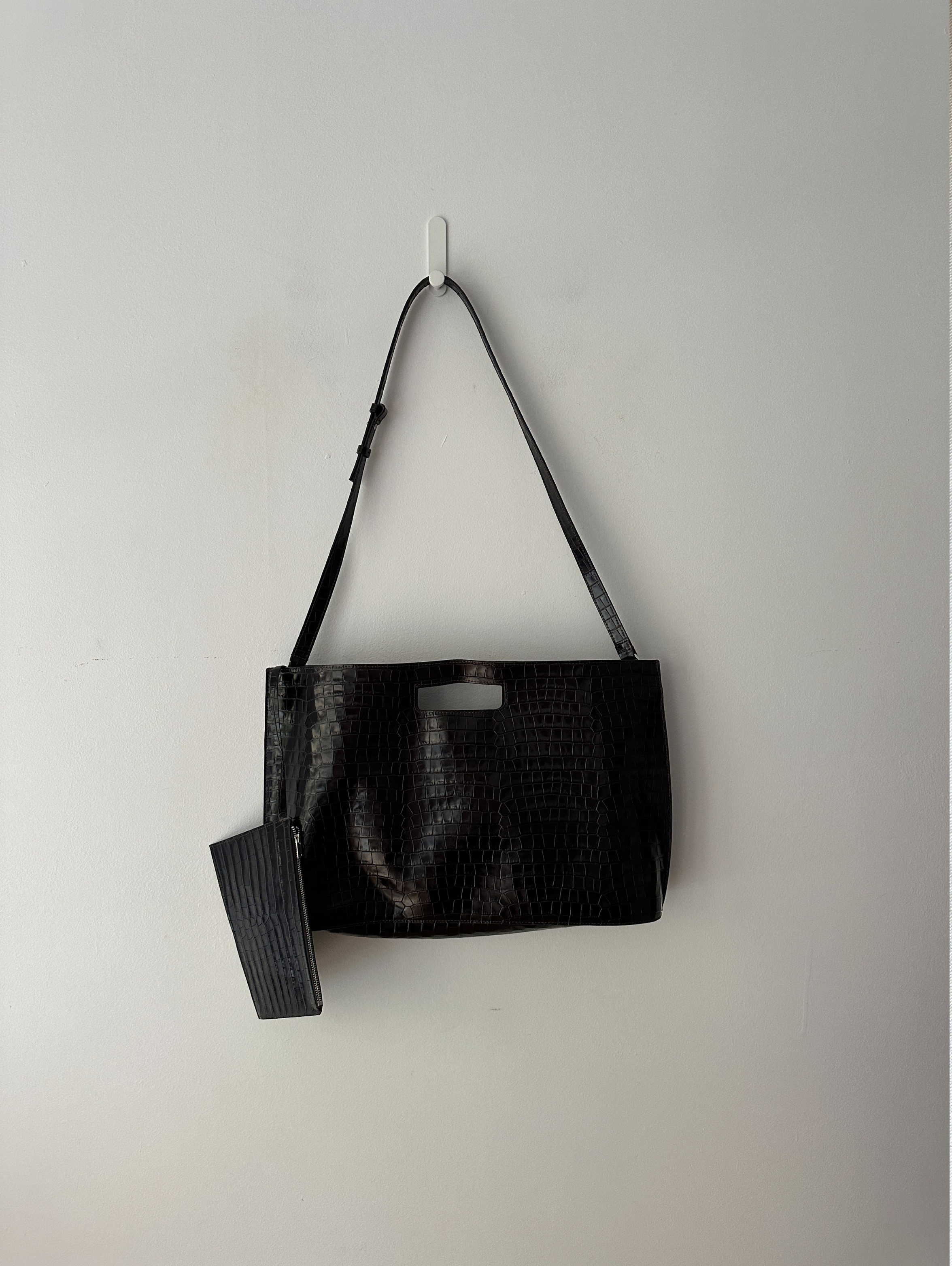 Introducing the Folio bag: revisited from the COS archive, renewed for the upcoming season. This oversized version is crafted from the most supple crocodile-effect leather and retains its distinctive, slim silhouette with angular sides and an oval-shaped base. Style it across the body or carry it by the cutout handle.