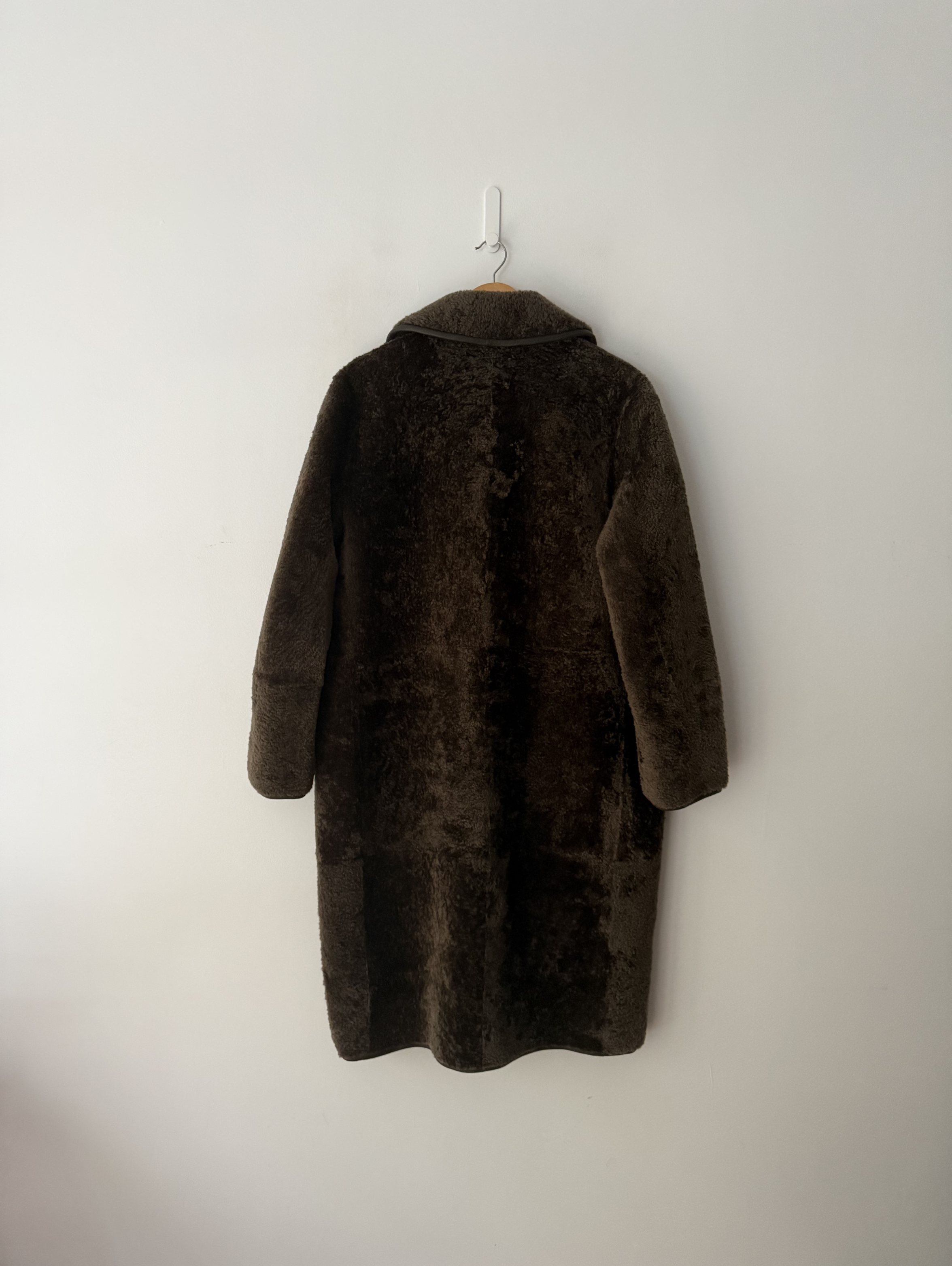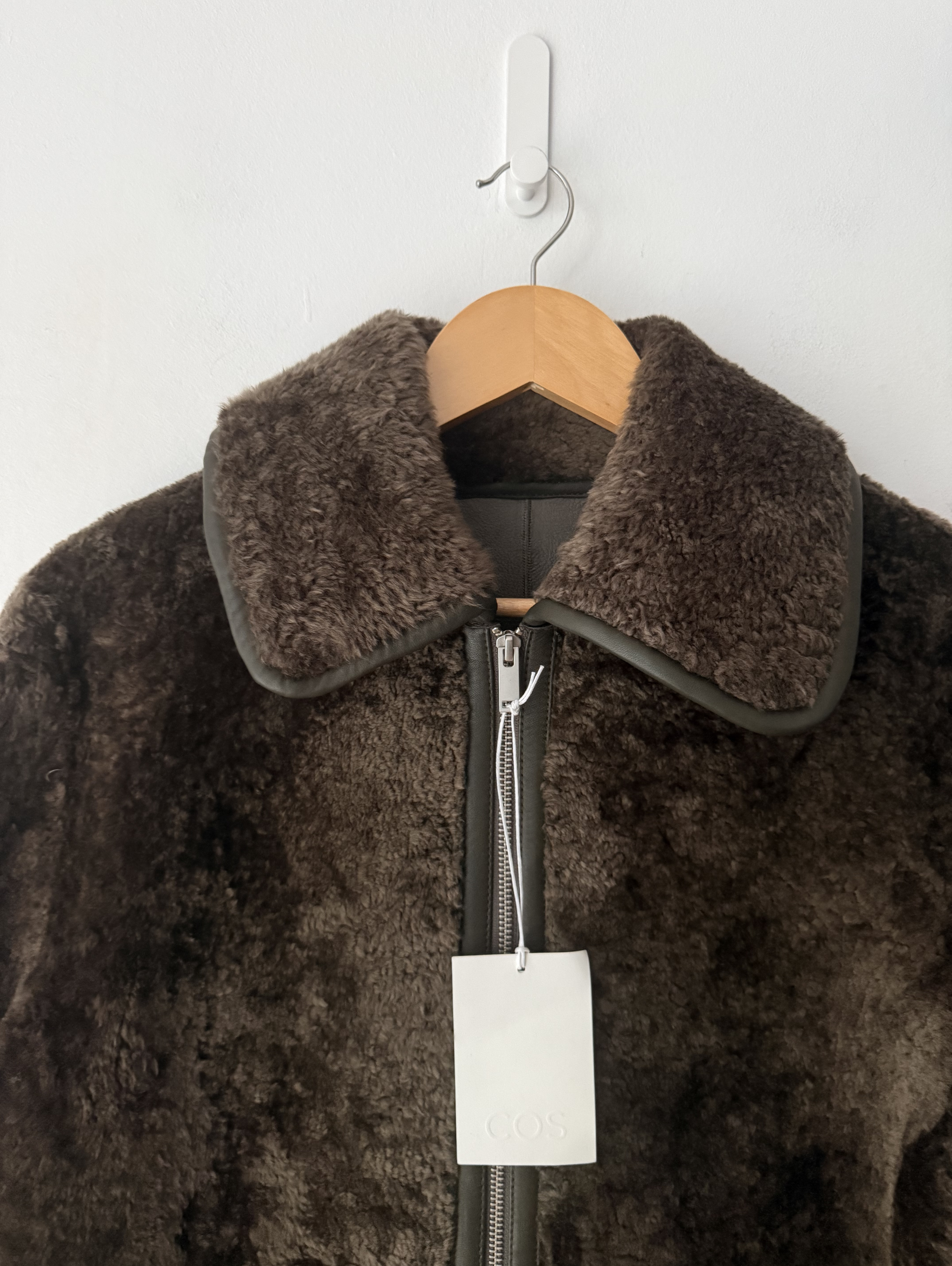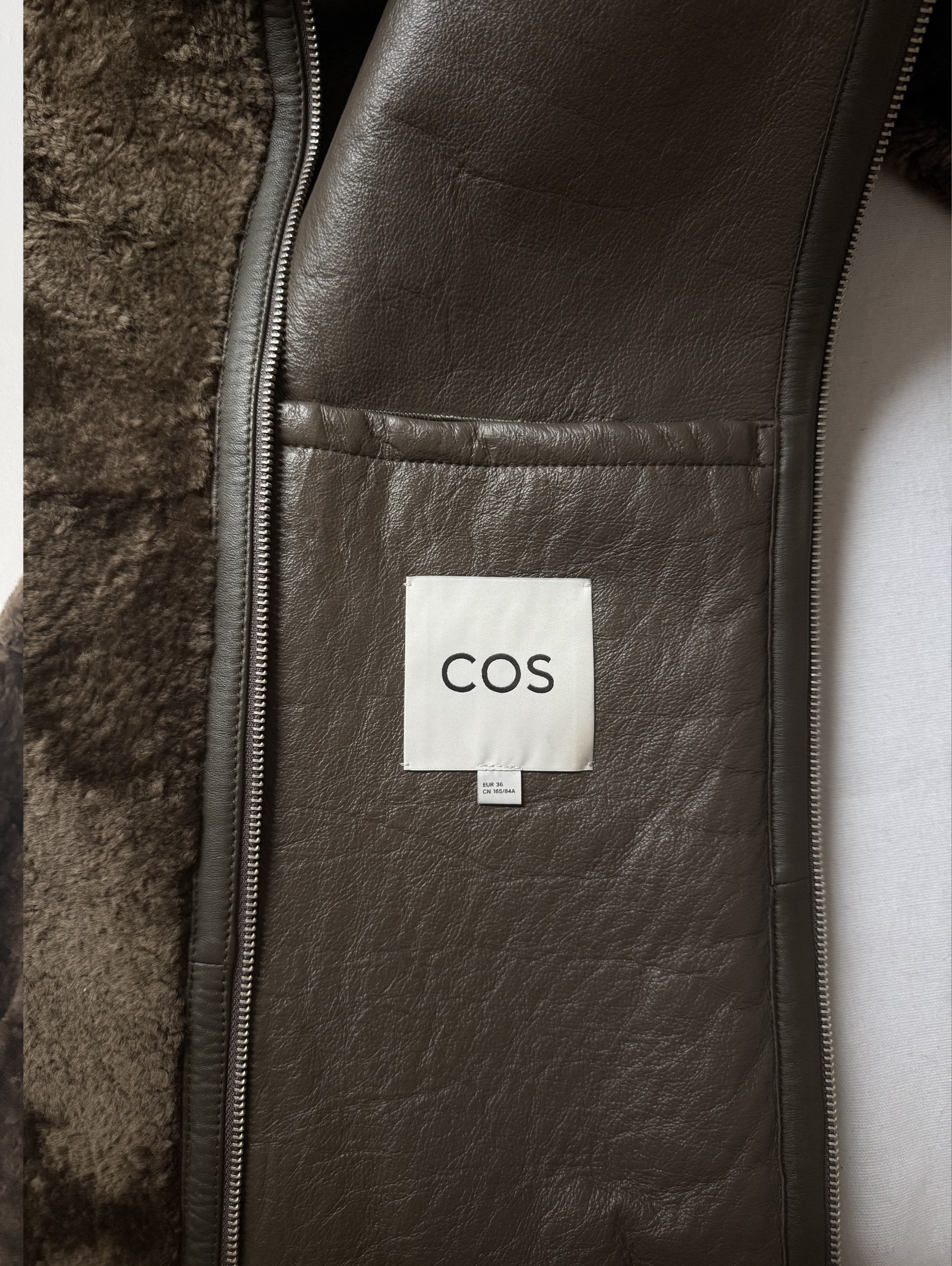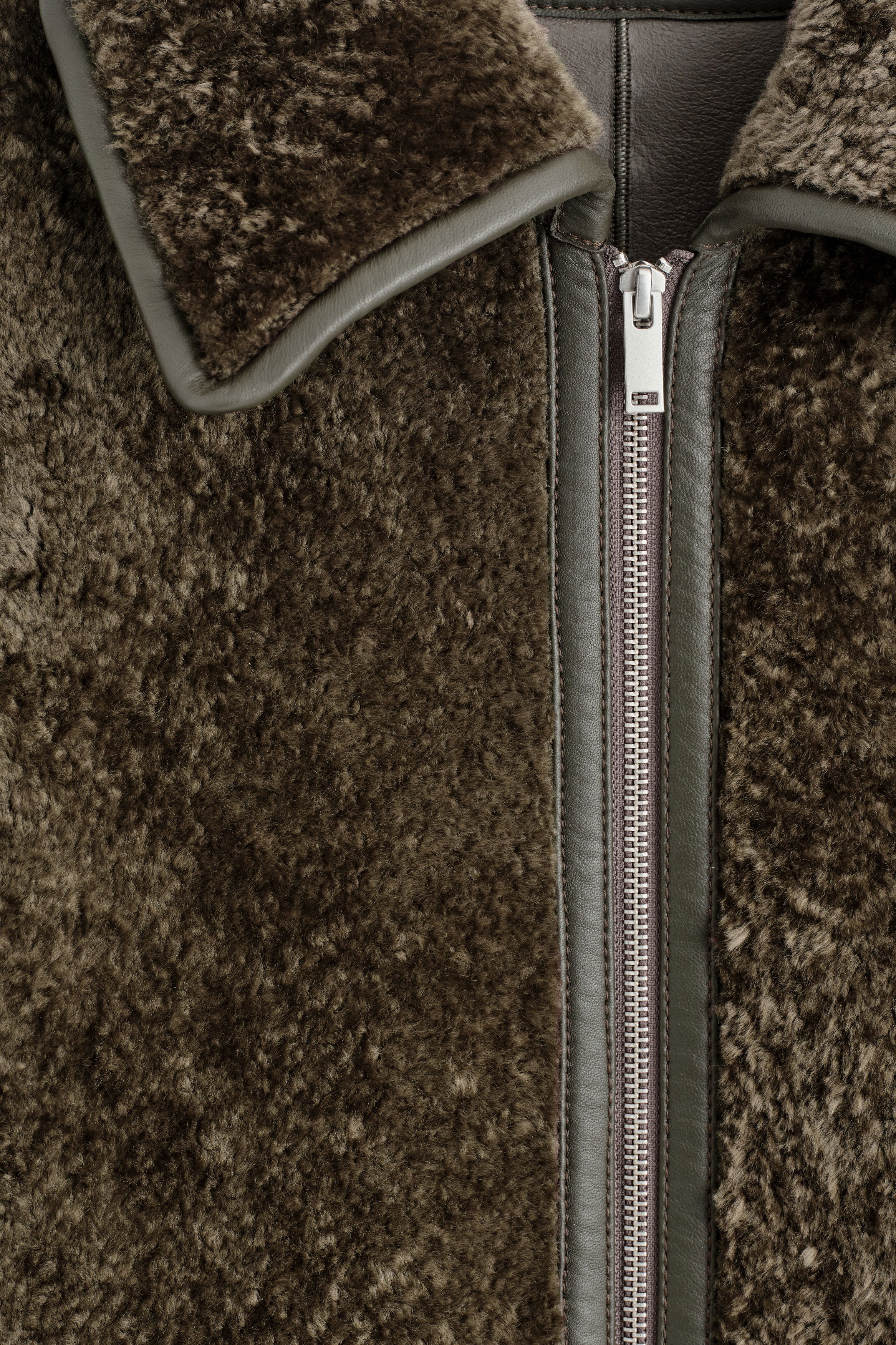 Introducing the COS shearling coat: a wardrobe icon for the autumn/winter season. This longline piece is crafted from premium lambskin hide in a rich khaki tone and features bonded-leather edges for a luxurious finish. It's detailed with a double-ended zip, side pockets and additional pockets inside.