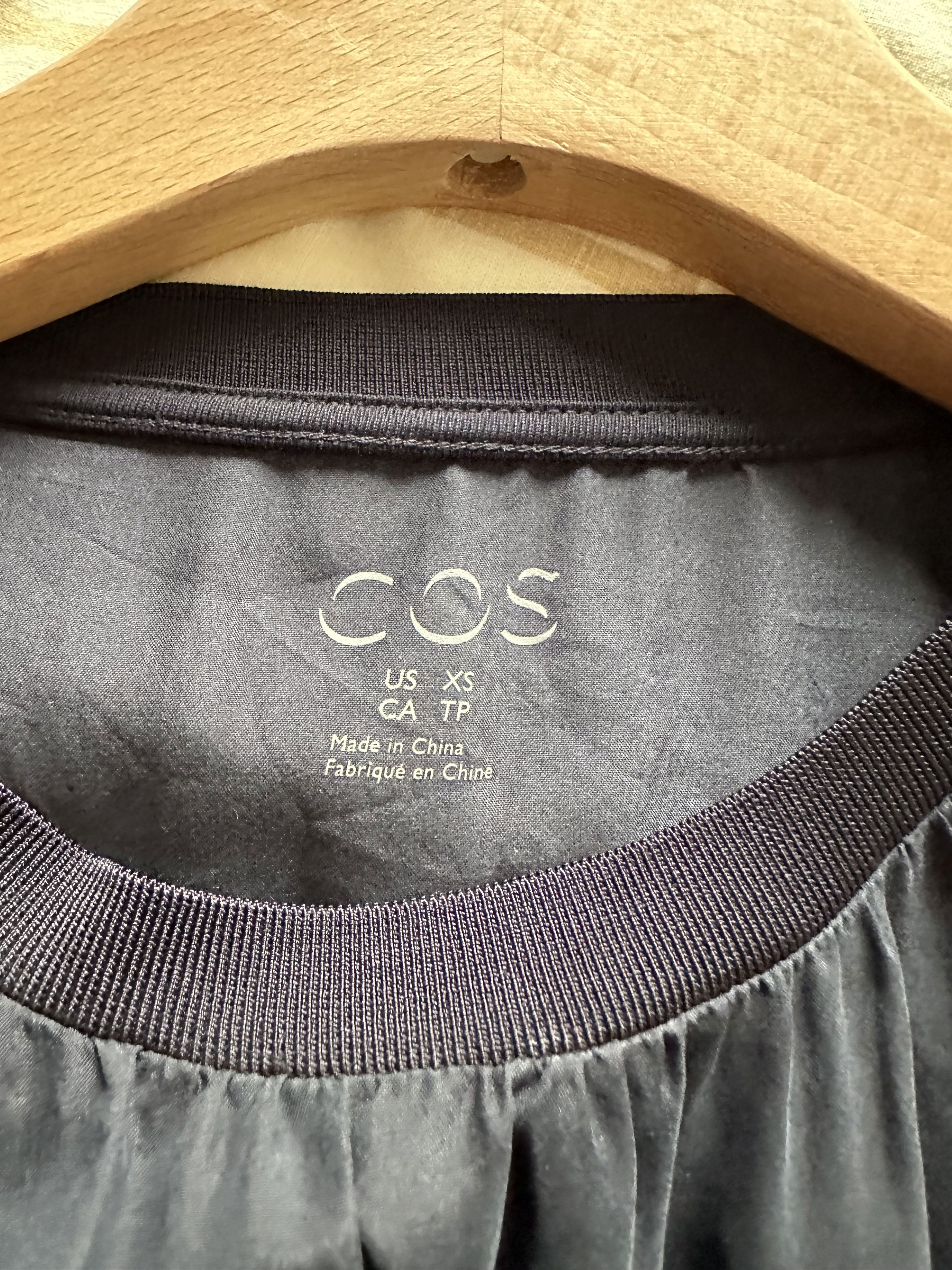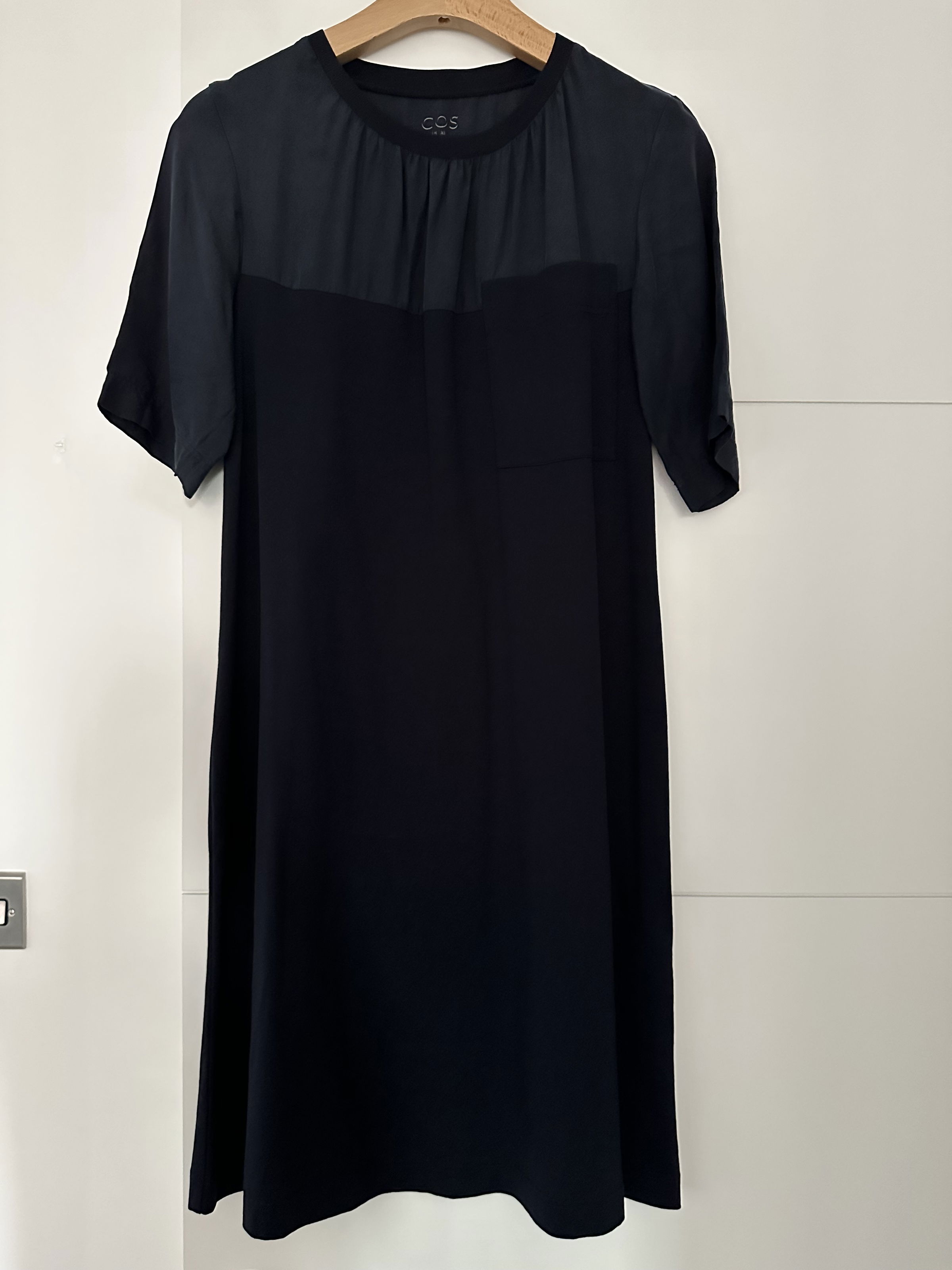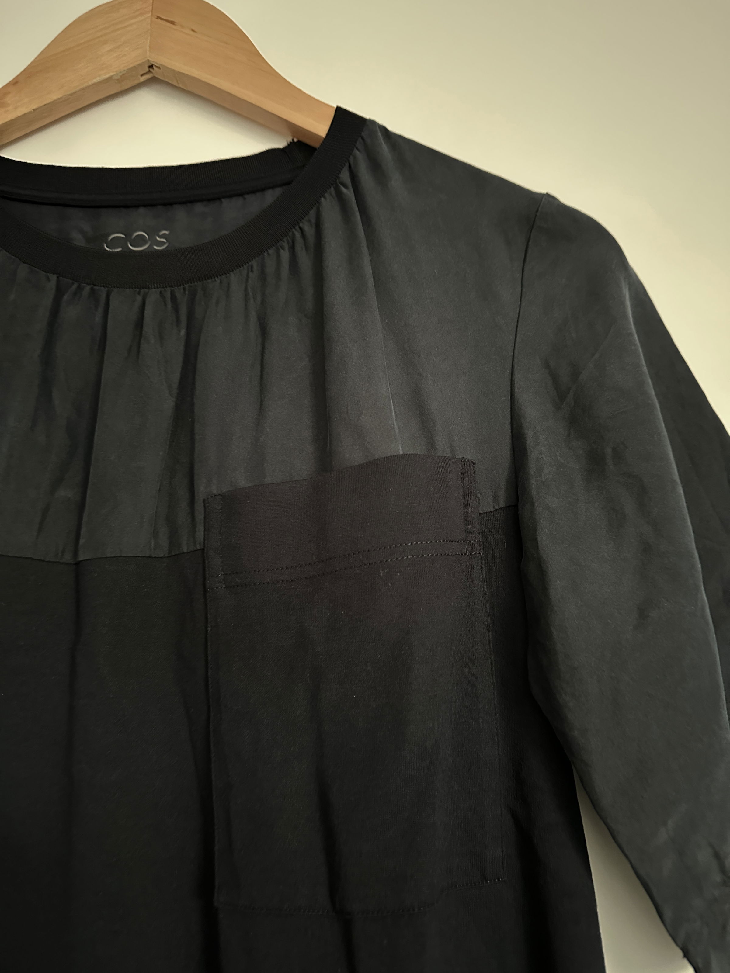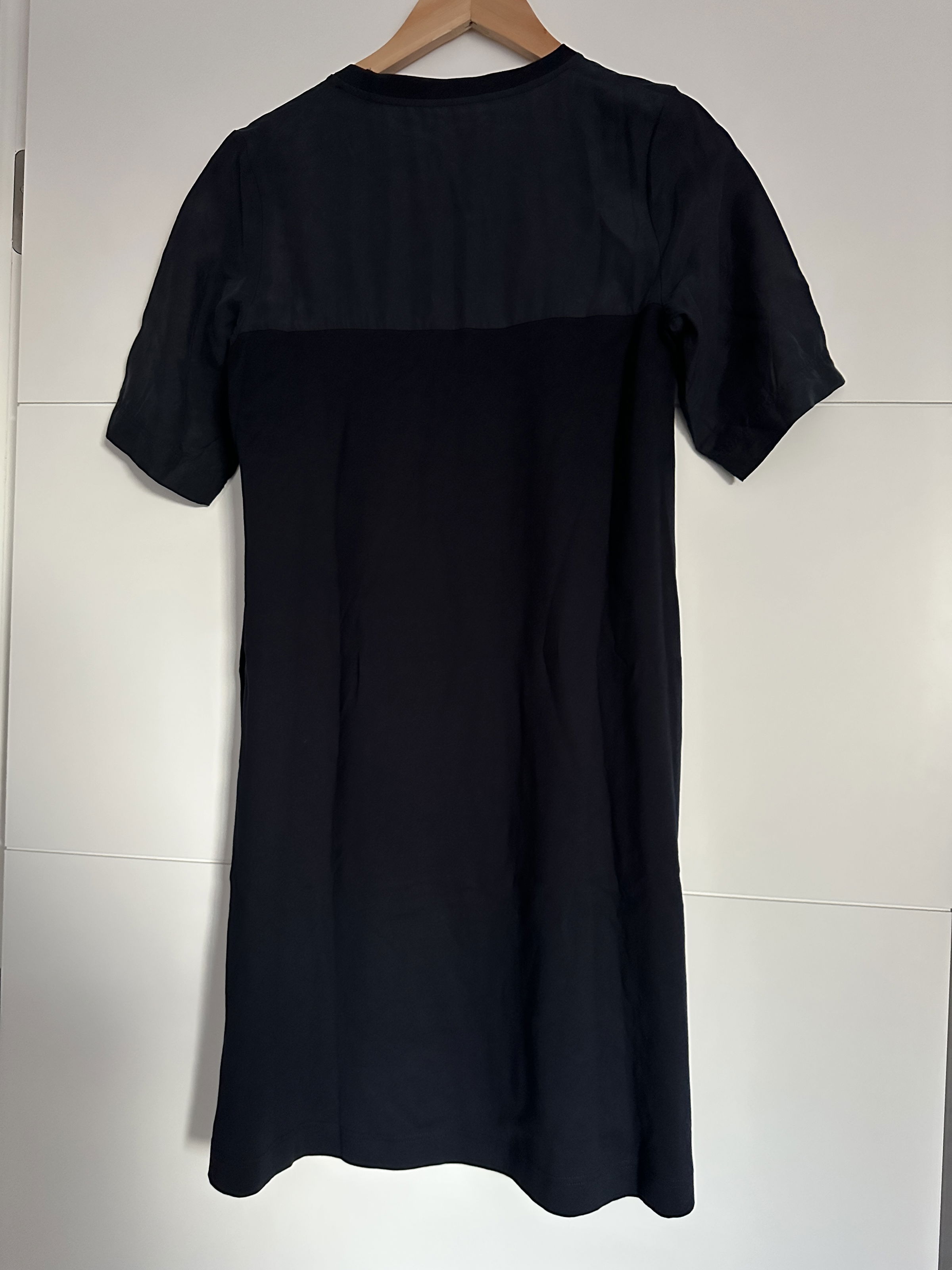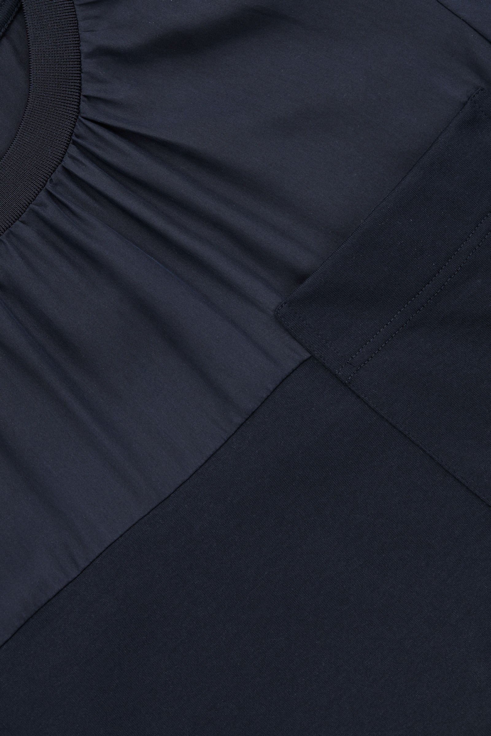 This A-line dress is made from soft pima-cotton jersey with a contrast woven panel and sleeves in smooth mulberry silk. A relaxed, A-line shape, it has a patch pocket and gathered detail at the ribbed neck.