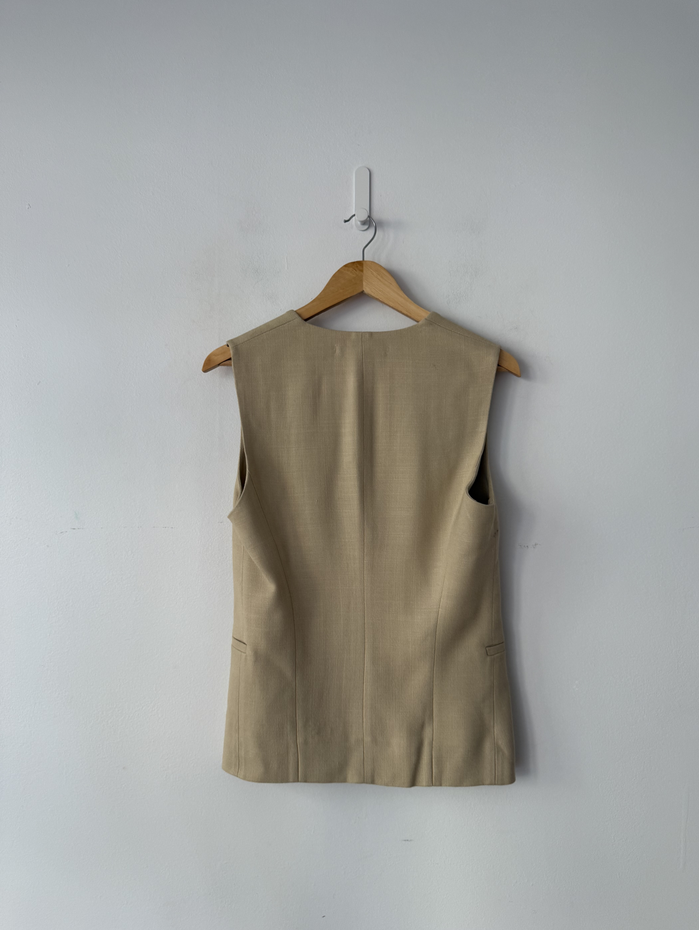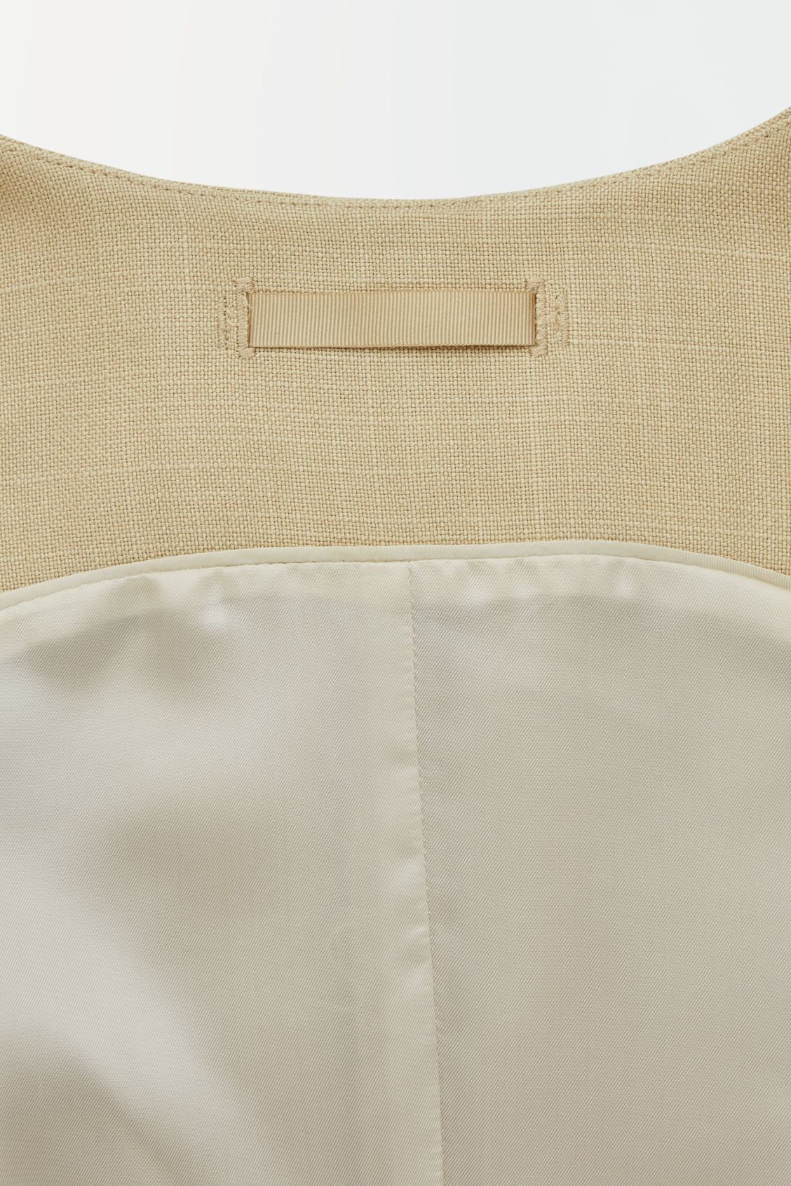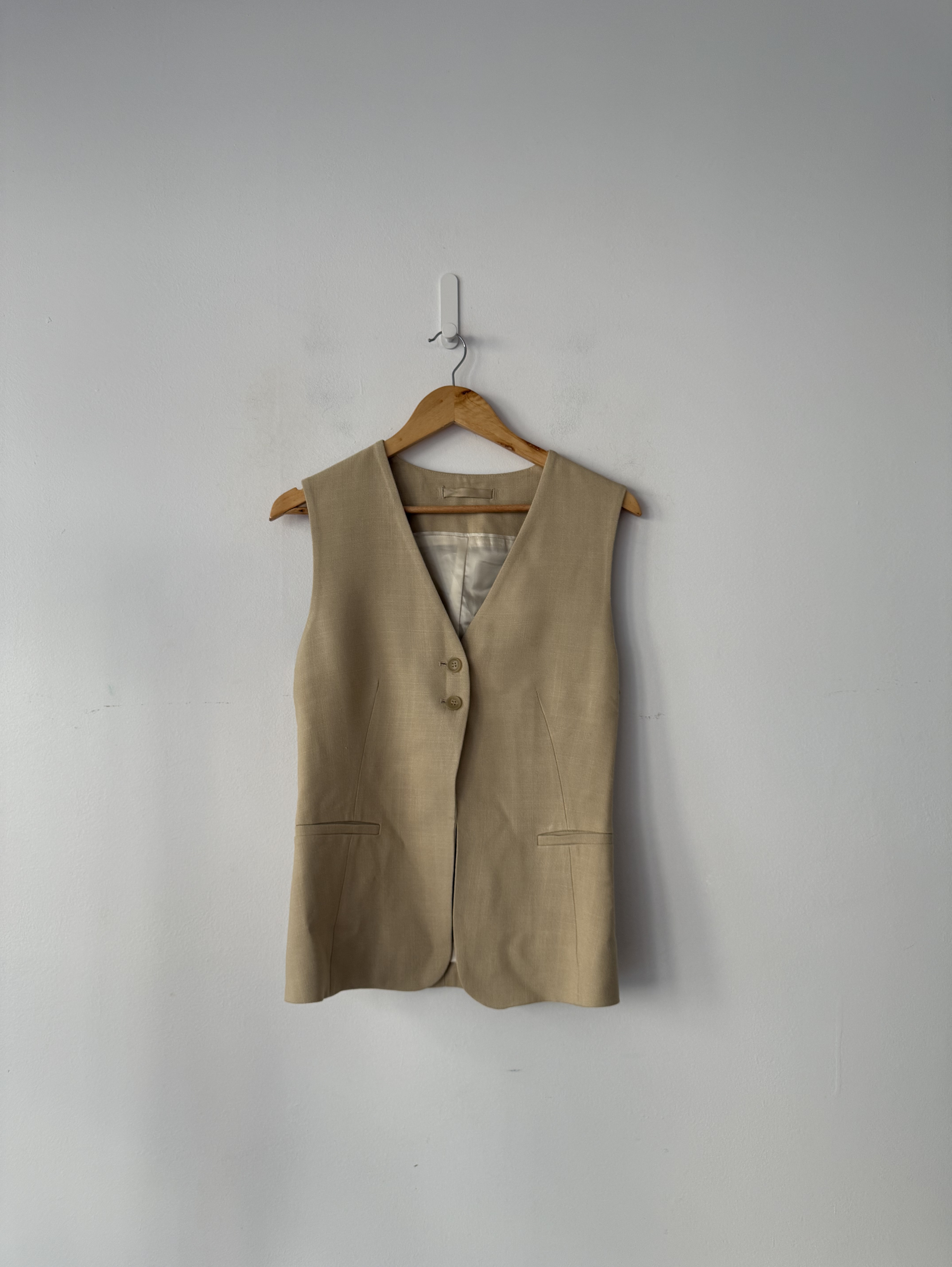 The ATELIER team looked to classic tailoring principles to inform the silhouette of this waistcoat. Expertly tailored in a longline shape that extends past the hips, it nips in with two tonal buttons and has traditional welted pockets and streamlining darts that lend it structure. We handpicked the tightly woven cloth for its subtle texture and beautiful drape. The sandy-beige tone has been precisely colour matched to the blazer, trousers and maxi skirt from the capsule, so it has endless styling potential.