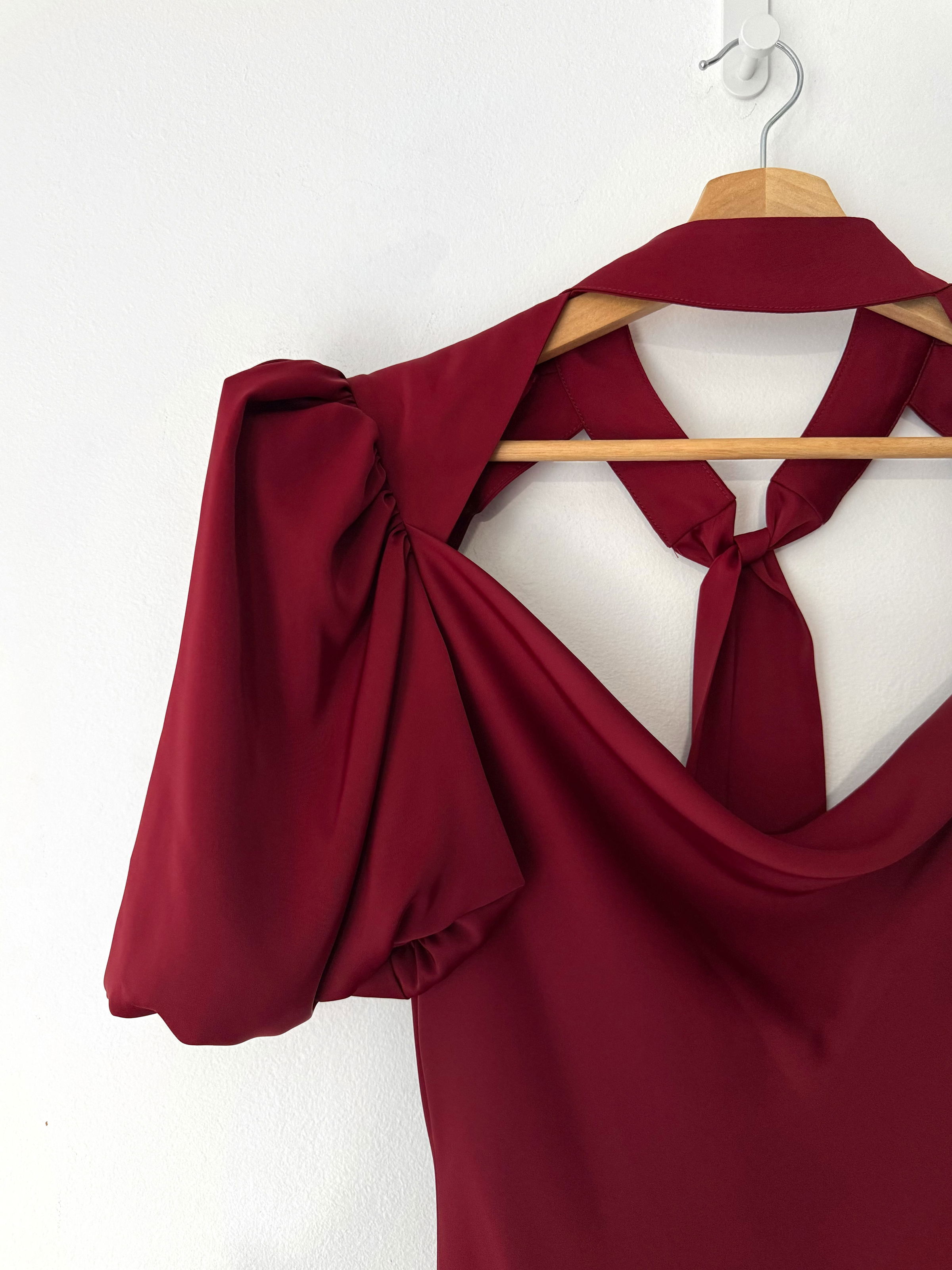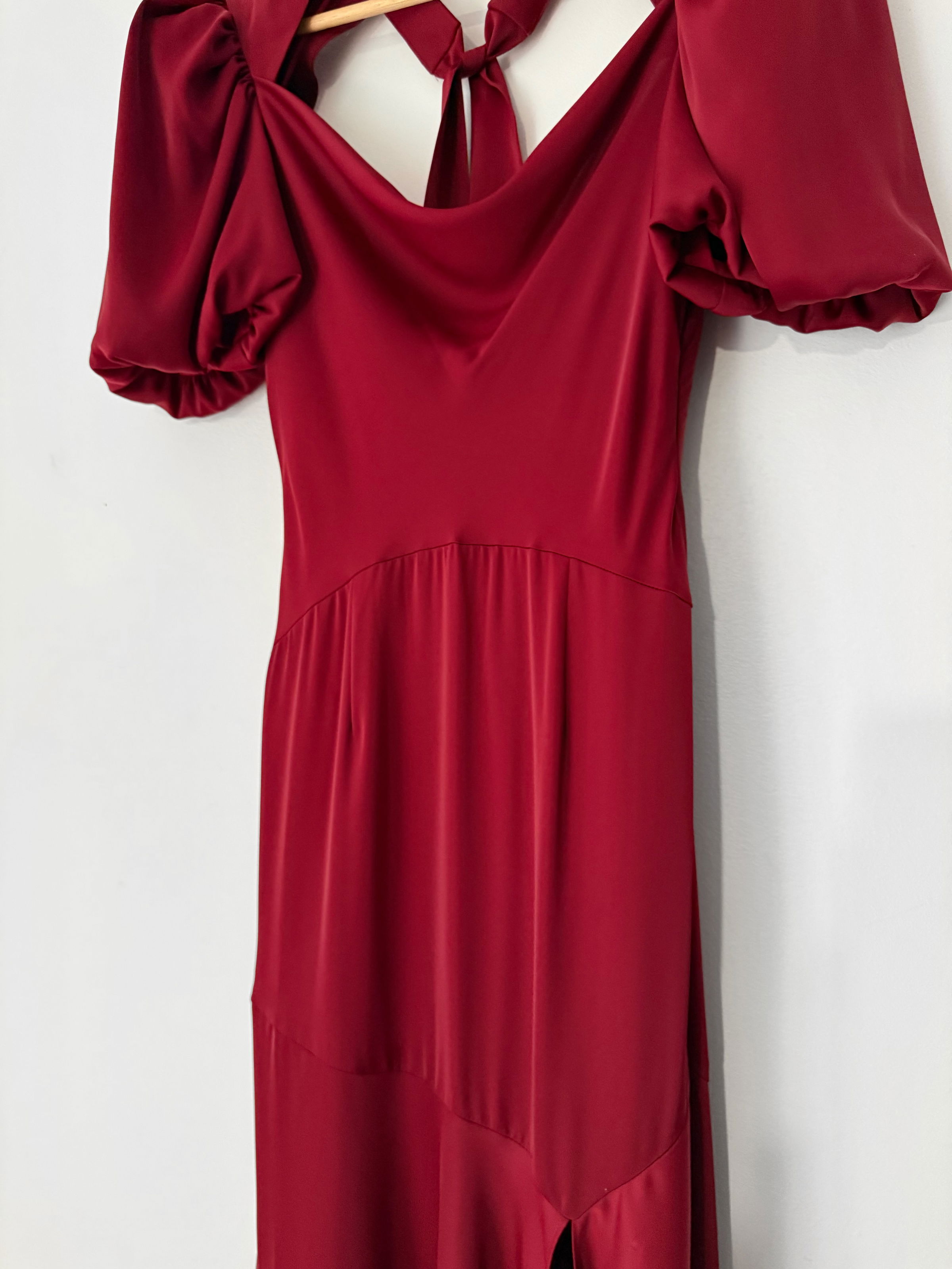 Wine red puff sleeve satin dress in excellent, pre-worn condition. Rear tie fastening, front slit, asymmetric hem, ankle length. Composition: viscose.