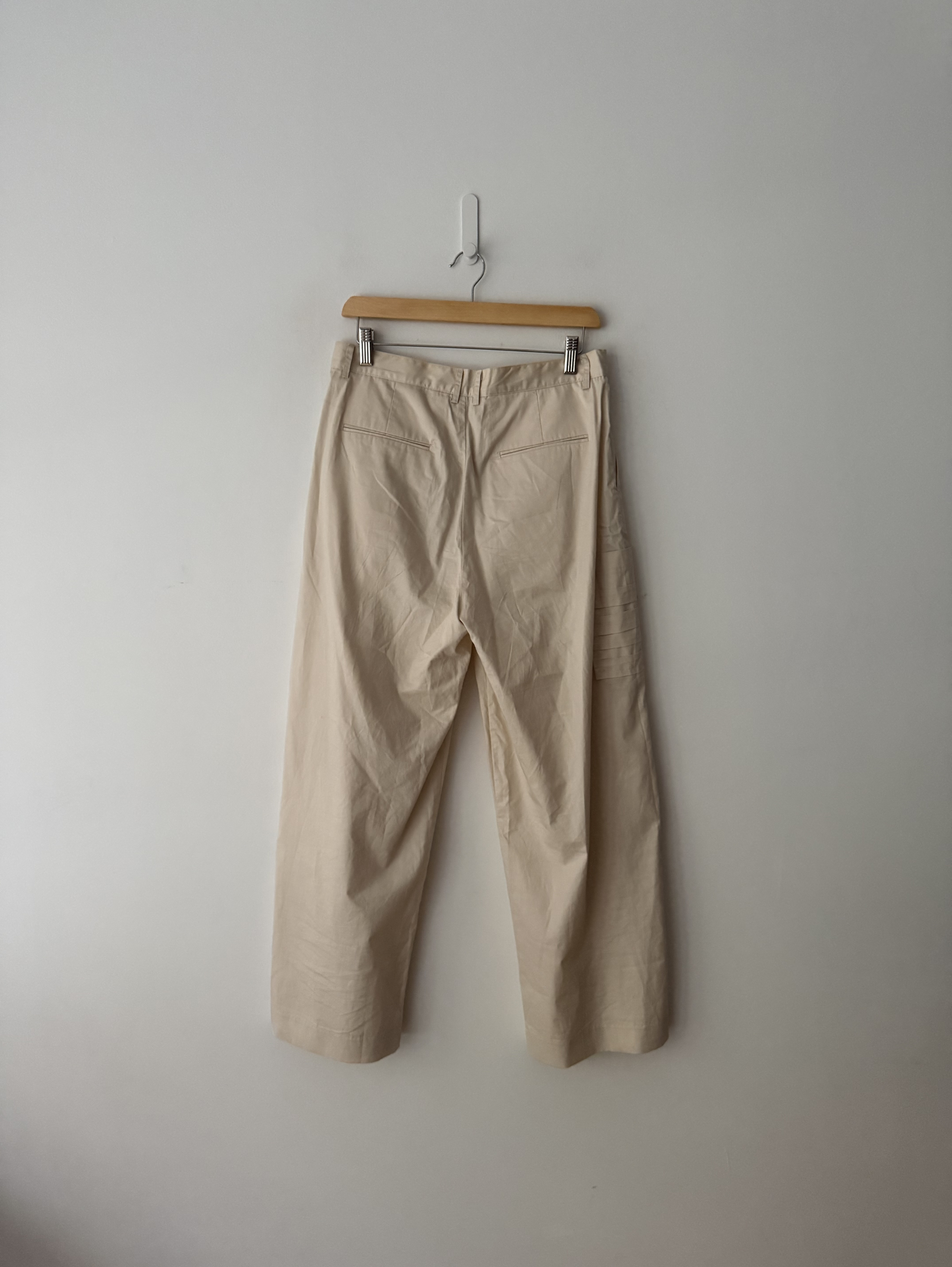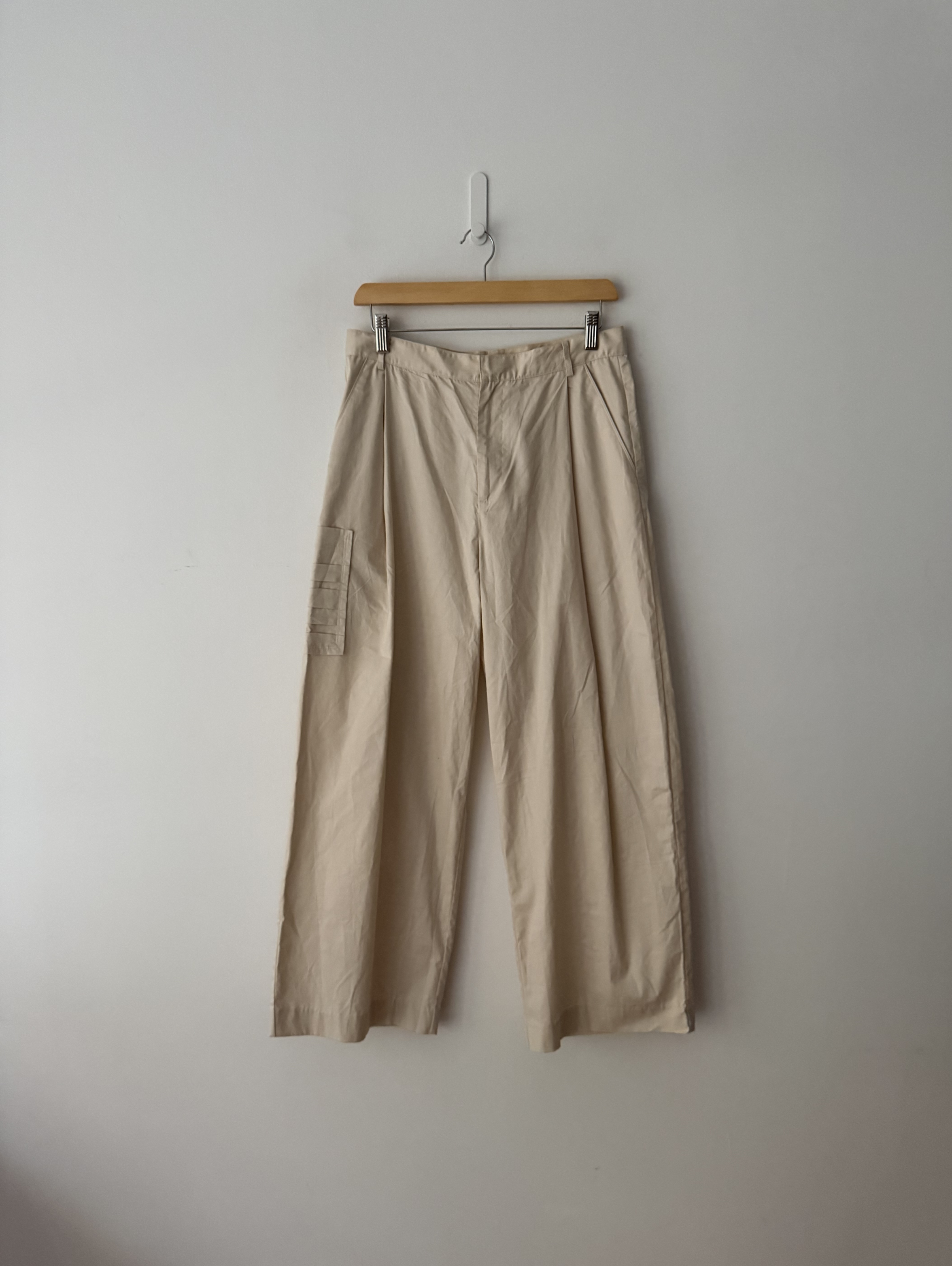 Pleated wide-leg trousers with a side leg pocket. Button and Zip Fly.
