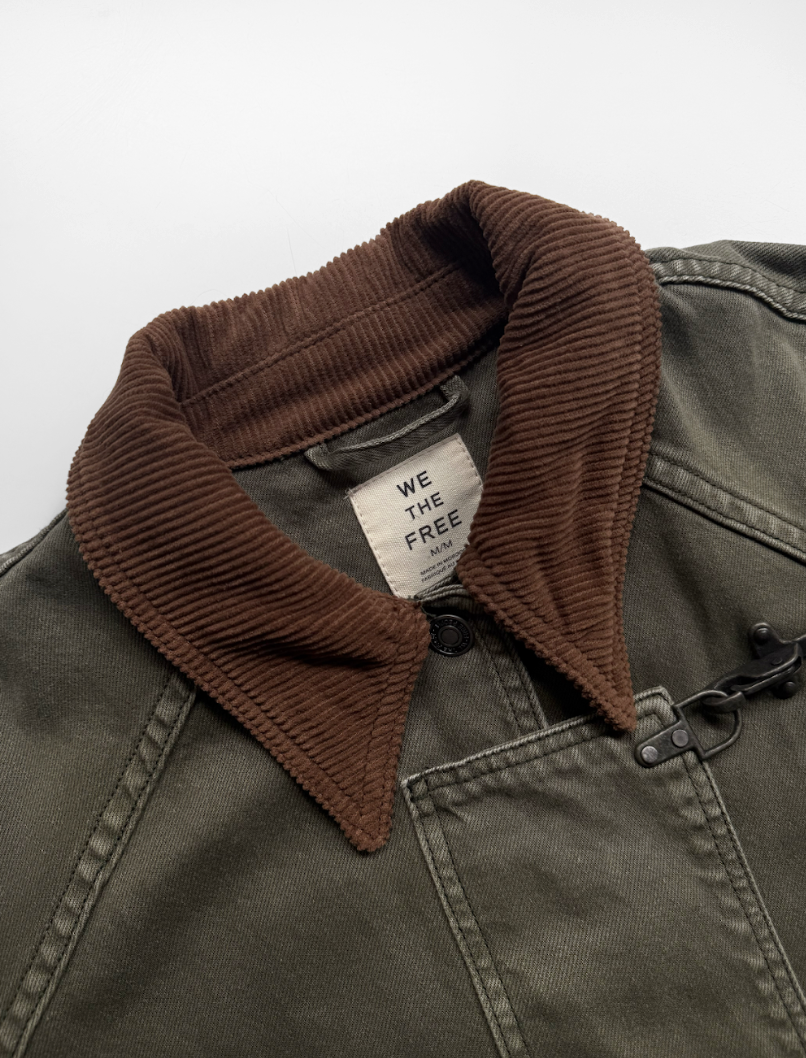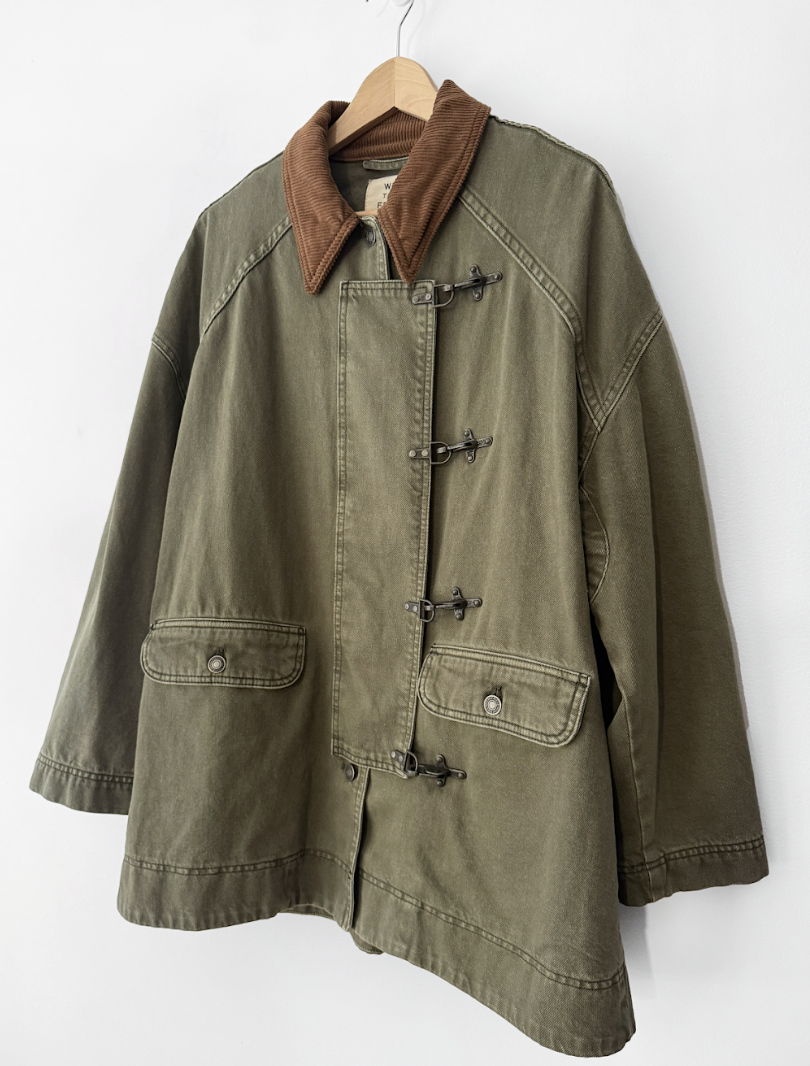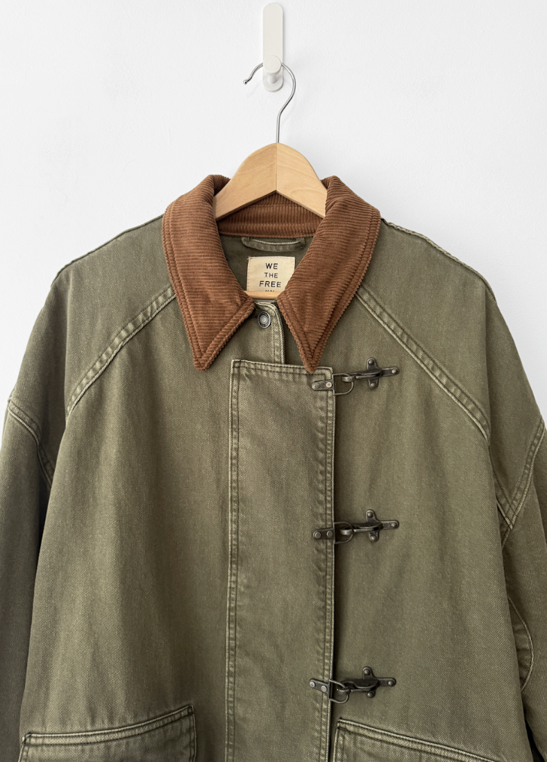 Perfectly combining heritage and utility, this goes-with-anything coat from We The Free is featured in a slightly longline, oversized silhouette with fireman-style hooks and a contrasting corduroy collar for added dimension.