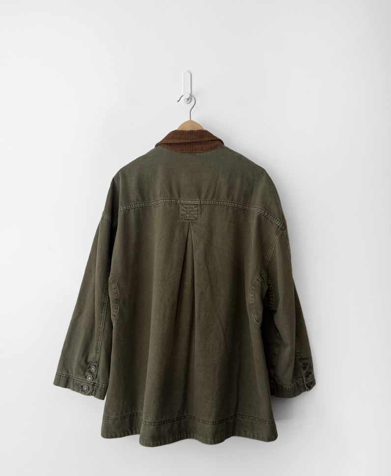 Khaki green denim barn jacket in perfect, never worn condition with corduroy collar. Composition: 100% cotton. Machine wash cold. Original RRP £158.