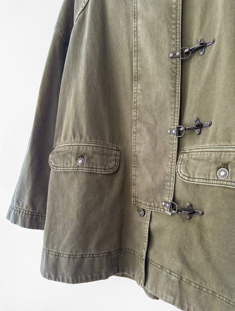 Fit: Relaxed, oversized Features: Denim fabrication, cord collar, button-front closure, fireman-style hook accents, flap pockets, dropped shoulders, back pleat.