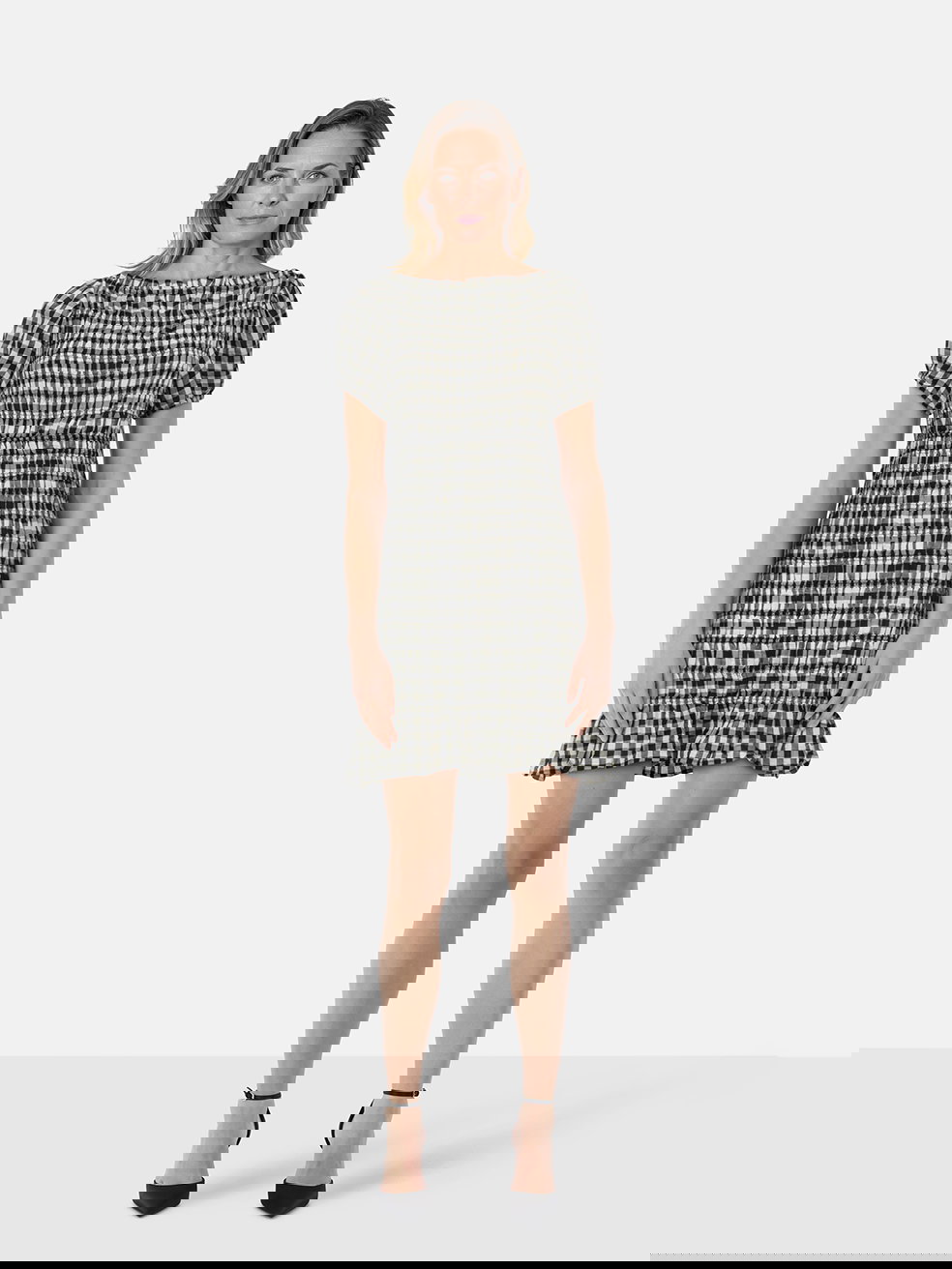 DÔEN's 'Rizzo' dress is shirred throughout the bodice, subtly warping the classic gingham pattern into something more abstract. It's made from breathable voile and has an elegant bateau neckline framed by puffed sleeves. Style yours with sandals and a swipe of red lipstick.