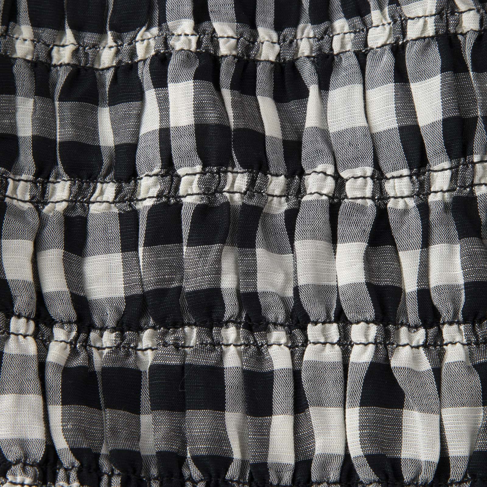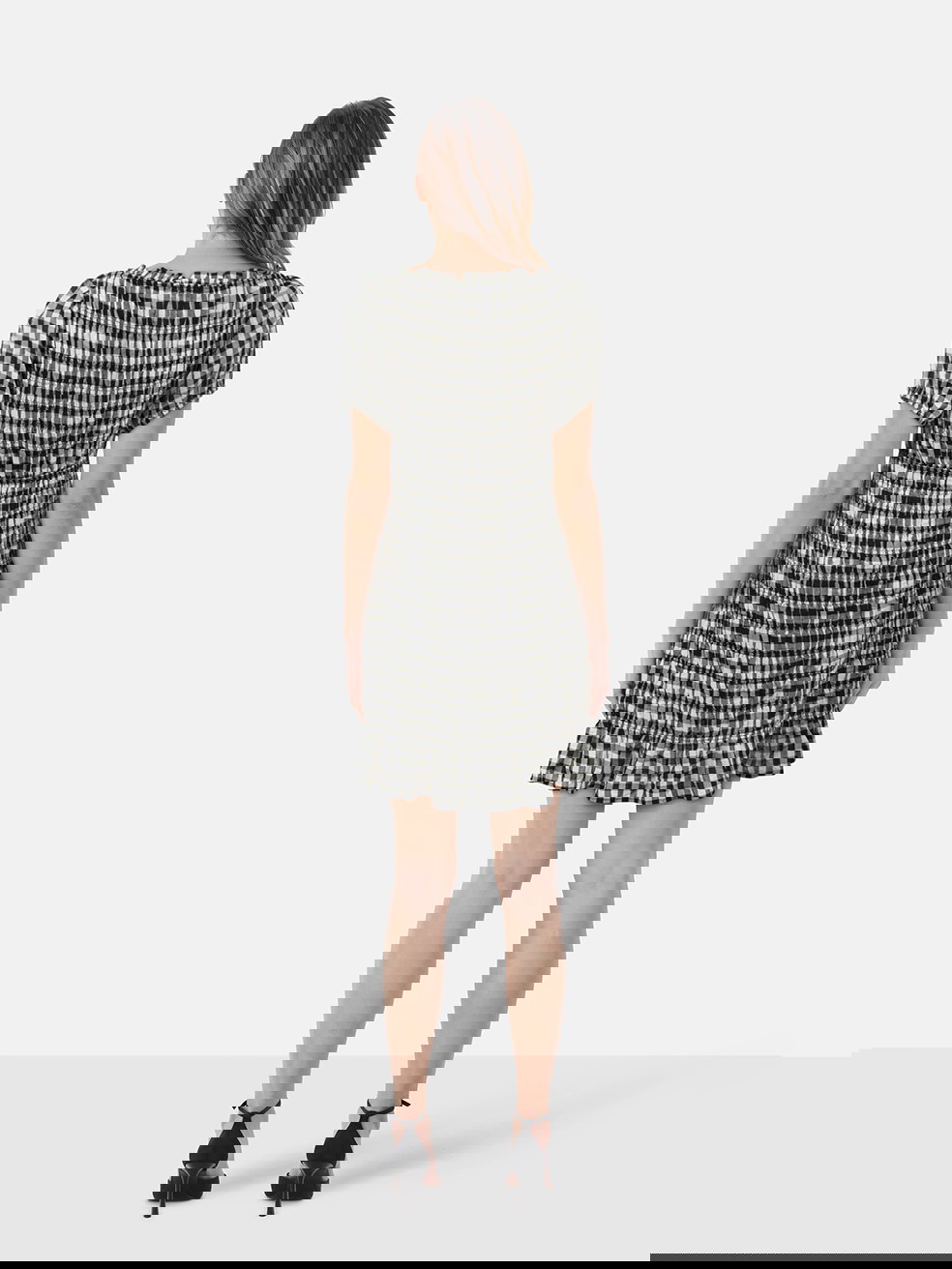 Black and white gingham ruched mini dress in excellent, pre-loved condition. Composition: 70% Rayon, 30% Linen. Measurements: Shoulder: 35 cm, Sleeve Length: 20 cm, Elasticated Bust: 41 cm, Elasticated Waist: 38 cm, Elasticated Hip: 50 cm, Length: 85 cm.