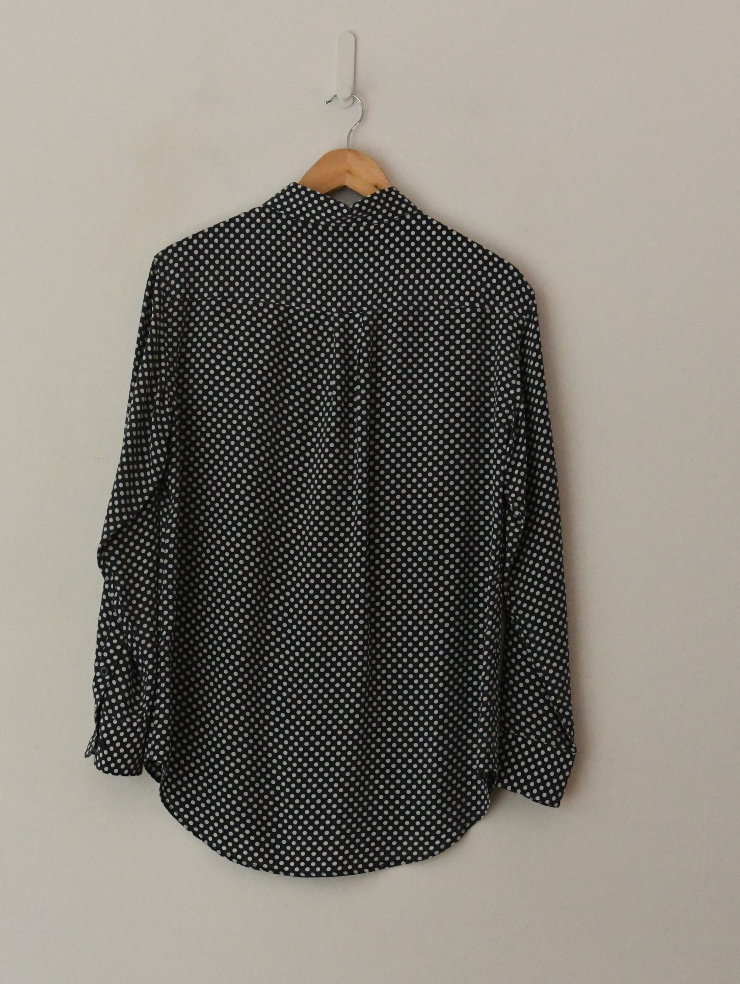 Polka-dot, button through, cuffed long sleeves, with two breast pockets. 100% Silk. Dry Clean Only.