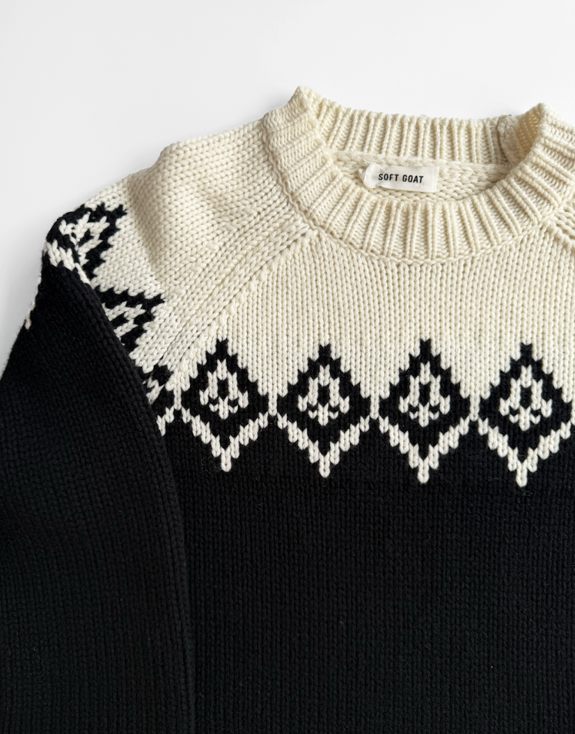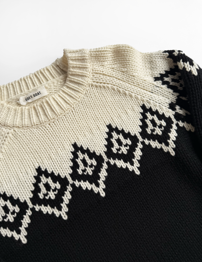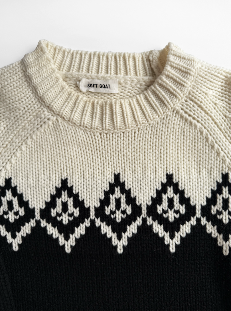 Black and white, jacquard knit Fair Isle jumper in perfect, never worn condition. Composition: 70% wool, 30% cashmere. Dry clean only.