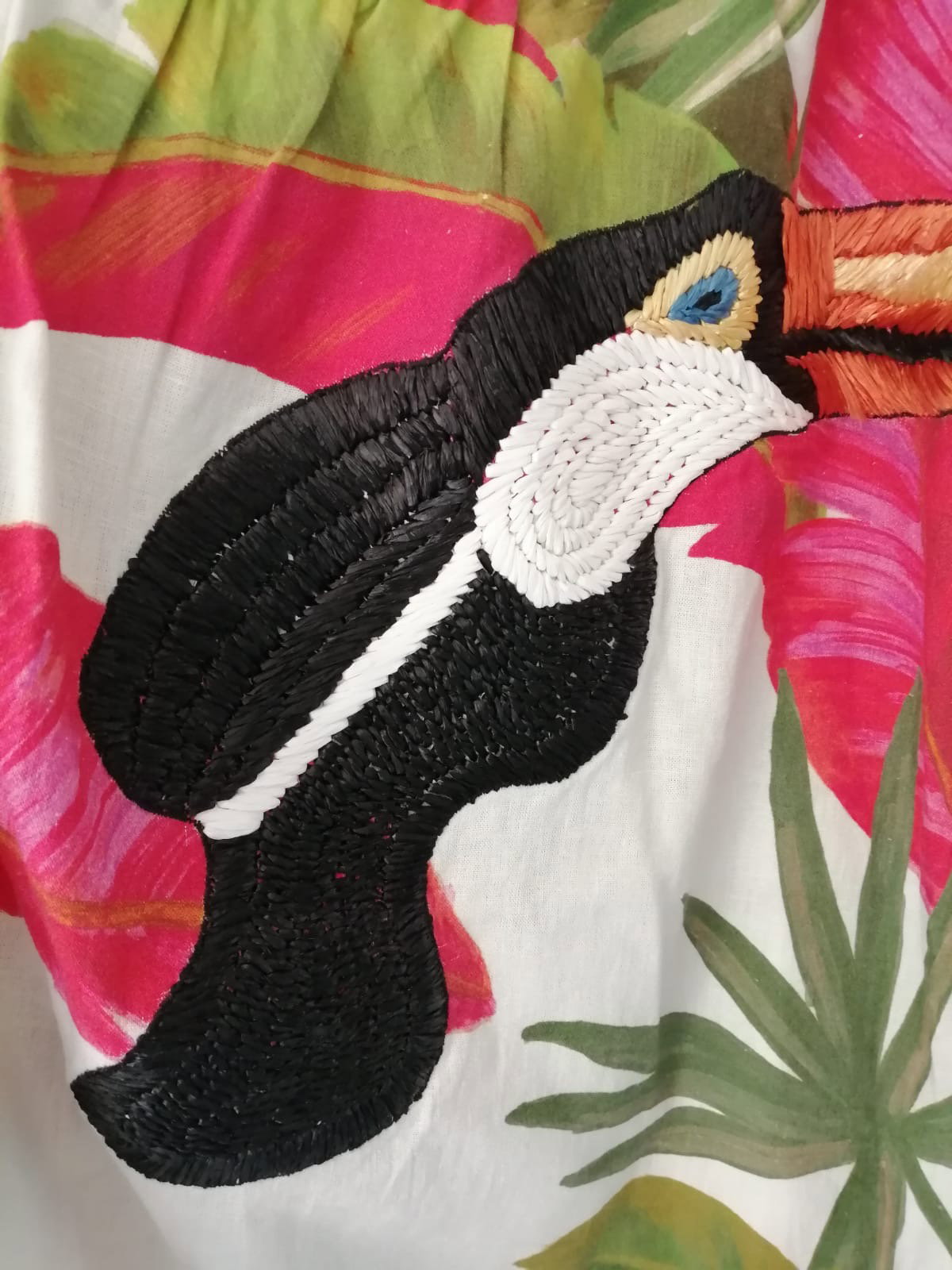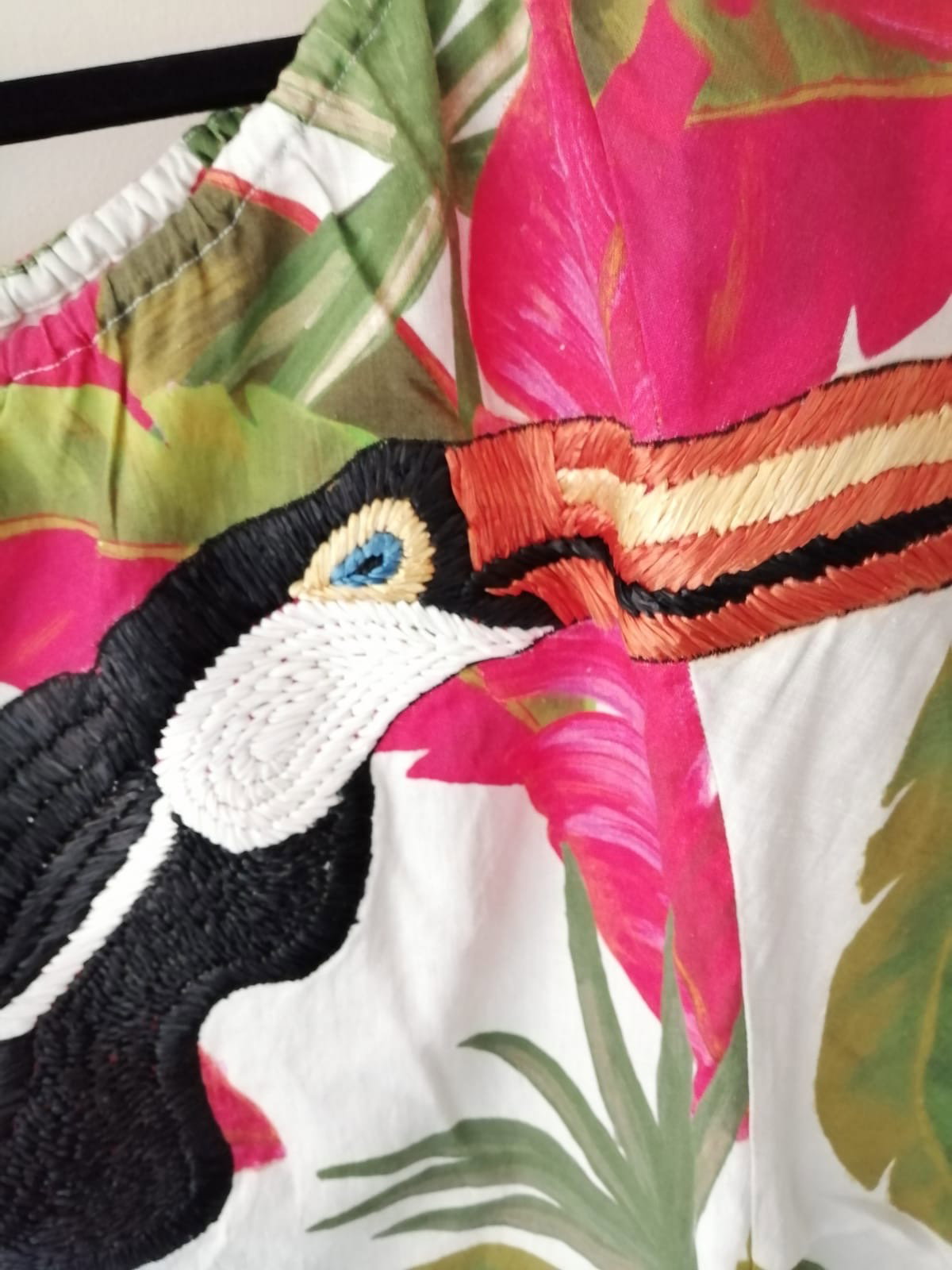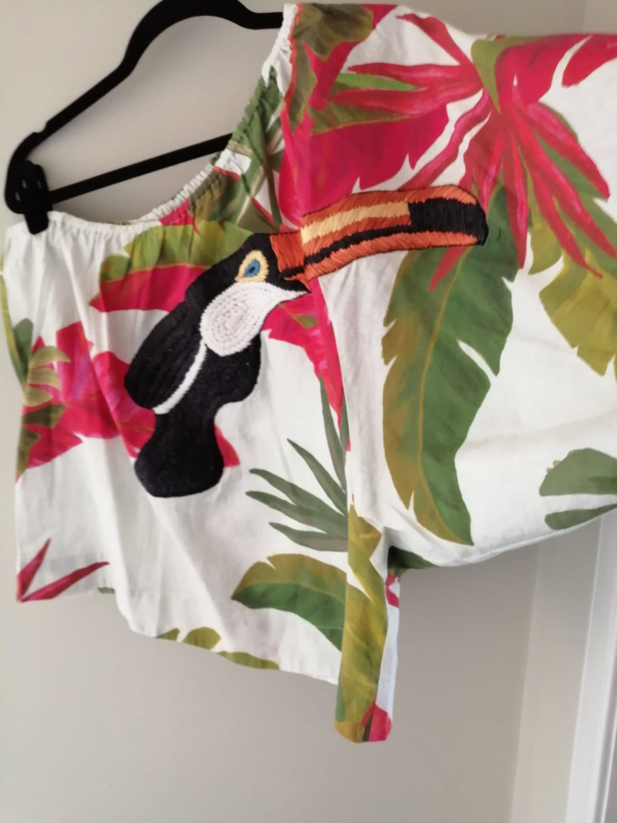 One shouldered embroidered toucan linen-mix blouse. Elasticated cuff and slip-on design.