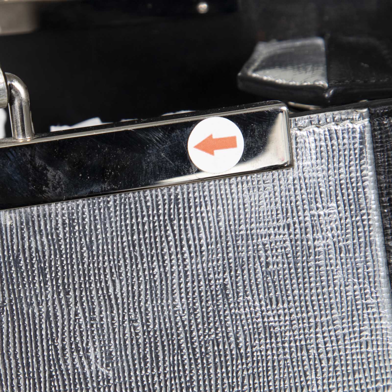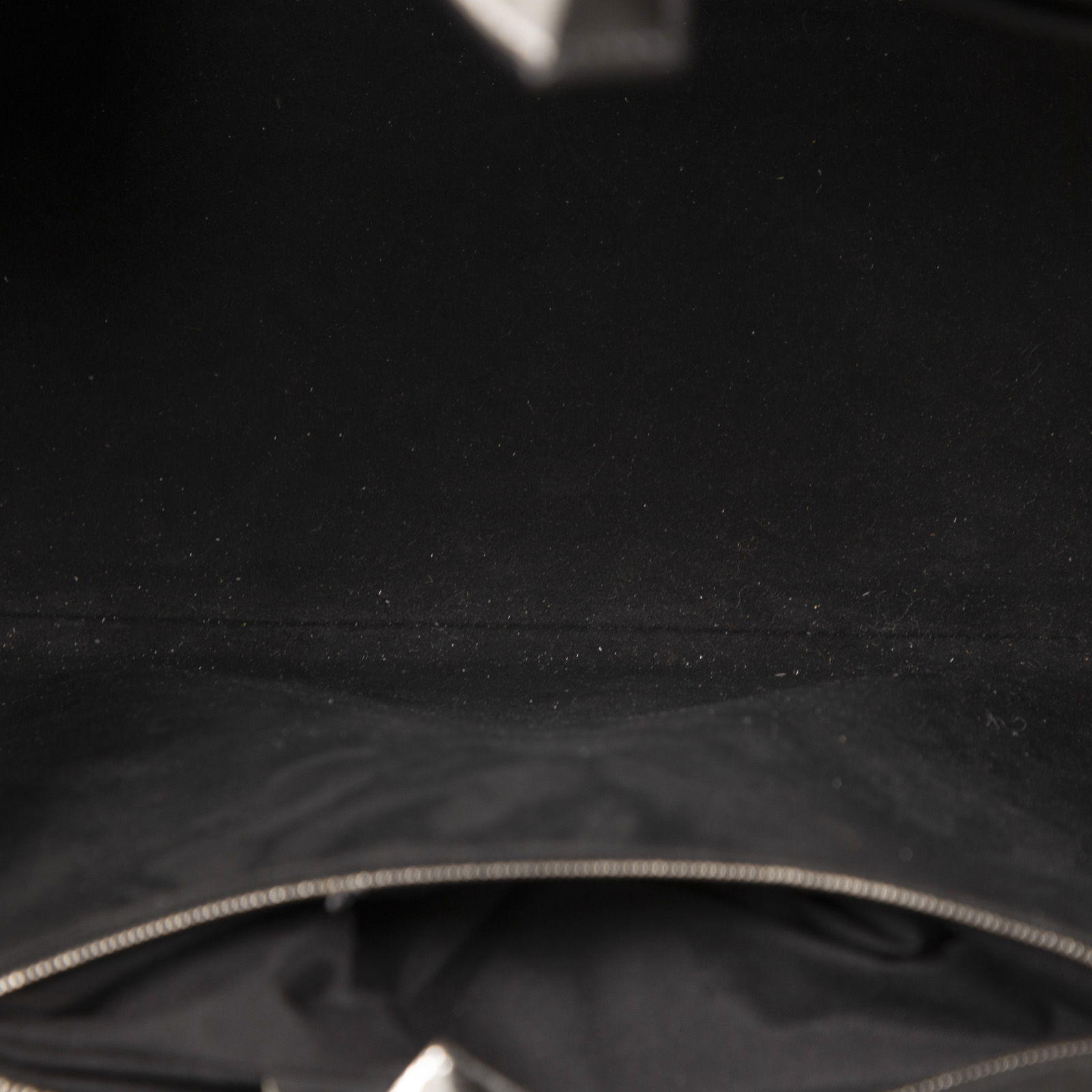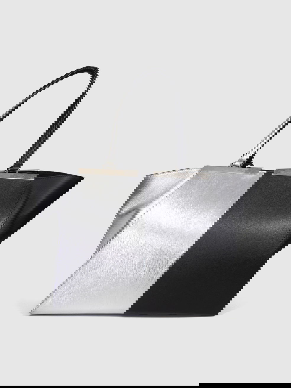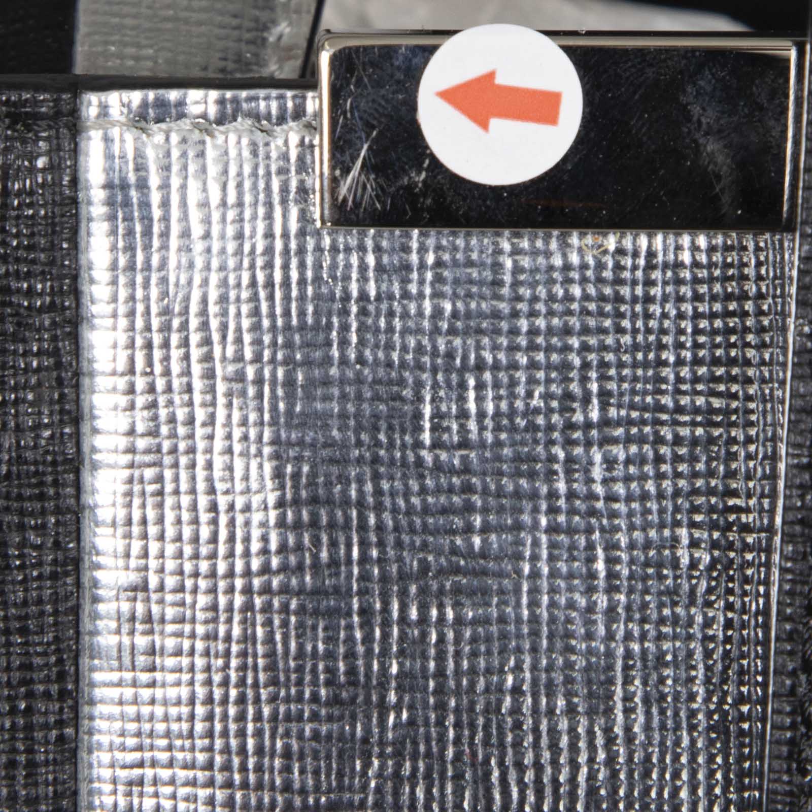 Black and silver leather tote bag in excellent, pre-worn condition. See images for signs of wear. Main compartment with snap button fastening, two internal slip pockets, one internal zip pocket. Composition: leather, interior: suede. Height: 30cm, width: 36cm, depth: 17cm, handle height: 17cm.