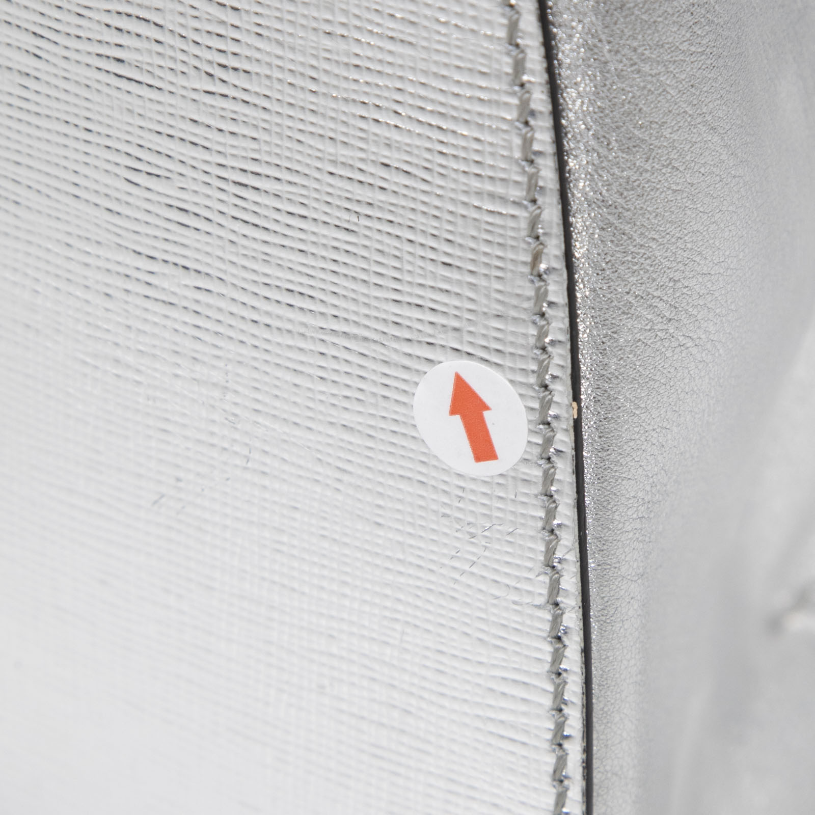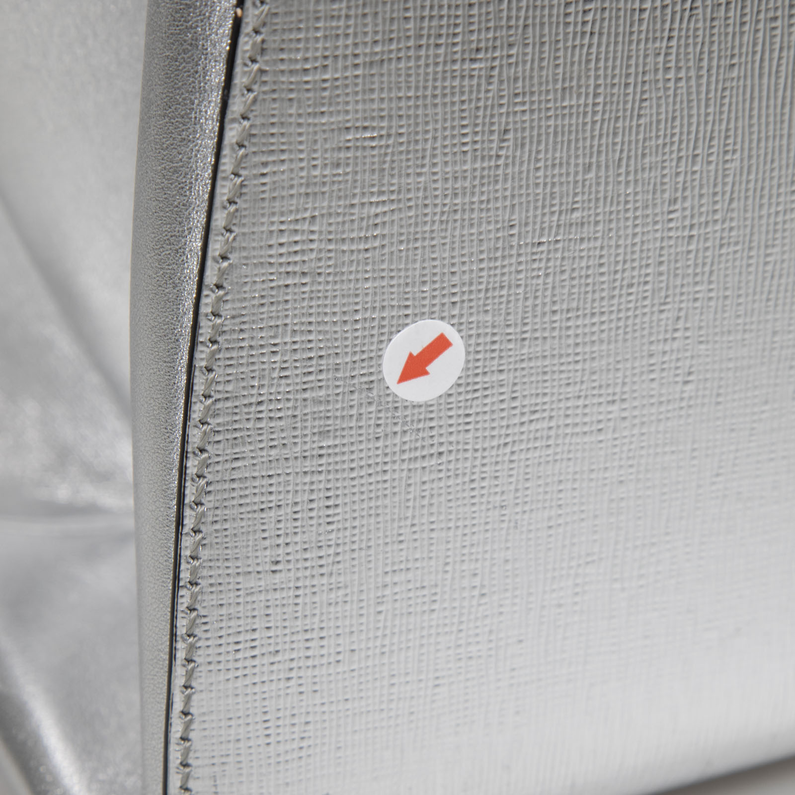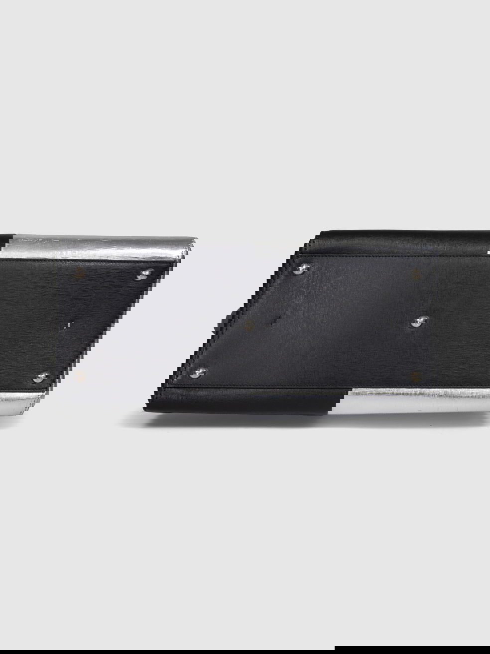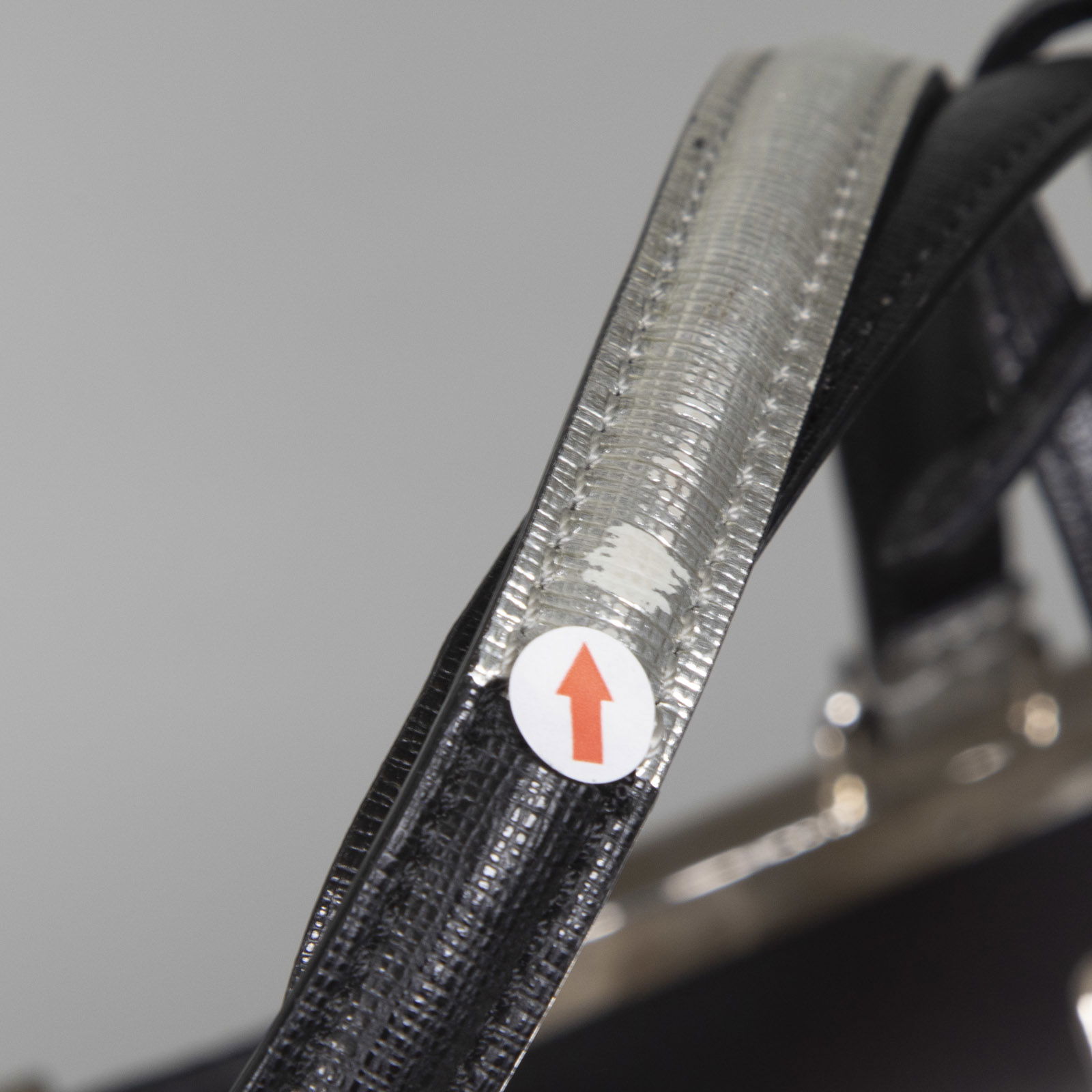 Black and silver leather tote bag in excellent, pre-worn condition. See images for signs of wear. Main compartment with snap button fastening, two internal slip pockets, one internal zip pocket. Composition: leather, interior: suede. Height: 30cm, width: 36cm, depth: 17cm, handle height: 17cm.