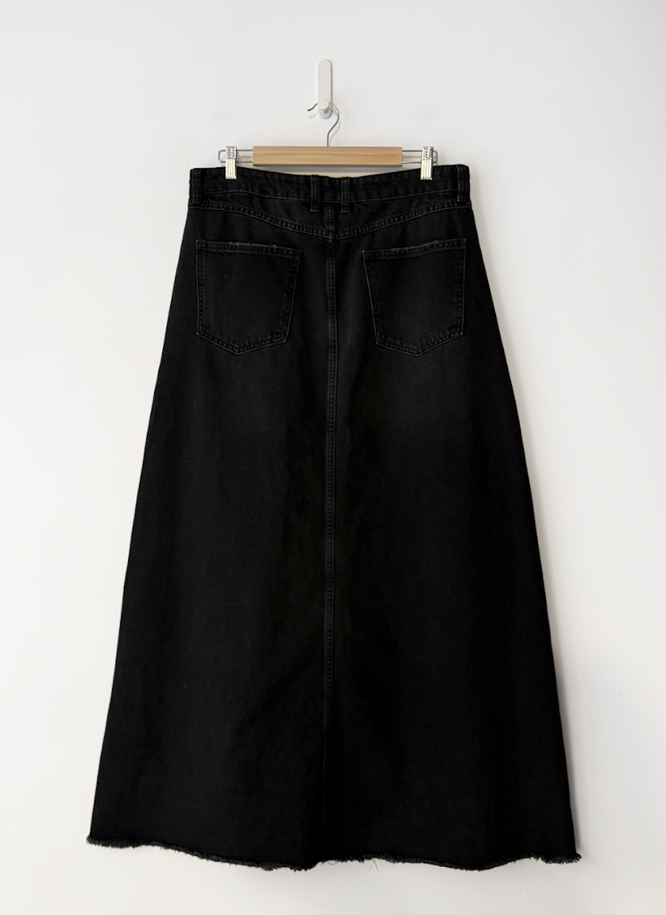 Black mid-rise, A-line silhouette, rigid denim skirt in perfect, never-worn condition. Zip fly and button closure, four-pocket design, inverted yoke seam at front, raw-edge hem. Composition: 100% cotton. Machine wash cold.