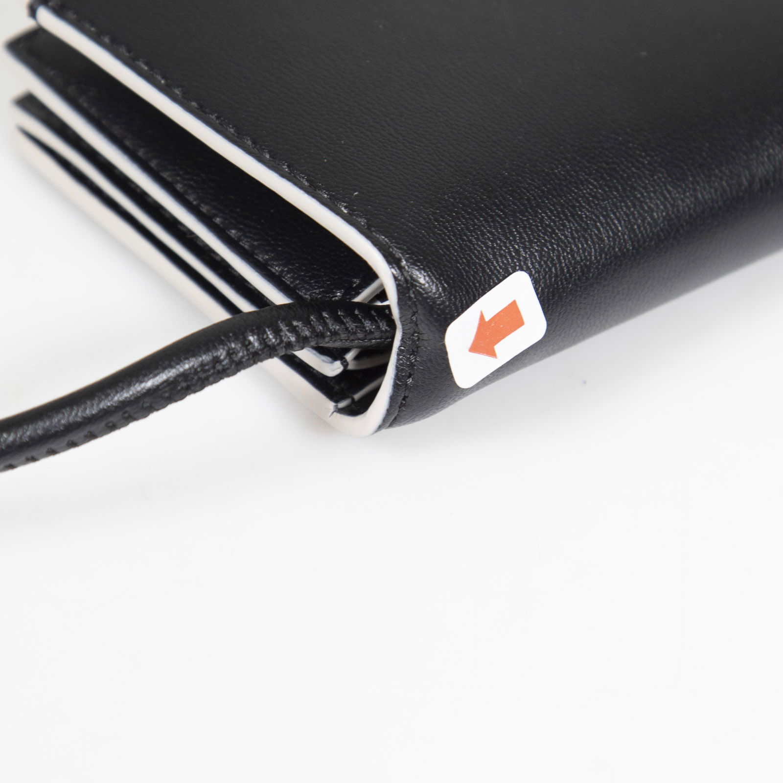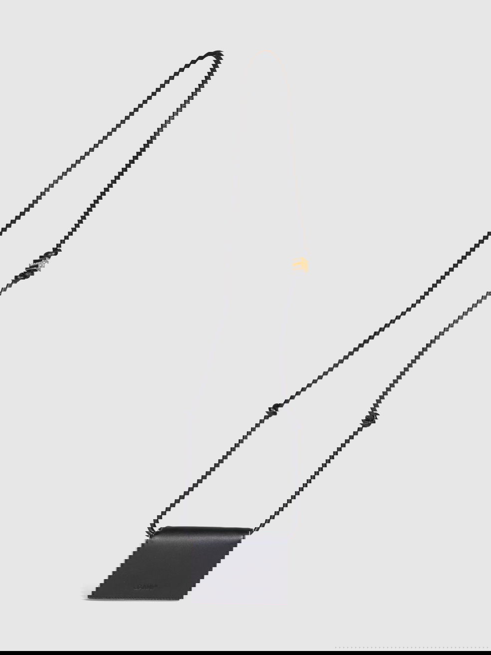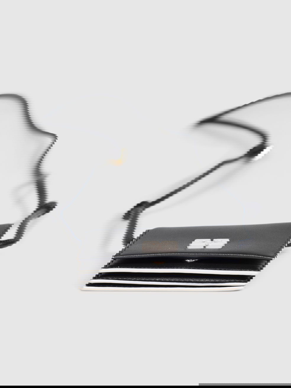Black leather card holder with strap, in excellent, pre-worn condition. See images for signs of wear. Flap with snap button. Three compartments. Composition: 100% leather. Height: 7cm, width: 10cm, depth: 2cm, shoulder strap: 50cm.